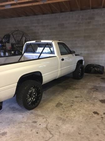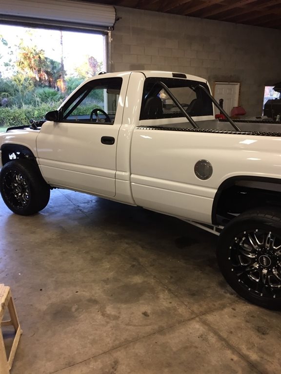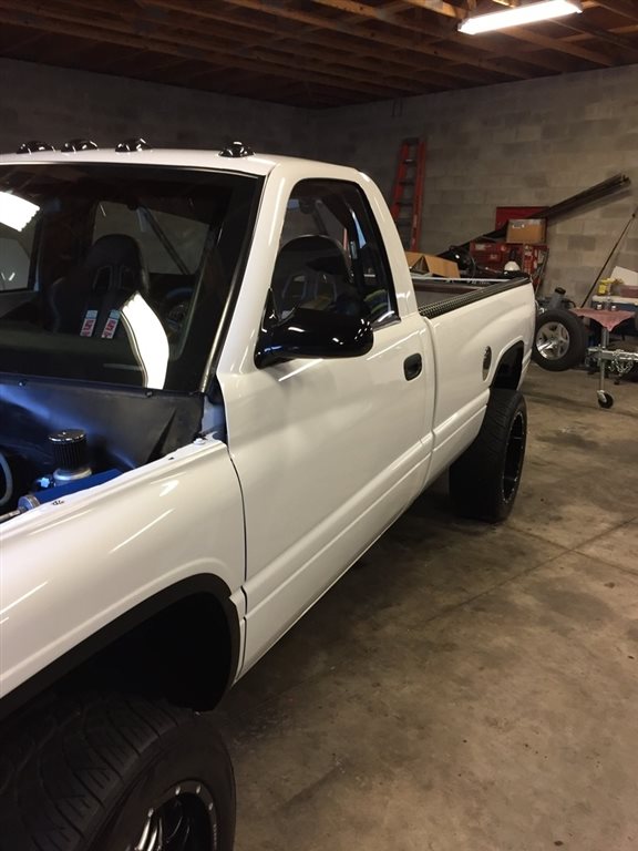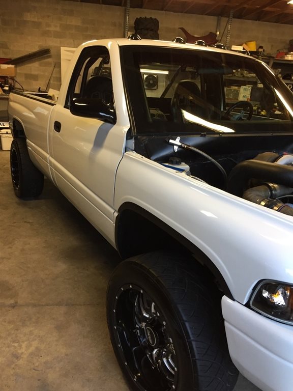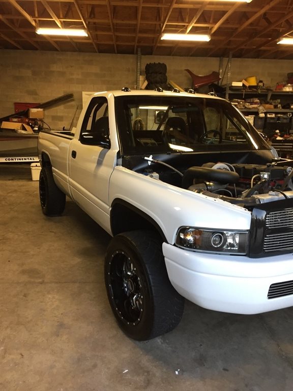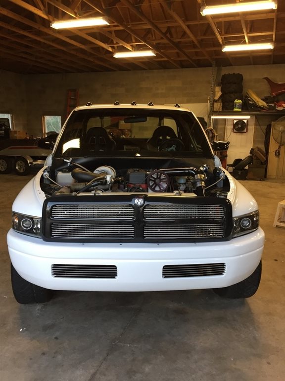 2002 Dodge RAM 4X4 Diesel Prostreet Drag Truck is shown in a White exterior with Black interior. It is powered by a 5.9L Inline 6 Cummins Diesel engine paired with an automatic transmission. This is a non-smoking vehicle that has had no pets inside and has always been garage kept.