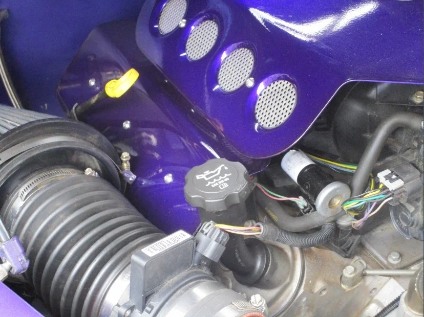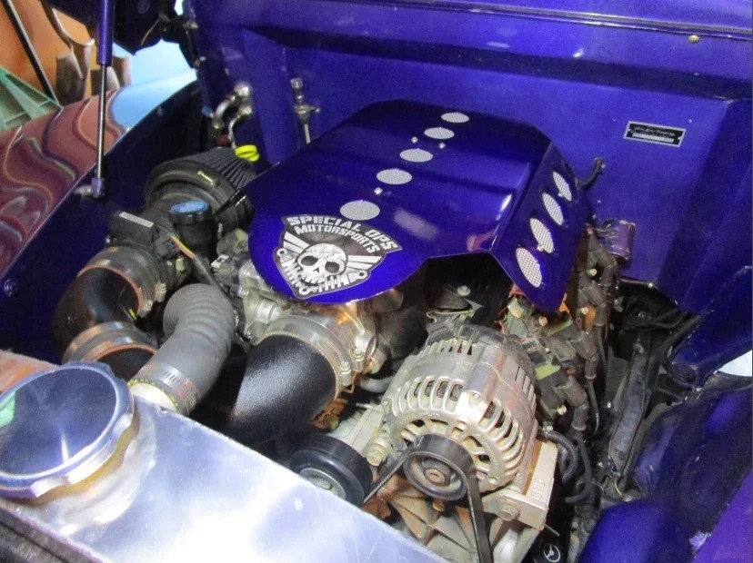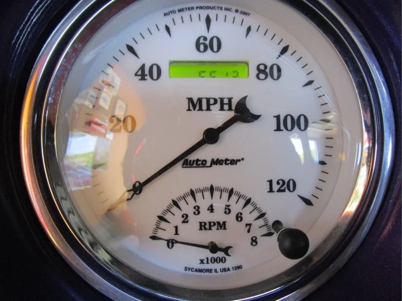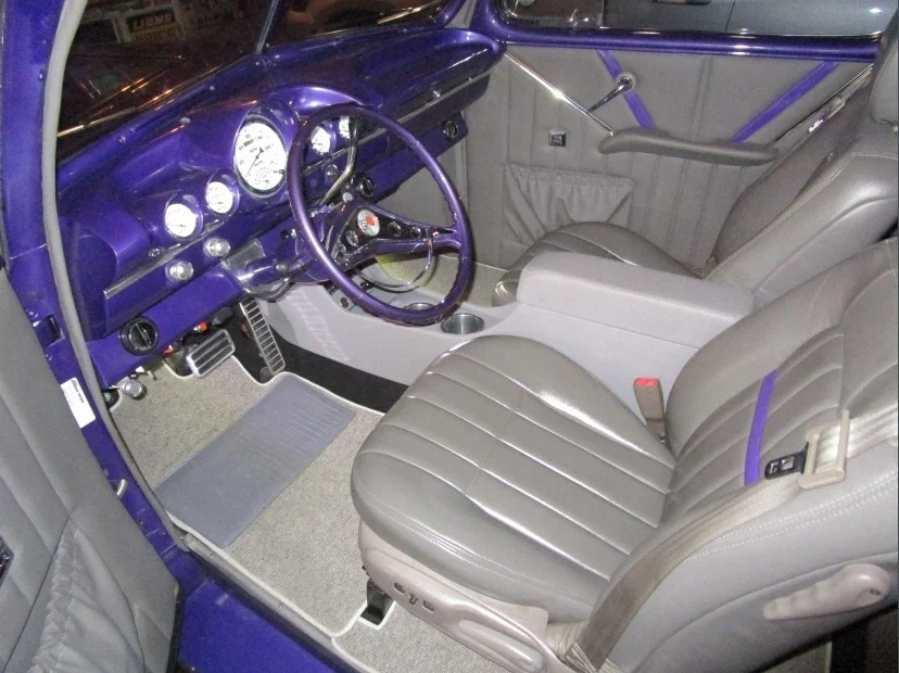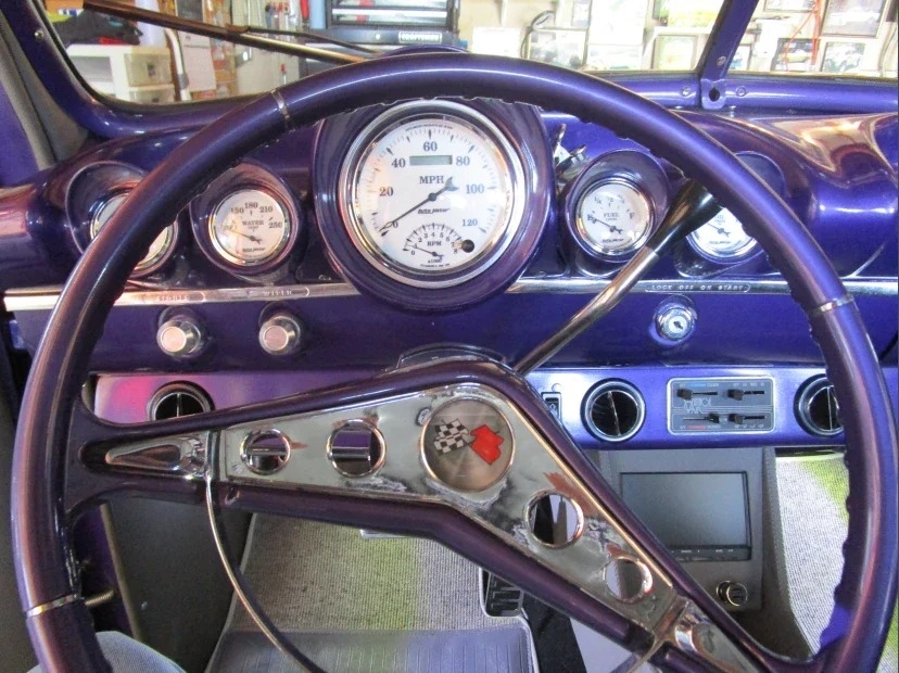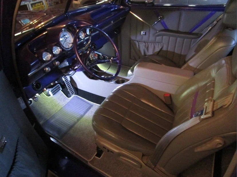 “Front bumper has been narrowed and tucked. Turn signals have been relocated to the grill. The headlights are frenched. The rear bumper was removed, and taillights and license plate frenched into custom pan. The trunk handle removed and is opened by an actuator. Fender spears removed as is hood ornament. Paint is a few years old but in very good condition Interior dash and steering wheel are from a 60 Chevy. Auto Meter gauges. AC. PW. PS. No radio. The center console has a backup camera and cup holders. Power driver’s seat. The rear bench seat has storage underneath. The engine is a 5.3 Vortec out of a 2010 Tahoe that had low miles. Custom engine and coil cover. Trans is a 6L80 from the same Tahoe. I believe the rear end is also, but not sure. Has 4-wheel disc brakes. Battery is relocated to trunk. The car is a very good driver in very good condition. I bought the car from a widow who did not have a lot of information. Her husband had built it for the Hot Rod Power Tour.”