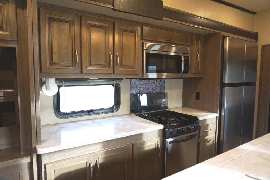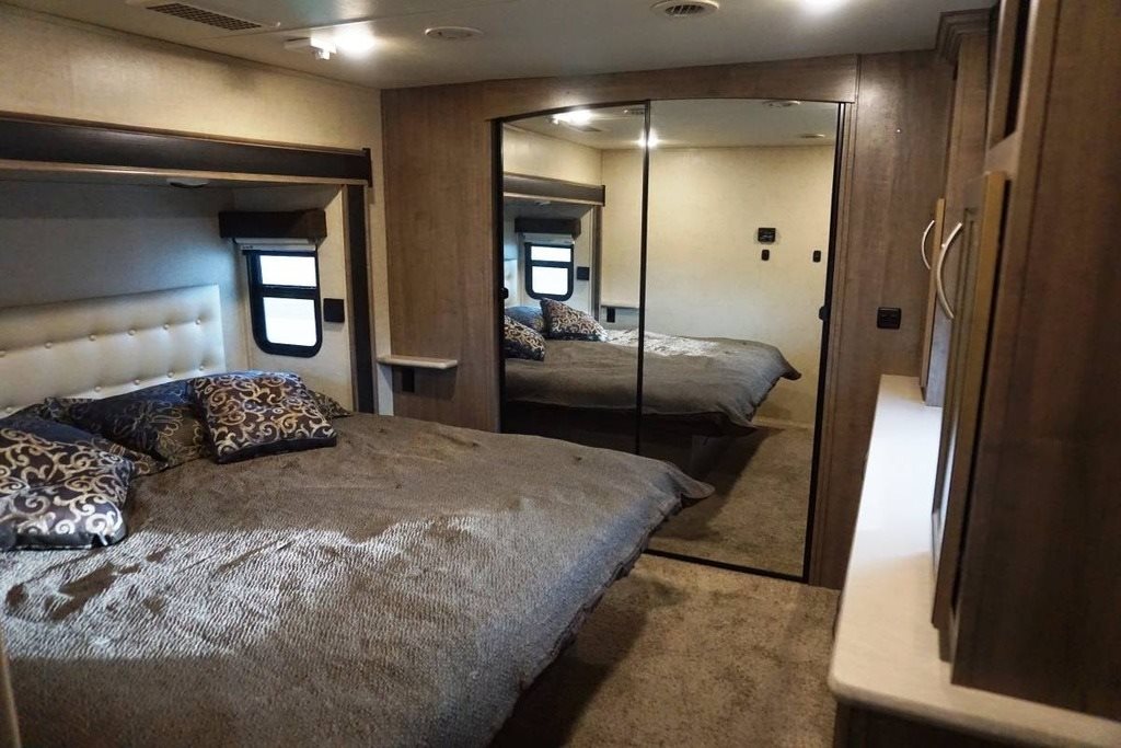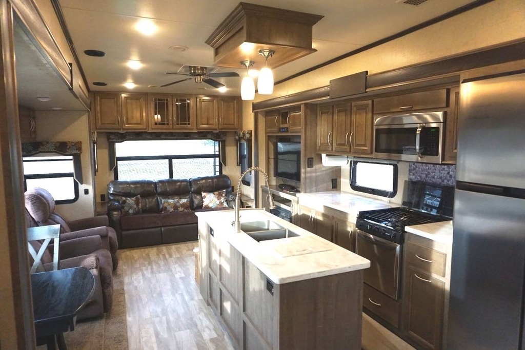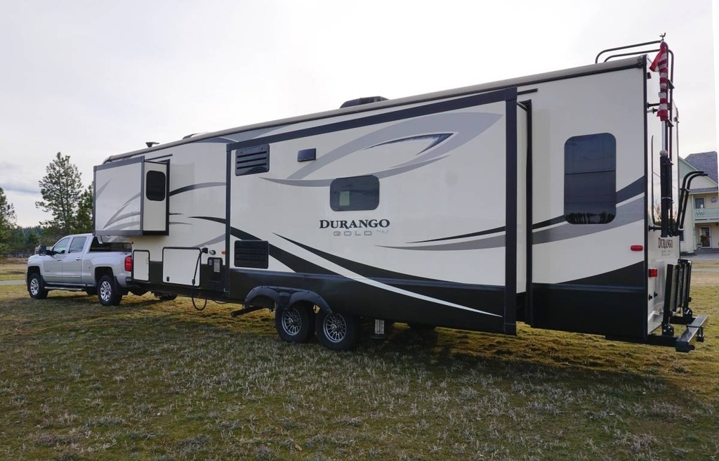 This 2017 Durango Gold, Four Season, Luxury Fifth Wheel has an overall length of 39.5 feet and comes equipped with an 3 Slide Outs, 2 A/C units, 2 Lighted Awnings, ample interior/exterior storage, and sleeps 4 comfortably.