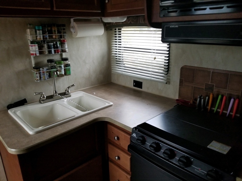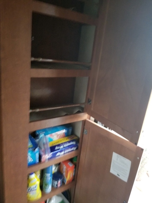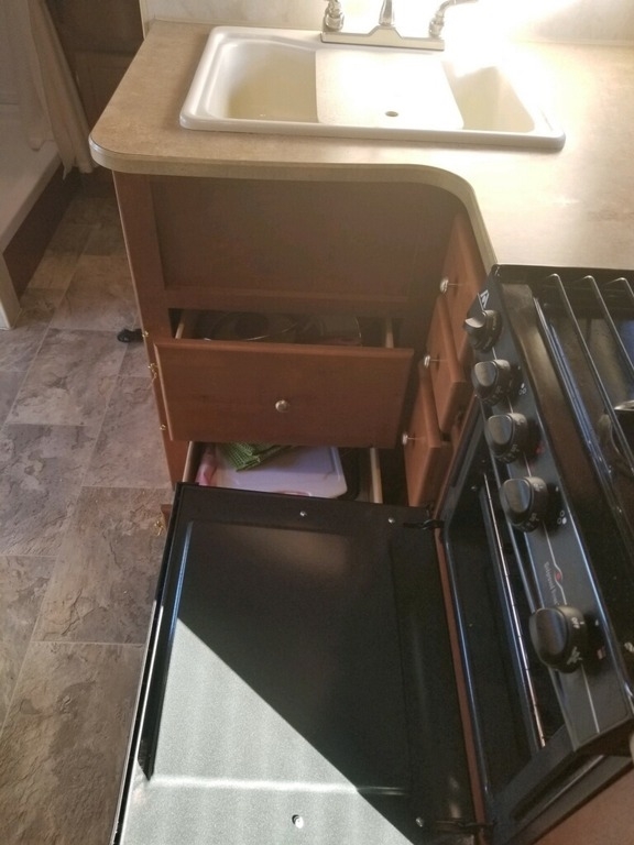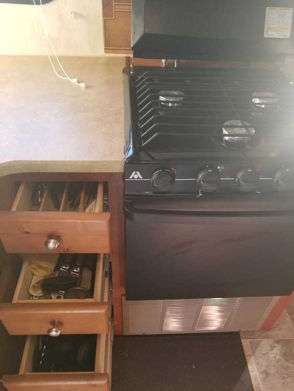 All the stuff in the pictured drawers and storage goes with it, all the kitchen dishes, pots and pans, bake pans, flatware, kitchen utensils, and cleaning gear