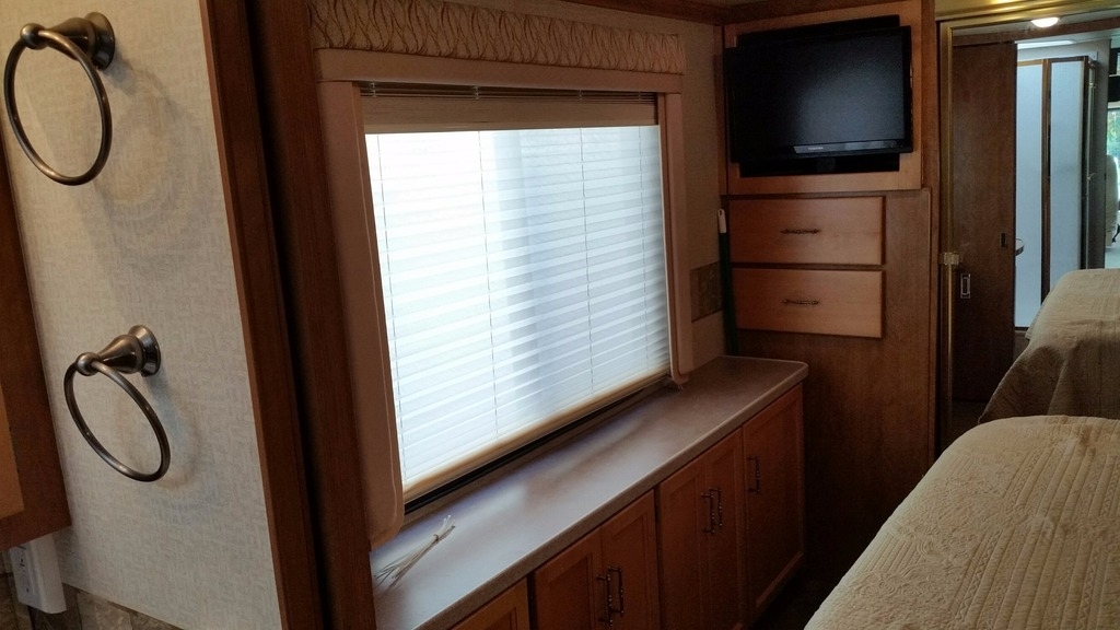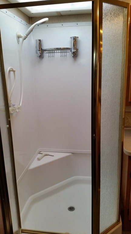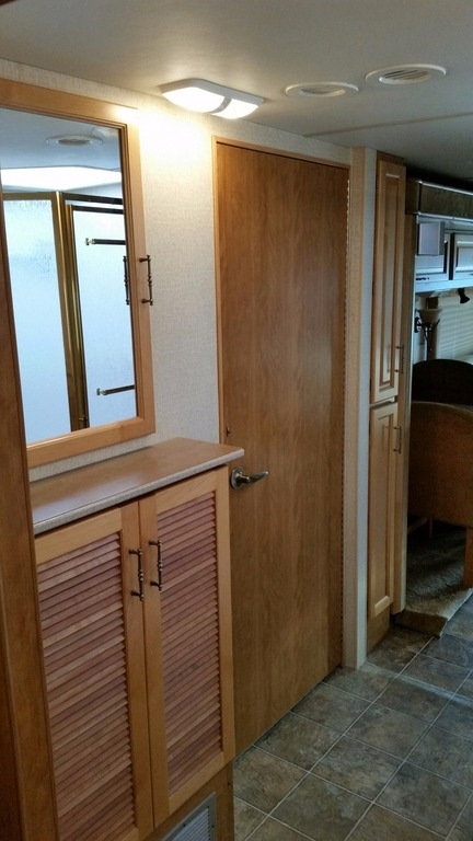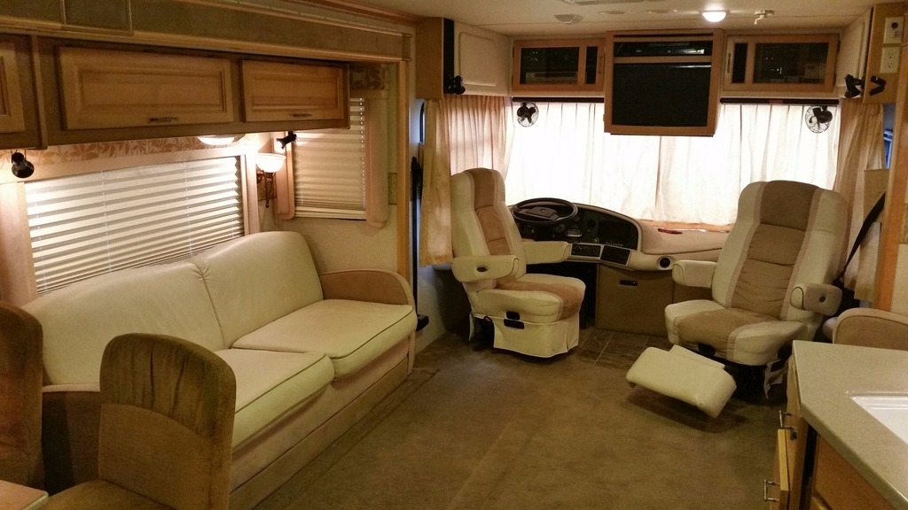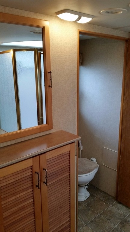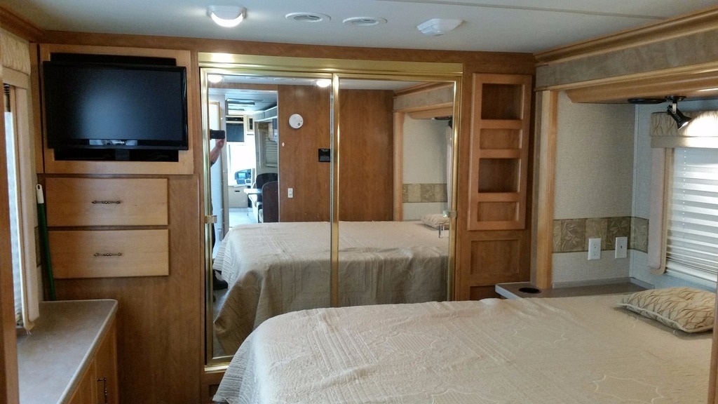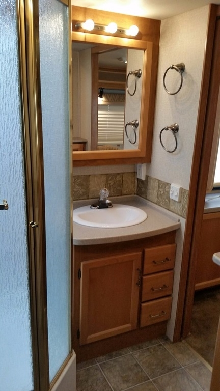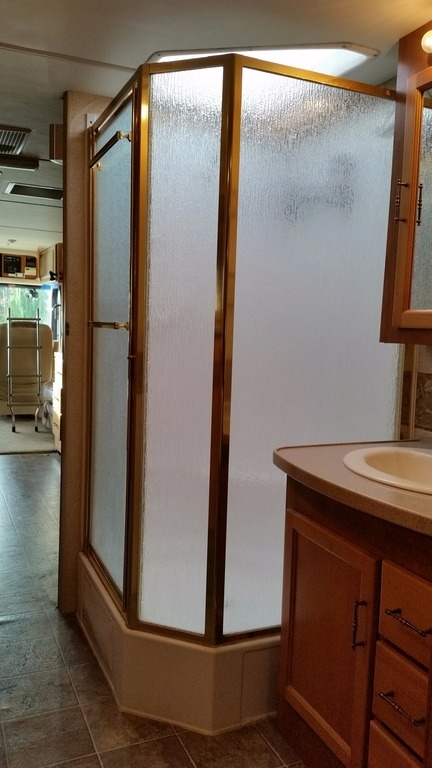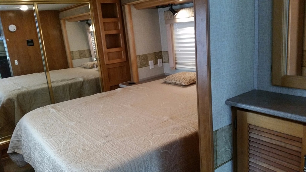 The rear bedroom has a walk in shower and separate toilet room. The bedroom has nice queen size tempurpedic mattress. There is a hidabed in one of the couches. The Captain’s chairs in cockpit swivel around and have electric footrests. The entertainment system throughout the RV includes a flat screen TV, CD/Stereo, and a Satellite Dish. It comes equipped with a Factory exhaust brake and tires are in great shape. The motor home isn't in perfect mint condition but is really nice.