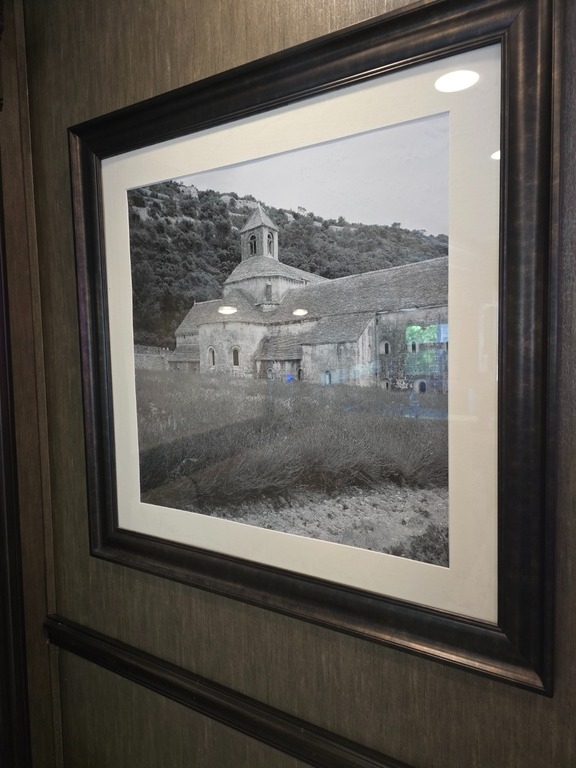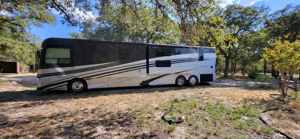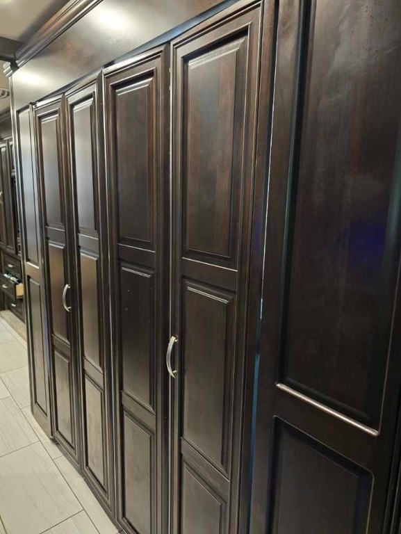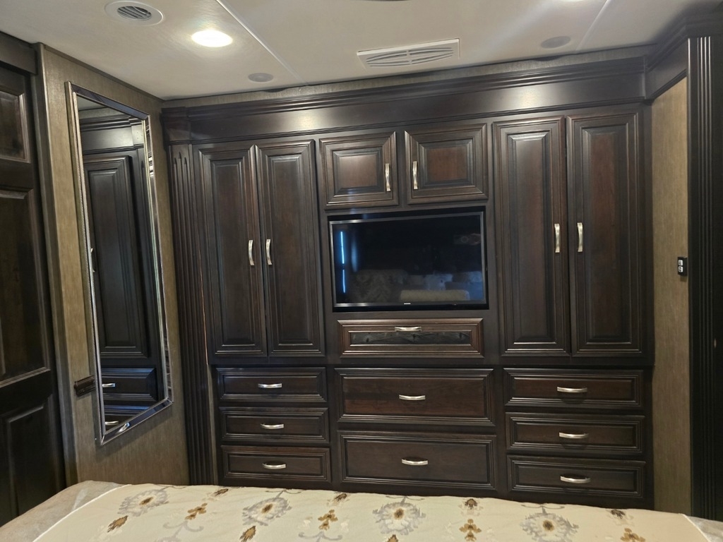 Storage is plentiful, with pass-through slide-out trays in two bays. The rear hitch is equipped with an airline fitting for tow vehicle connections (tow bar not included), and safety is enhanced with Tyron bands in the steering tires to maintain control in the event of a flat. The RV also includes a 10,000-watt Onan generator with just over 500 hours. Well-maintained and beautifully kept, this coach feels like a luxury home on the road!”