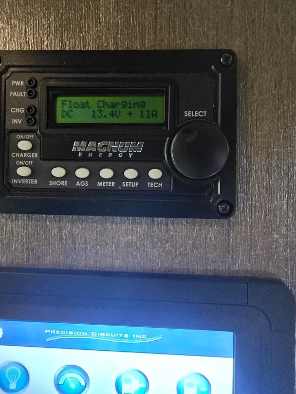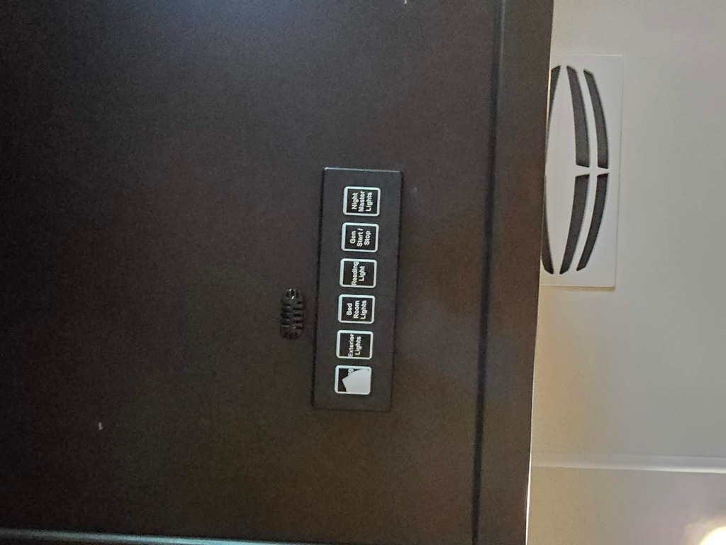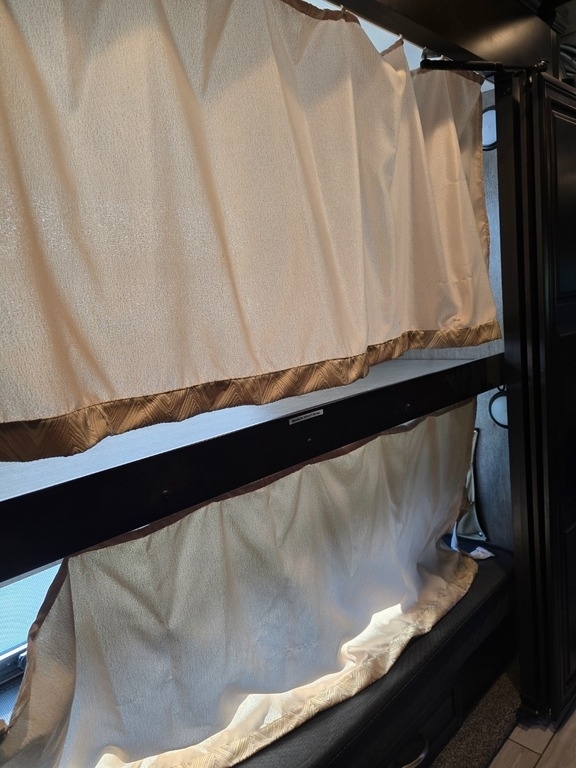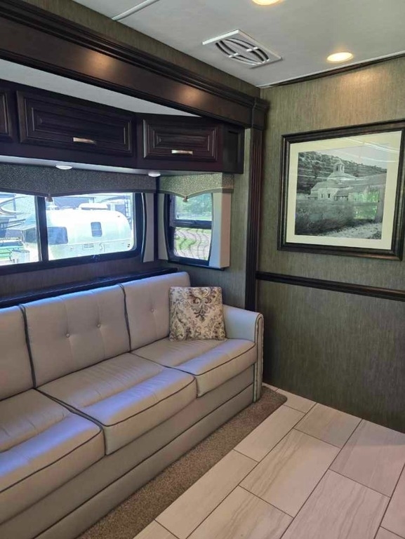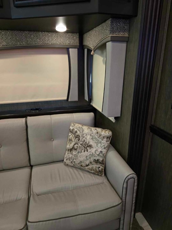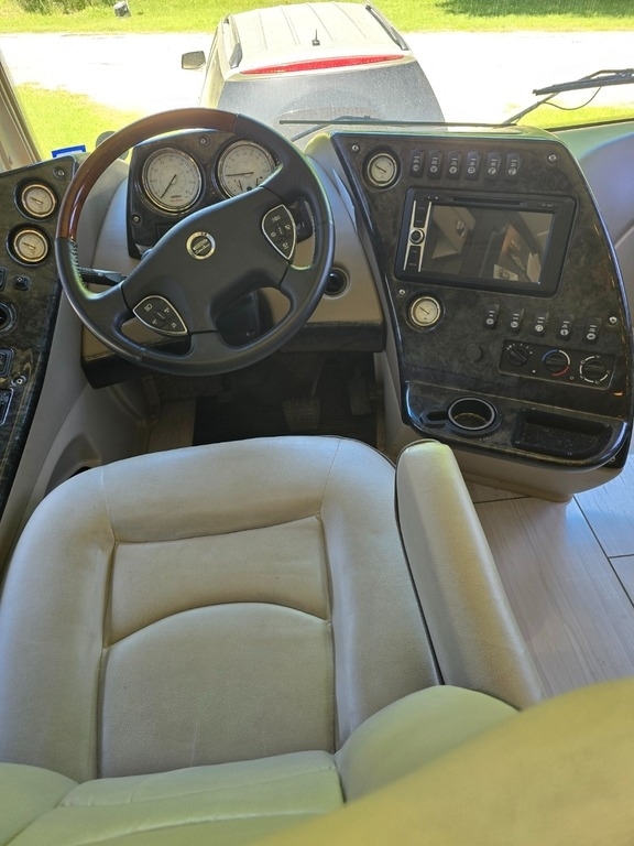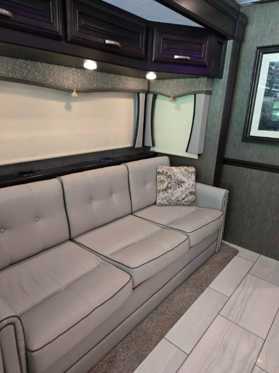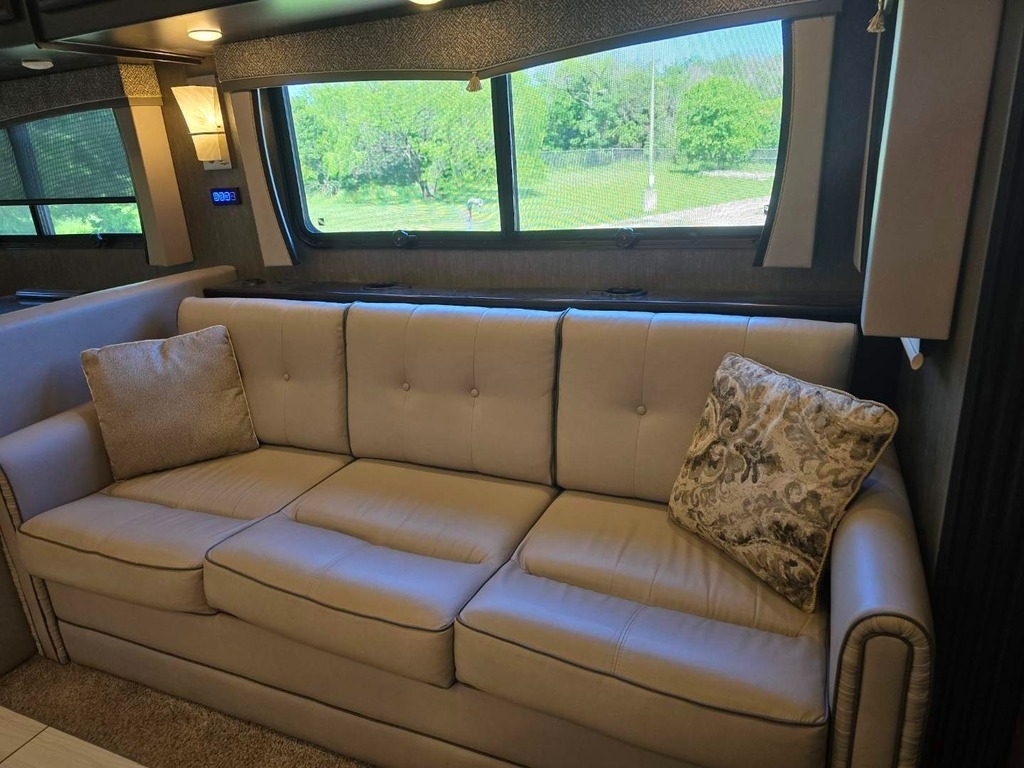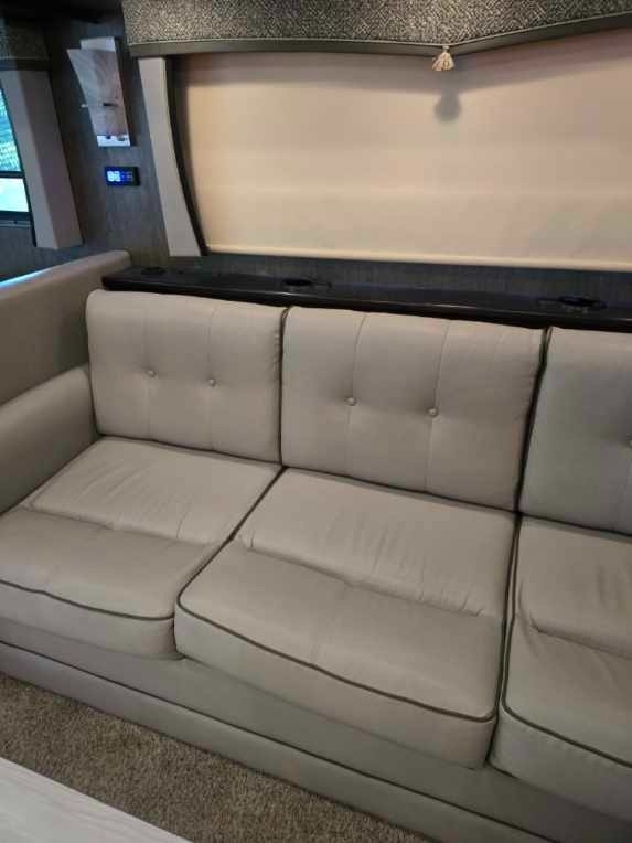 Throughout the RV, lighting is ample, and the leather furniture and driver/passenger seats are in pristine condition. The passenger seat even reclines with a leg extension for added comfort. The driver's controls are well-organized and easy to access. Key features include propane-powered on-demand water heating and floor heating, two awnings (one for the patio and another over the door), and side cameras that activate with turn signals. The stereo and navigation systems are Bluetooth-compatible.