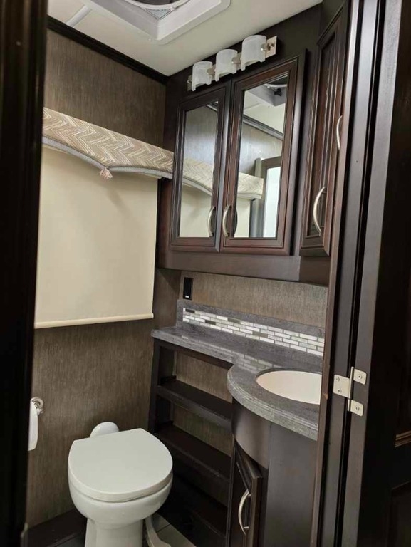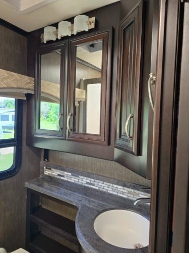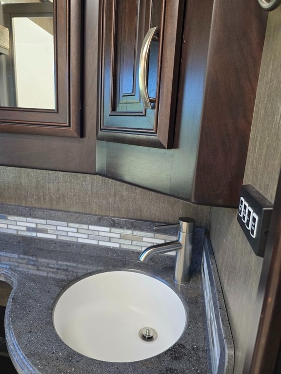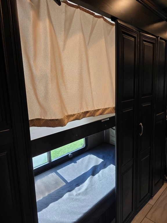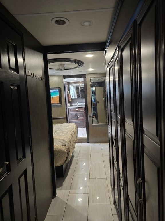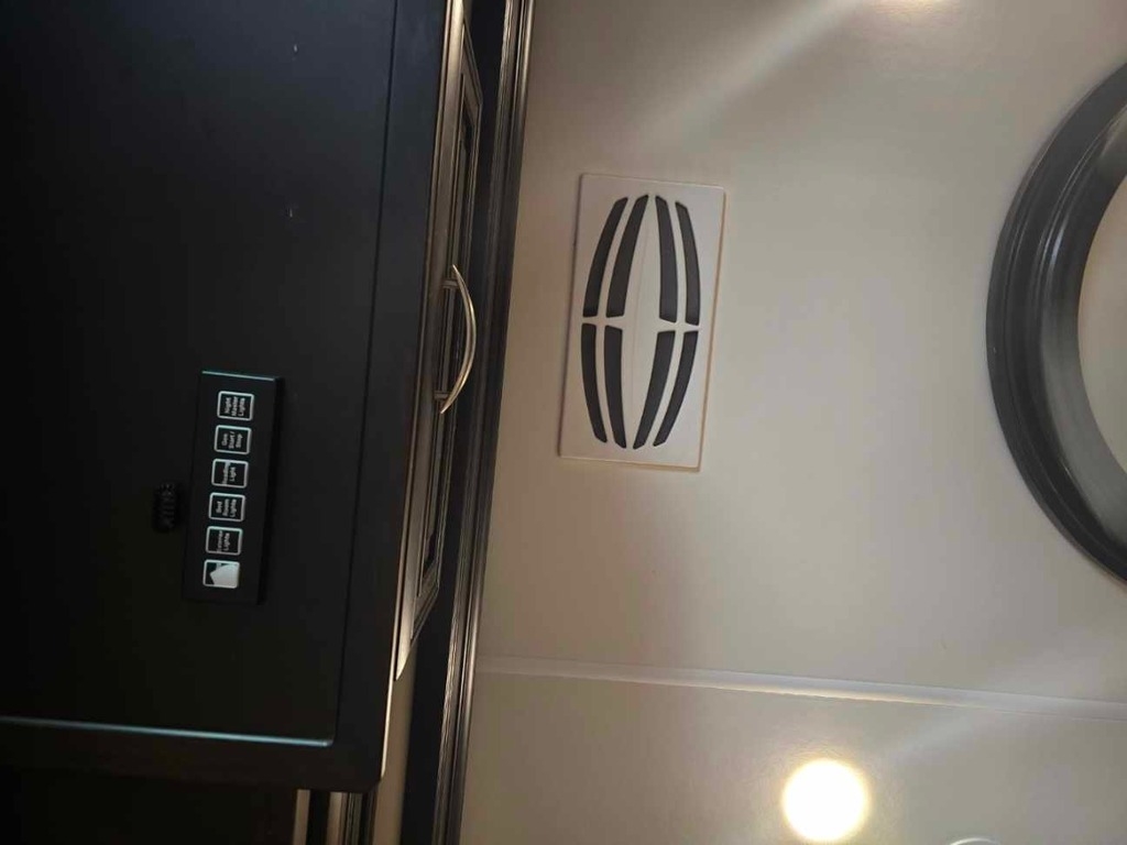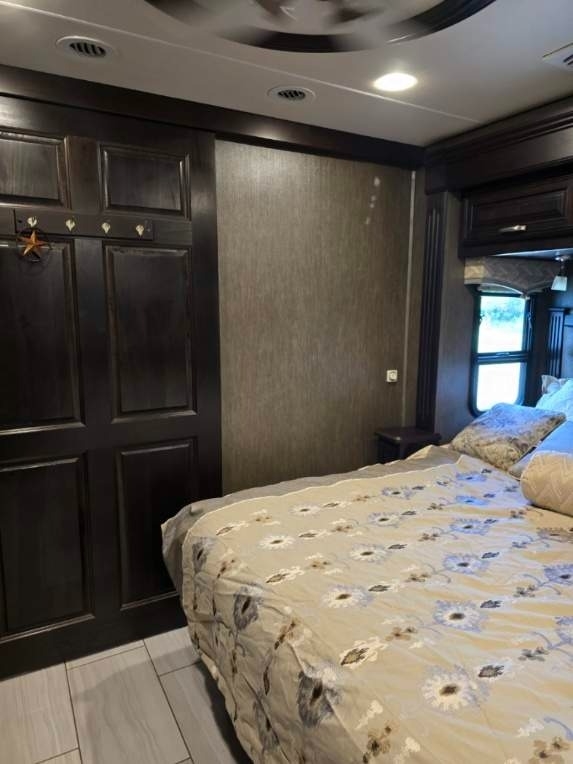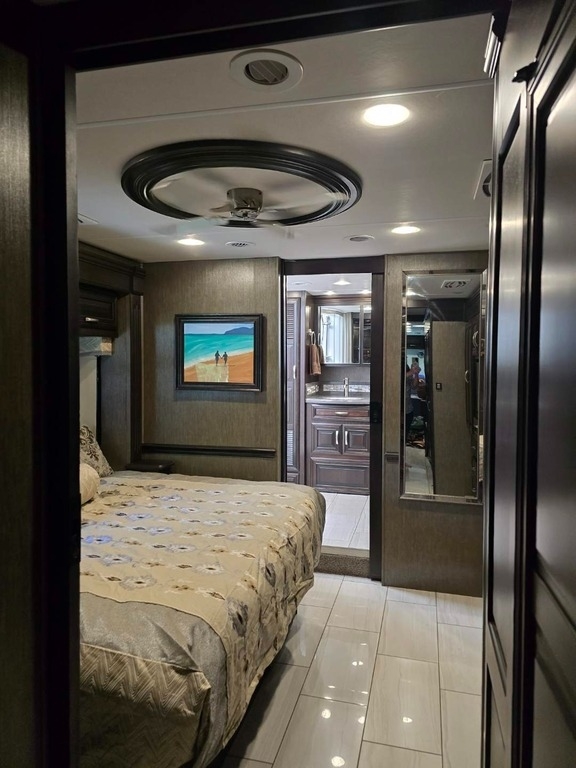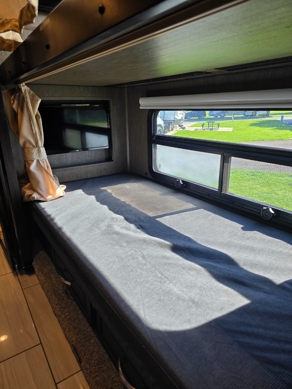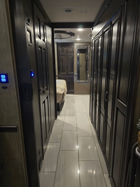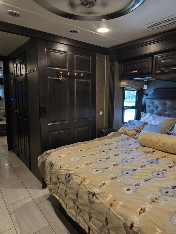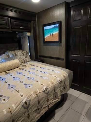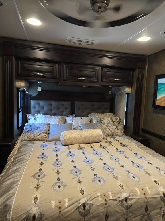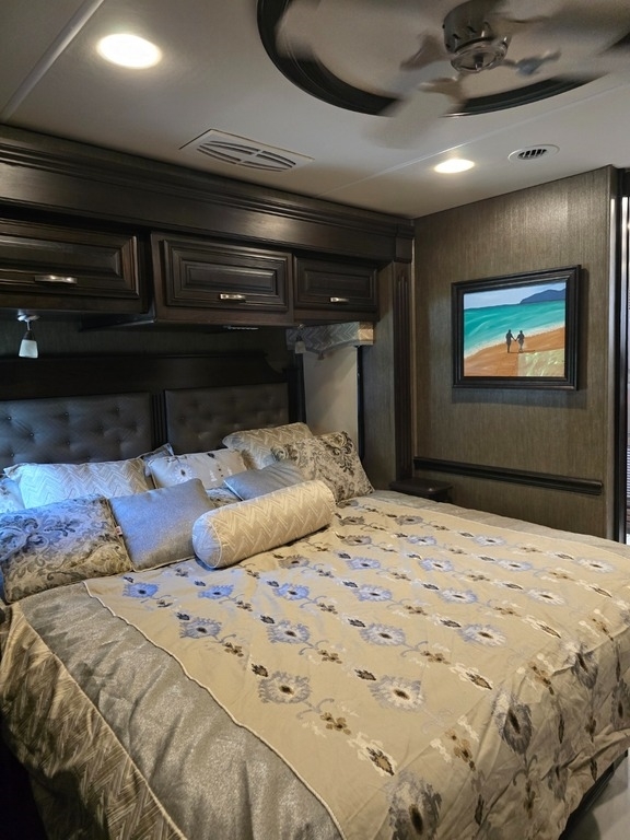 “This RV is the epitome of elegance on wheels, offering a luxurious living experience with a host of amenities you're sure to appreciate. The heated tile floors, two full bathrooms, and sleeping accommodations for eight make it perfect for comfort and convenience. The rear master bathroom is a true sanctuary, equipped with a TECMA toilet, washer/dryer, dual sinks, and a spacious shower. You’ll never run out of hot water thanks to the tankless water heater. The master bedroom features a king-sized bed, generous storage, a ceiling fan, and a spacious dressing area, with all lighting and feature controls easily accessible from the bed.
