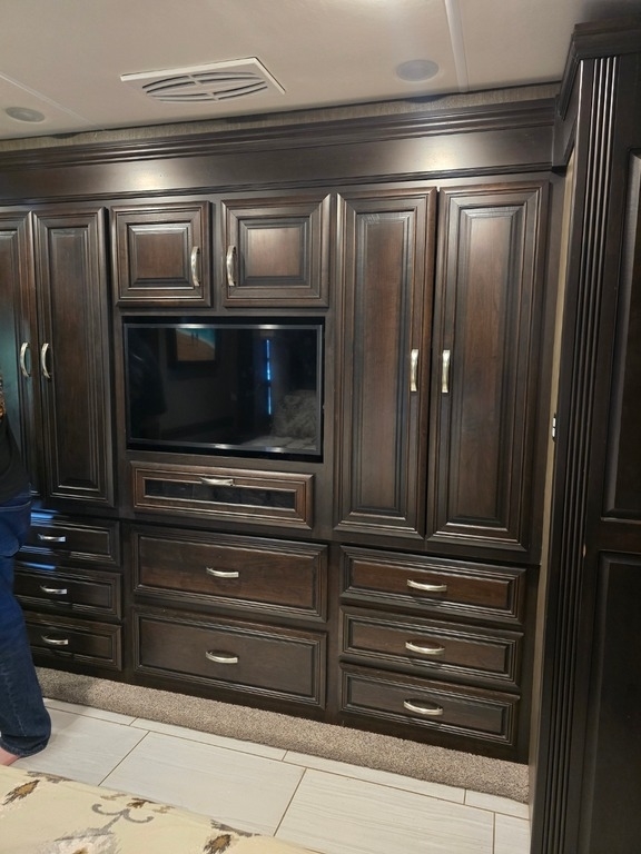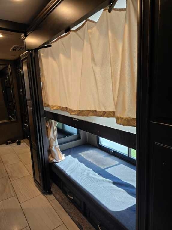 The mid-section of the RV includes a second, spacious bathroom located across from twin bunks, each fitted with its own flat-screen TV. The living area is expansive, offering a high-quality leather sofa bed that sleeps two and a convertible dining area that accommodates two more. The kitchen is well-appointed with an induction stovetop, convection/microwave oven, recessed pull-out pantry, dishwasher, and a residential refrigerator. A large flat-screen TV in the living area hides a storage area with a digital safe for valuables.