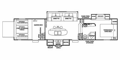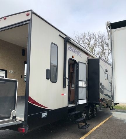 This 2013 Forest River Vengeance 396V has an overall length of 39 feet and comes equipped with an Onan 5.5kW Generator, 3 Slide Out(s), 4 Awnings, 1 A/C unit and plenty of room to sleep 6.