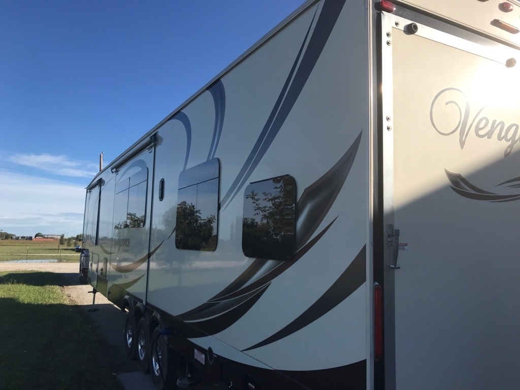 This 2015 Forest River Vengeance is 42 feet and comes equipped with an Onan 5.5kw gas generator, has 3 Slide Outs, 3 A/Cs, and sleeps 8. This is a non-pet/non-smoking RV and there has not been any accidents or water damage.