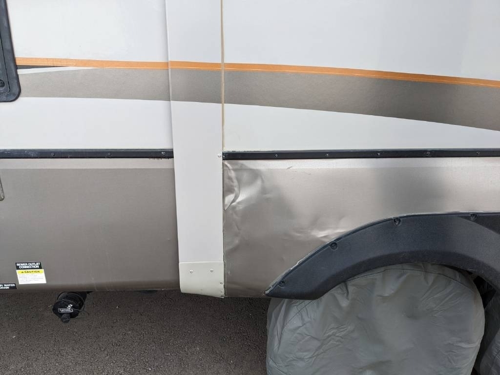 Driver Side Slideout Wheel Well Damaged due to a Tire Blow Out that does not affect the functionality of the Unit.