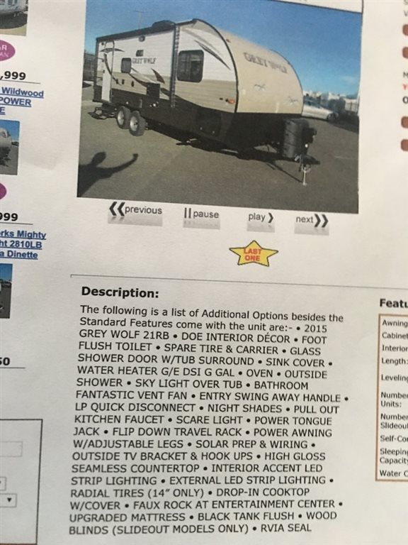 This 2015 Forest River Cherokee Grey Wolf’s has 1 Slide Out, 1 Awning, and an overall length of 25’4”. This unit is very spacious and has plenty of room to sleep 4. This is a non-pet/non-smoking RV and there has not been any accidents or water damage.