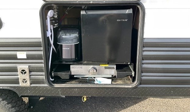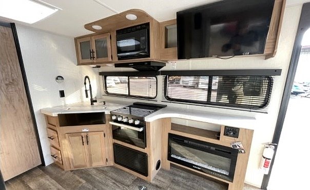 awning, 1 A/C unit, a fireplace, an outdoor kitchen, a 13-foot garage, and
