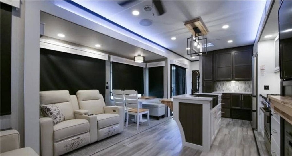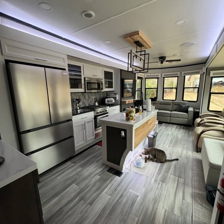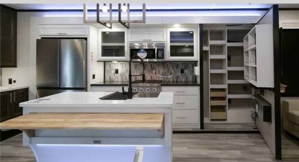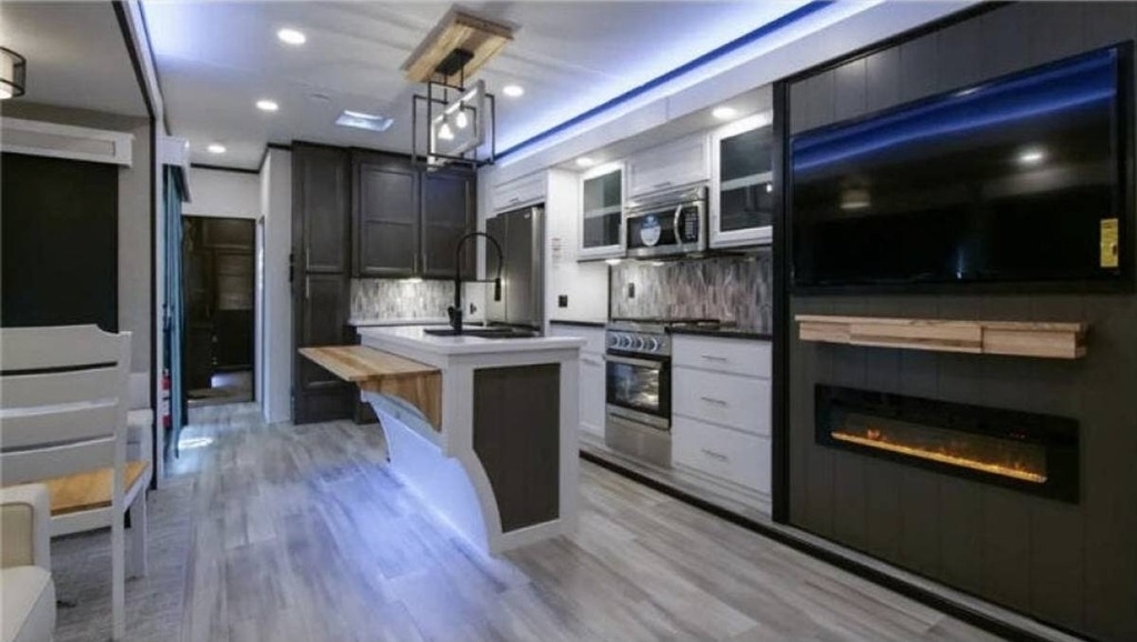“Fully loaded. Top of the line. All appliances including washer and dryer. Kitchen appliances are stainless steel and full size. Specs will be in the pictures. Very contemporary with tons of storage and lots of character. Walk in hidden pantry in kitchen. King size luxury bamboo mattress and living room sofa has upgraded bamboo queen size mattress in sofa. Upgraded solid wood deep cabinets with wide doors. Fireplace and two built-in televisions. Gas stove. Propane heat. Stainless farmhouses sink with upgraded faucets. Included are a washer and dryer with storage closet next to the laundry closet. Don’t miss this. The list price was 114,900 with all the upgrades. It comes with a convenience package plus the Advantage package. See attached photos for what is included in each package. 5 months old. Immaculate condition.”
