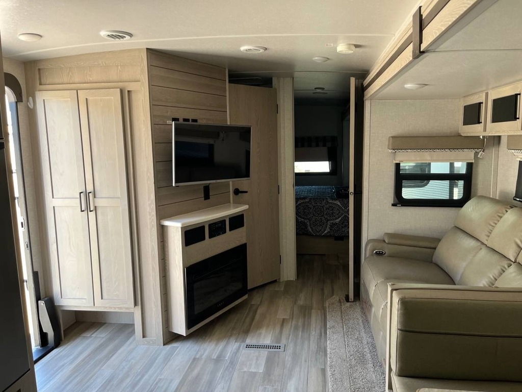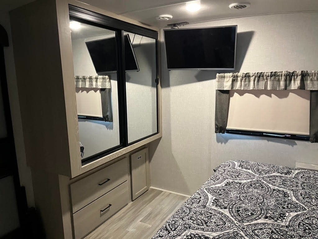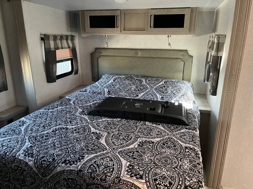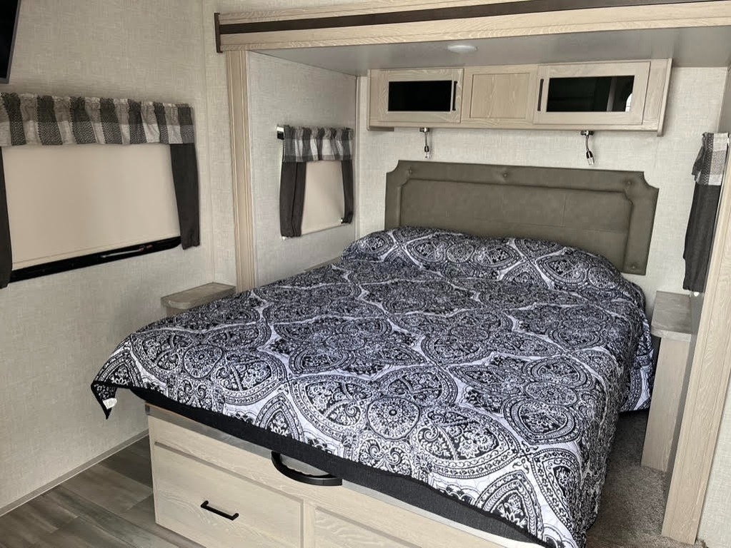 two slide-outs, offering a roomy interior. Inside, you’ll find a queen bed and