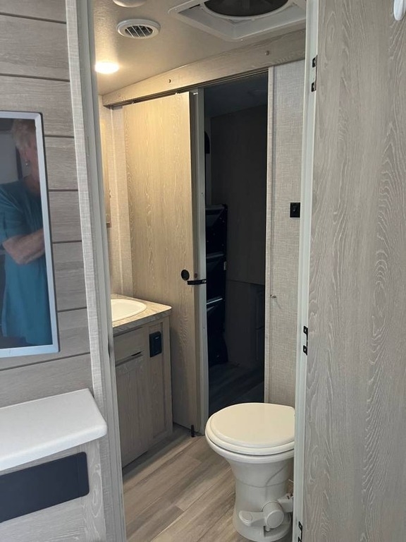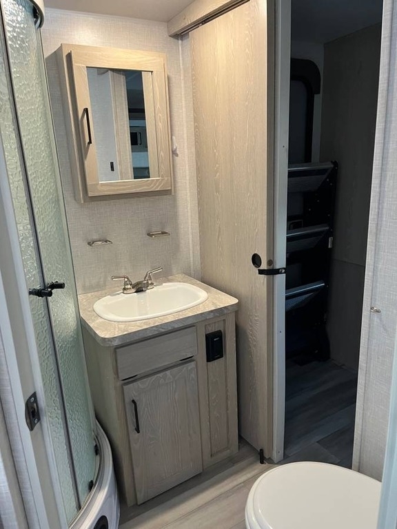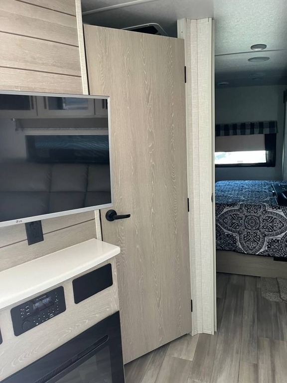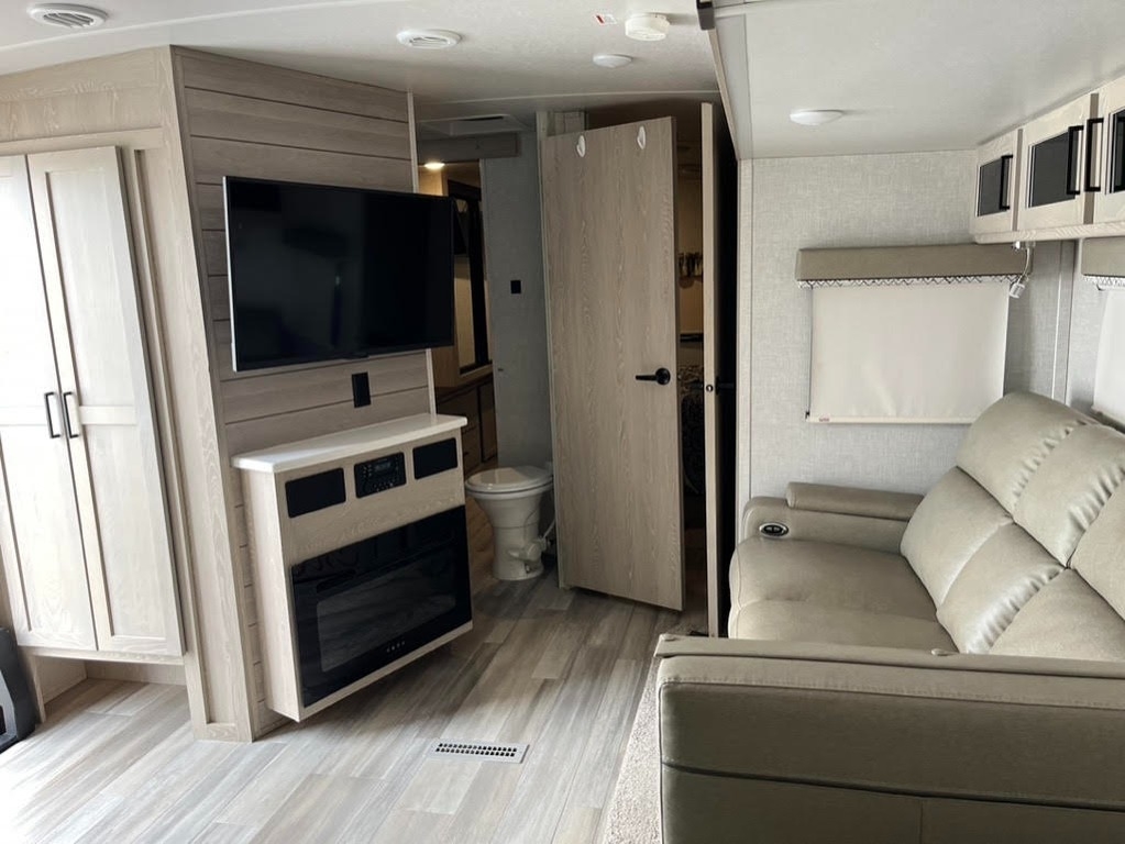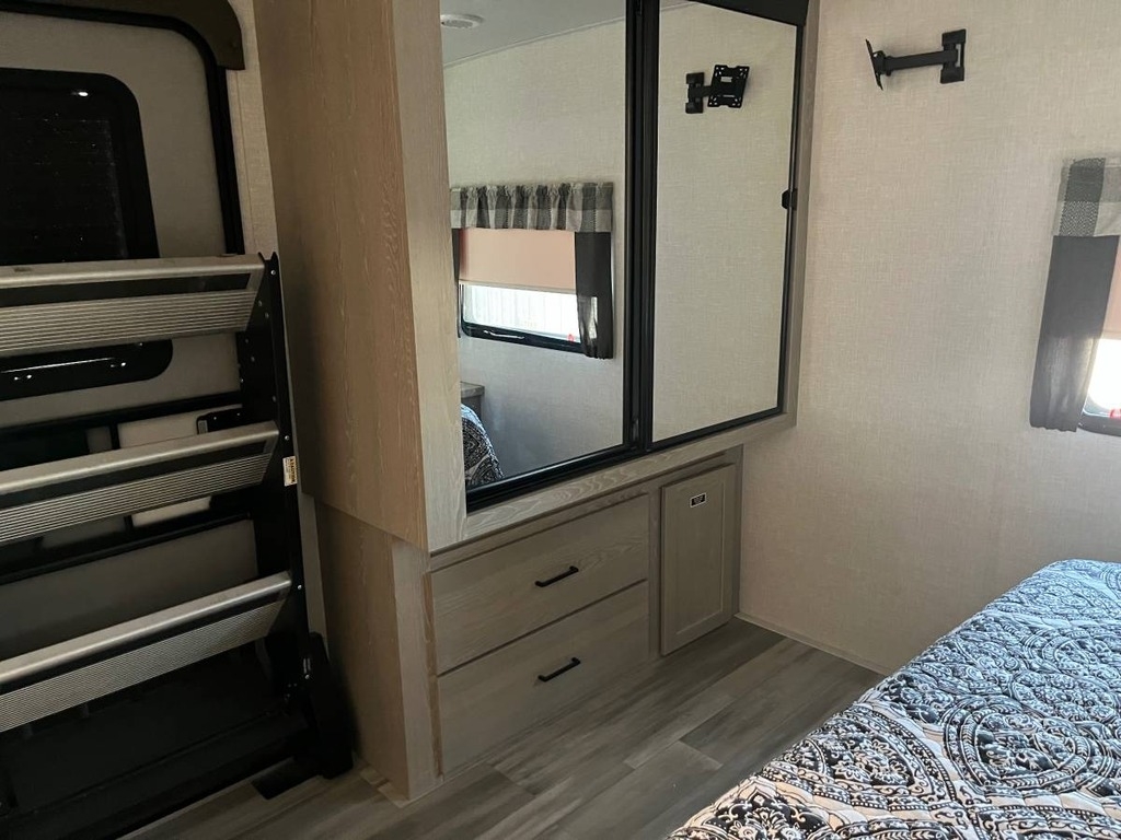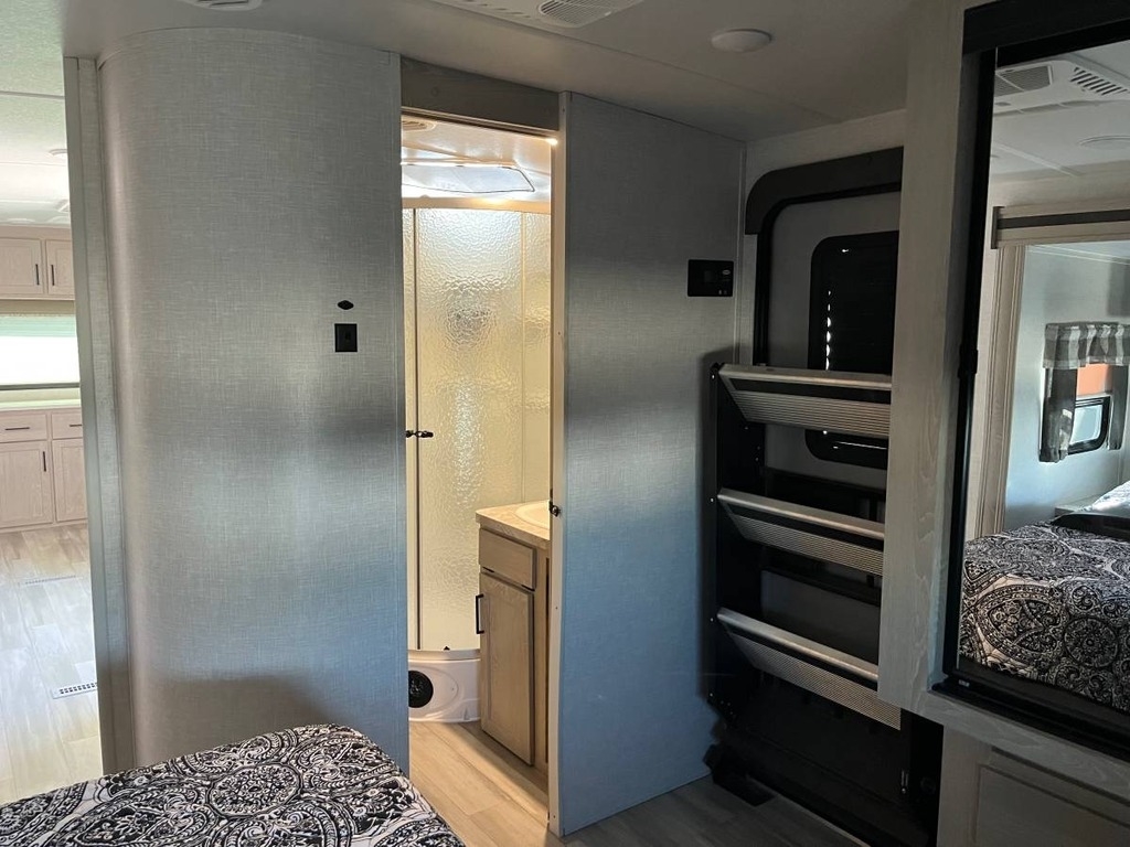two slide-outs, offering a roomy interior. Inside, you’ll find a queen bed and