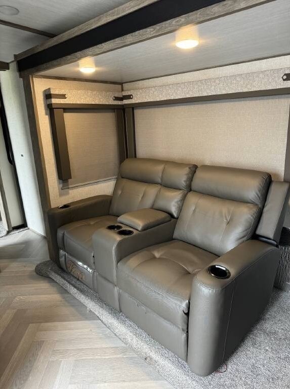 with dual recliner seating, fireplace, TV, stereo system, a large dining