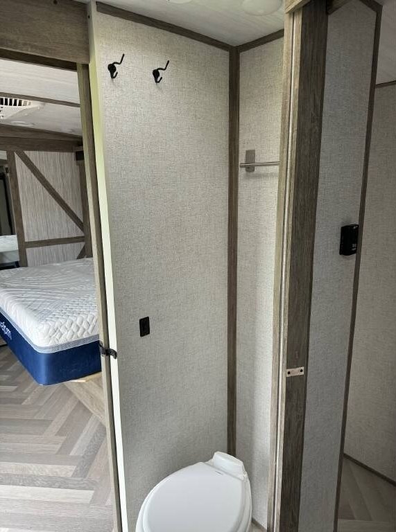 functional, with a shower, toilet, and sink. The bedroom is a cozy retreat,