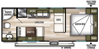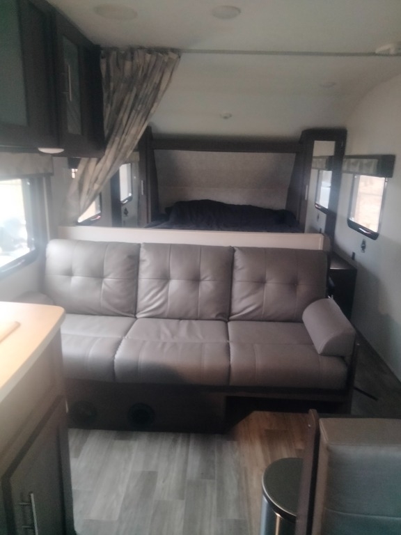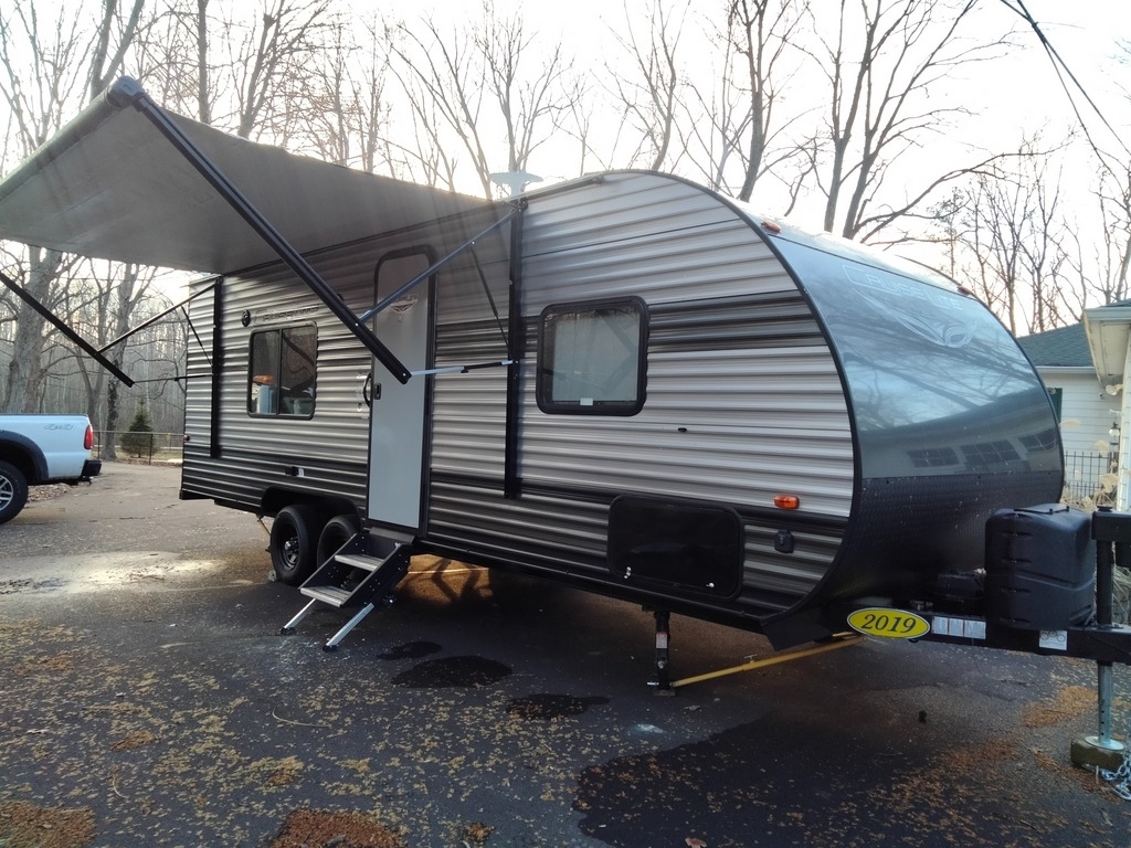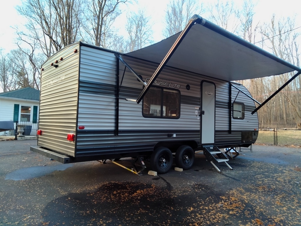 This 2019 Forest River Salem Cruise Lite 241QBXL Travel Trailer is 26.92 feet long and comes equipped with a patio awning, an air conditioning unit, and can sleep six people comfortably.