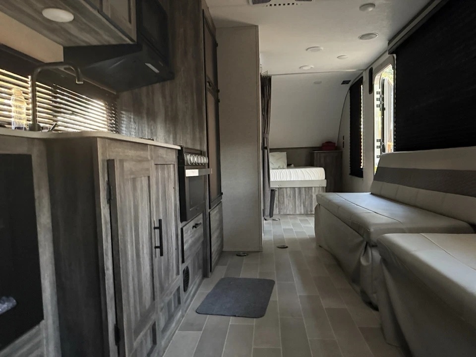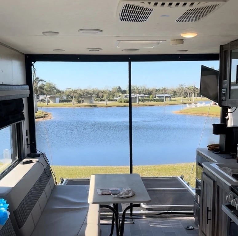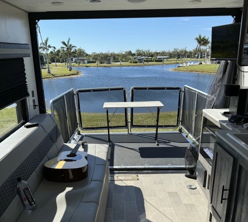 stay, while the panoramic windows offer fantastic views. This toy hauler includes a