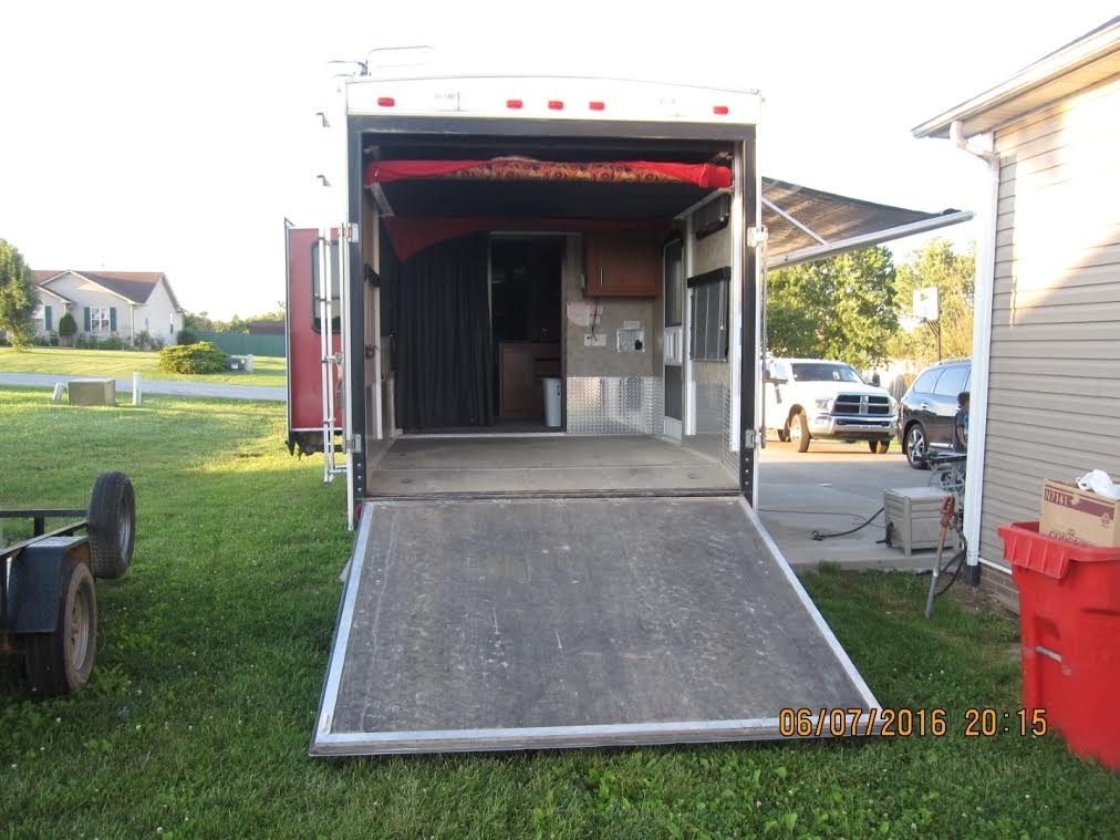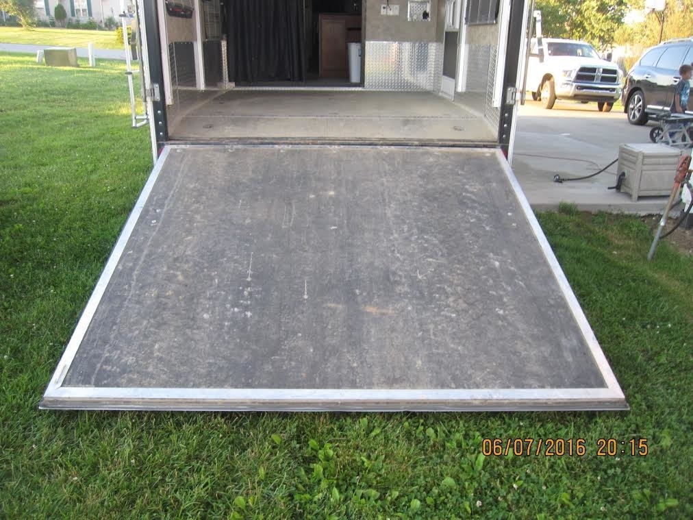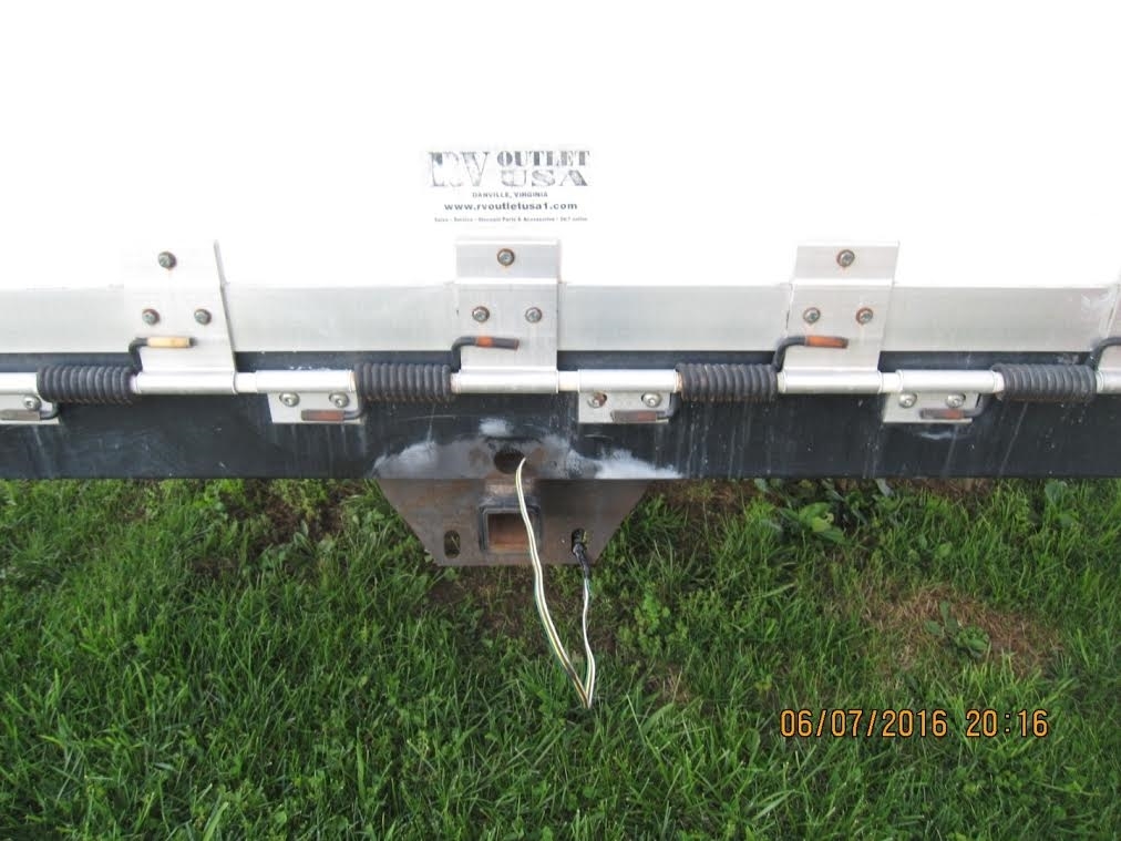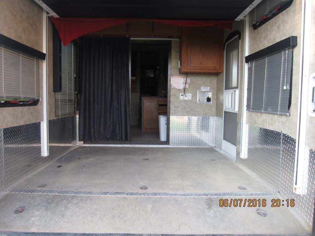 There are electric stabilizers in rear, seller had a hitch added to the rear to double tow. Seller pulls a 2 seater SXS inside and 4 sealer on a 6x12 behind it no problem.