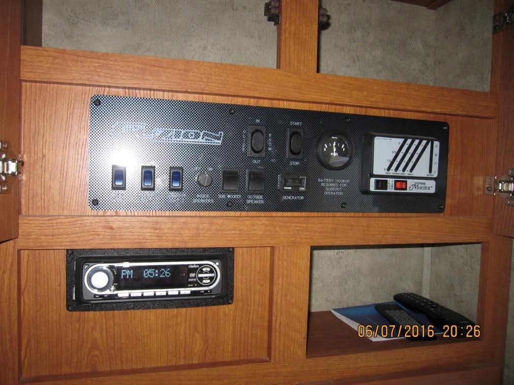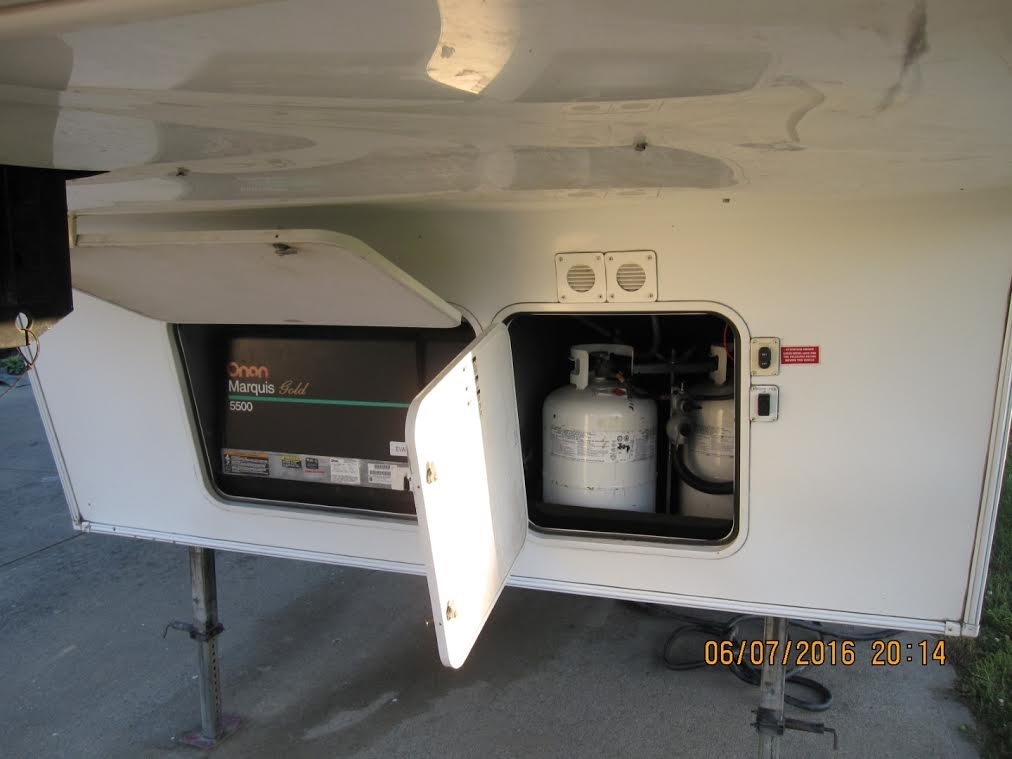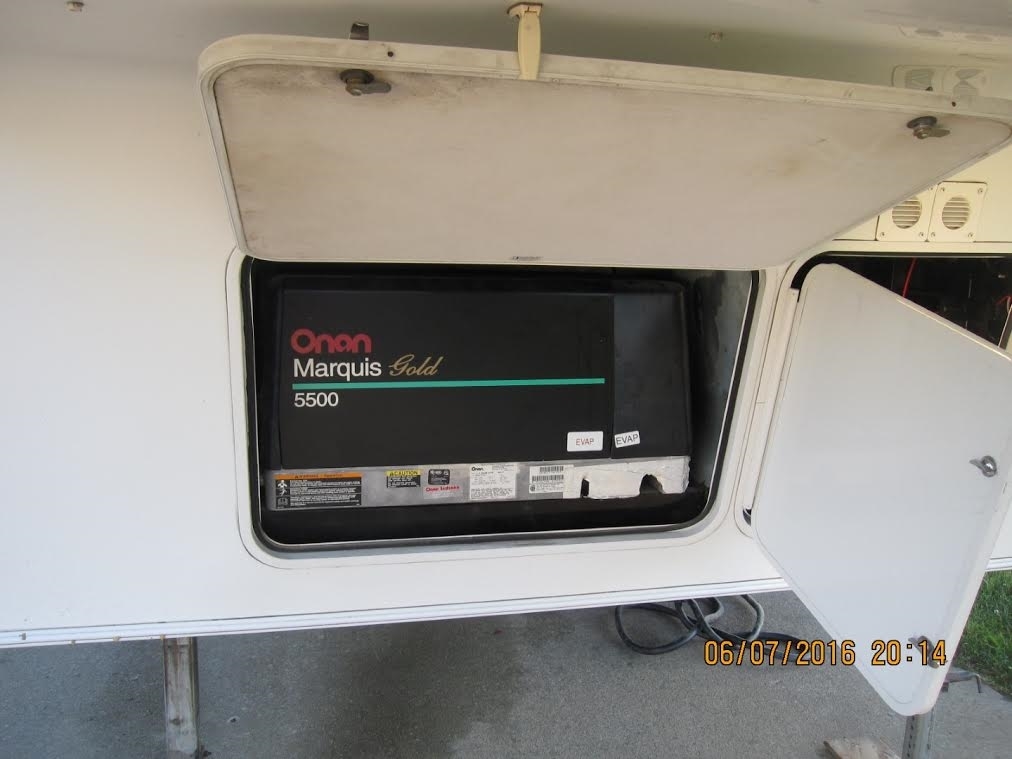 It has an ONAN gas generator on board with electric start that start by the push of a button from the inside. Only 340 hours on generator. Toy Hauler includes 16 gal auxiliary refuel tank that will run generator alone for over 3 days or can be used to fuel toys up at the campsite.Seller has always used full synthetic oil in it. Electric or gas water heater. It has dual Air conditioner units (optional unit was added in bedroom).