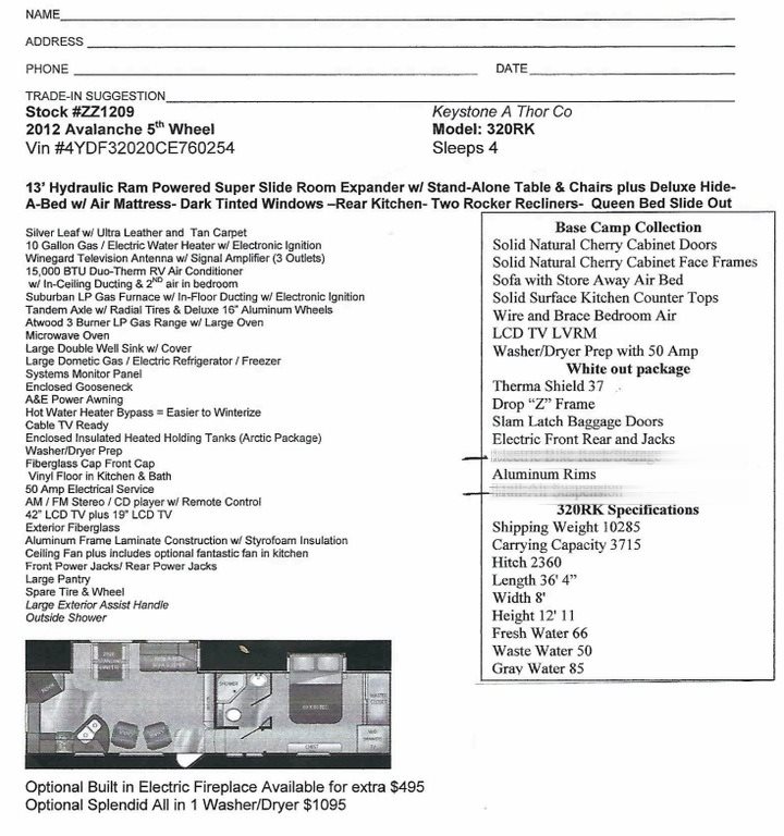 Beautiful 2012 Keystone Avalanche 320RK Fifth Wheel is ready to make your traveling dreams into your traveling reality. This Fifth Wheel has many great features and amenities.