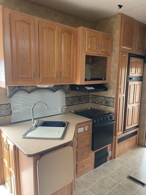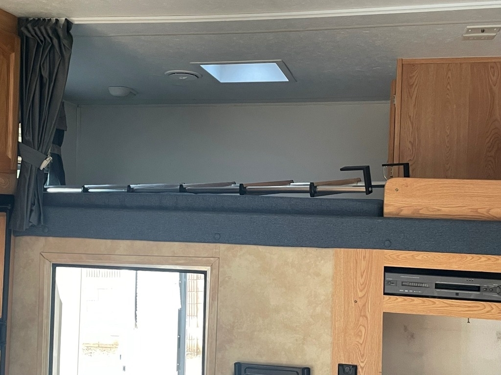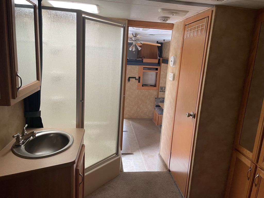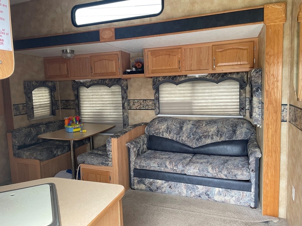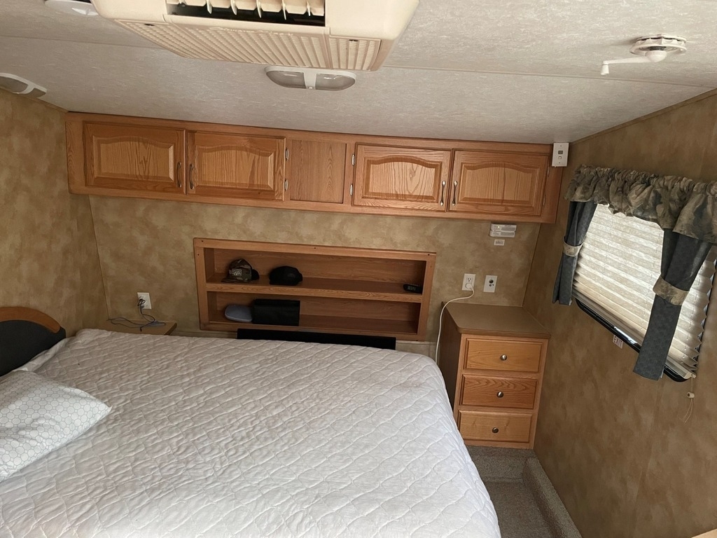 The 2005 Keystone RV Raptor 3512 is a fifth-wheel toy hauler model that features three axles and a total length of 37 feet and 9 inches. The interior includes a separate garage area with a ramp door for easy loading and unloading of recreational vehicles and overhead cabinets for storage. The main living area includes a full kitchen, dinette, and a living room with a sofa bed and entertainment center. The bedroom includes a queen-sized bed, wardrobes, and additional overhead storage.