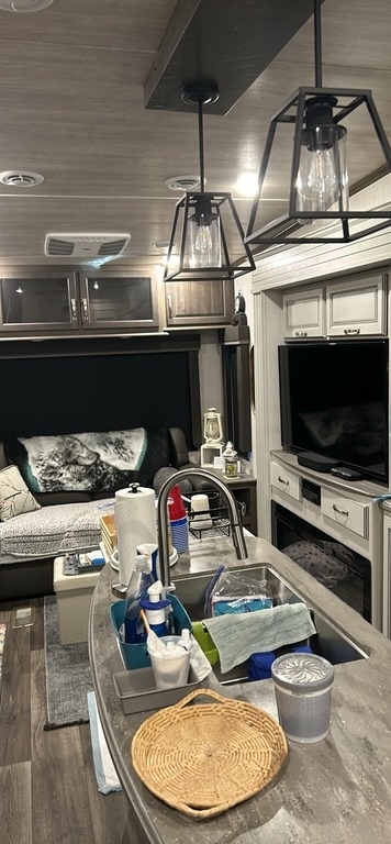 equipped with 3 power retractable slide-outs, 2 power retractable awnings, a fireplace,