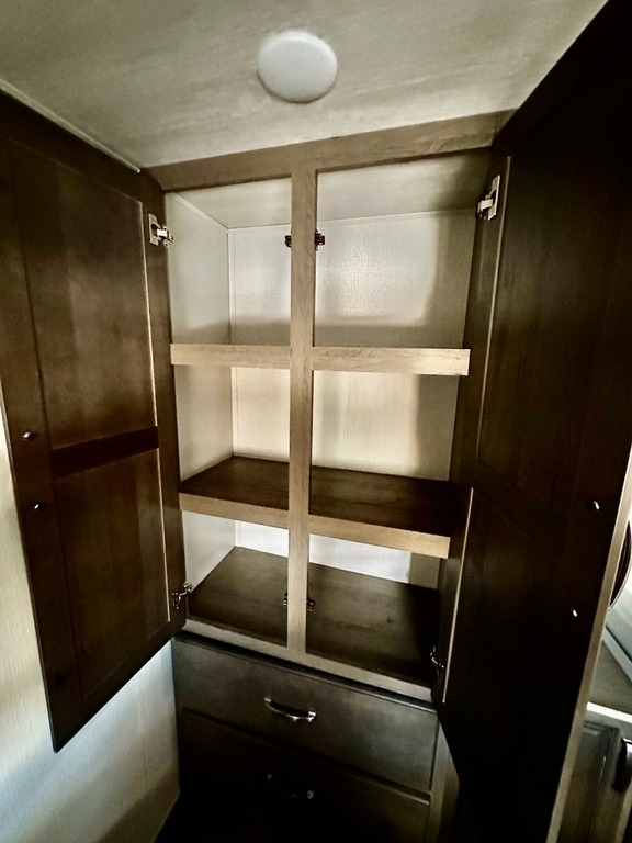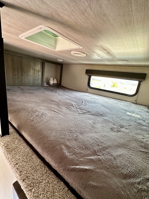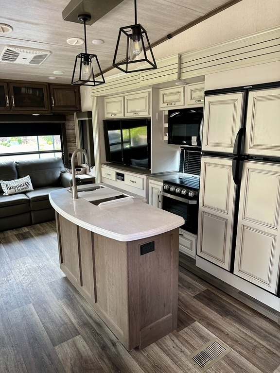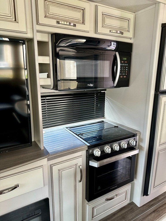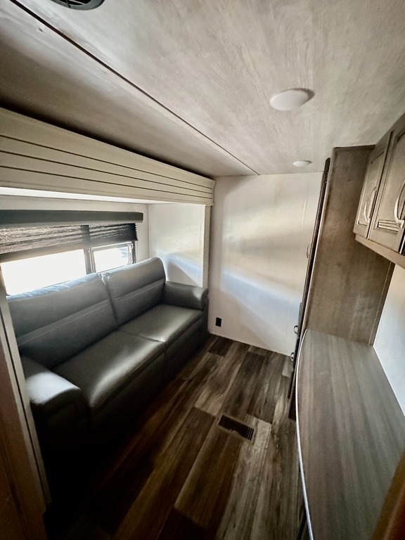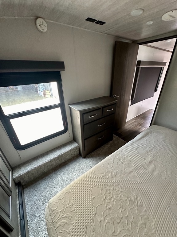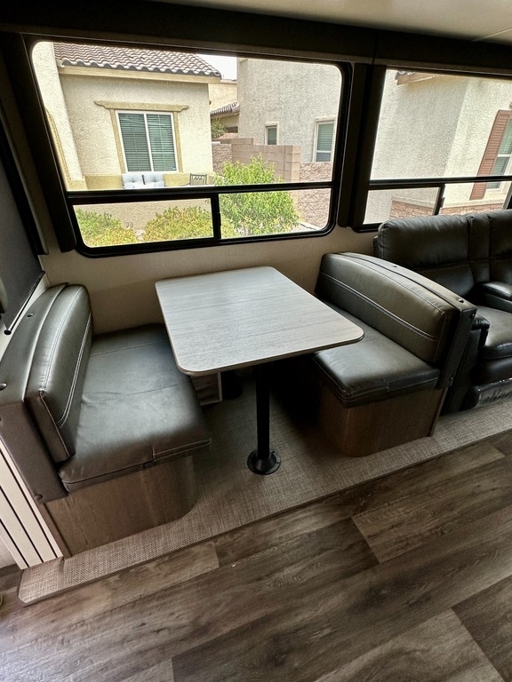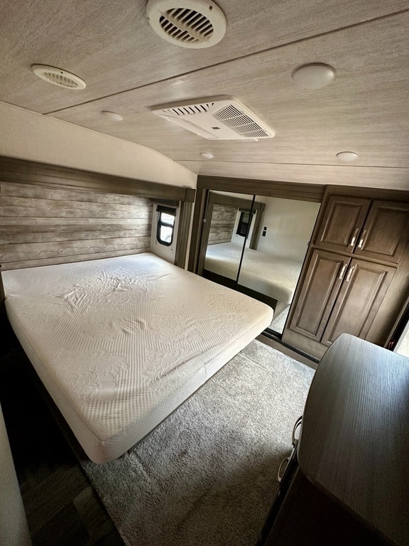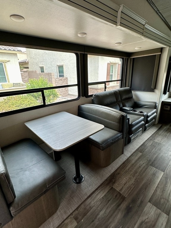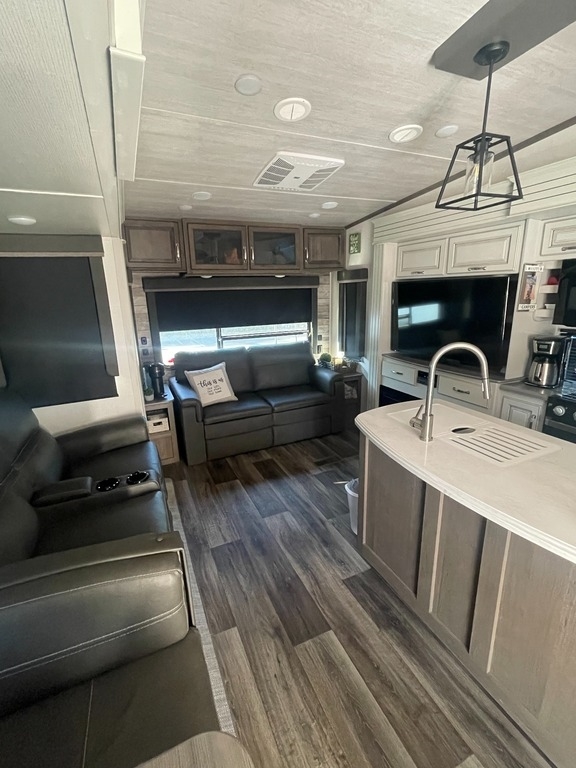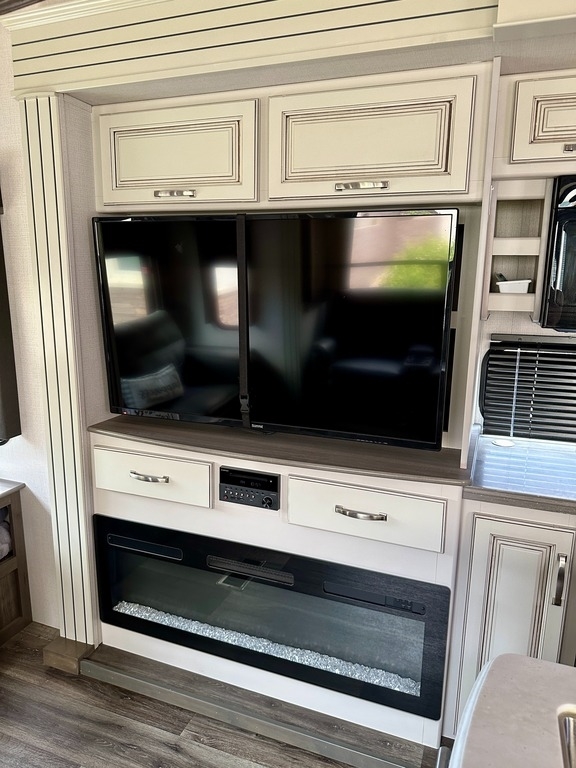 This Keystone has 4 slide-outs, 2 awnings, 2 A/C units, and can comfortably sleep 11. This fifth wheel has many amenities such as an electric fireplace, washer and dryer hookups, exterior shower, exterior griddle and many more.