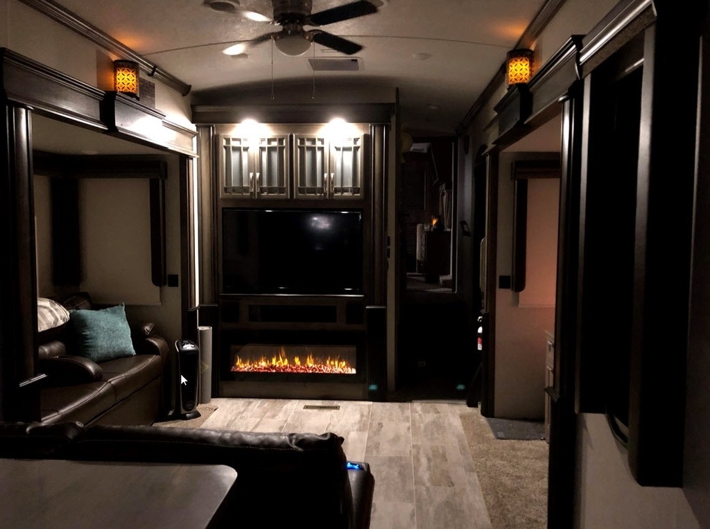 Luxury kitchen model includes a large 4 door fridge/freezer, gas oven, 3 burner stovetop, micro/convection oven, double kitchen sink, washer/dryer combo, electric fireplace, central vacuum, 3 flat screen TV’s (living room, bedroom and outside), mounted antenna, ceramic gravity flush toilet and a walk-in shower with bench and skylight, king bed