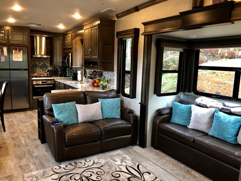 Extras and upgrades include: upgraded shower head, bathroom faucet and kitchen faucet sprayer; 6 stabilizers for leveling jacks, 40 amp surge protector, 40 amp extension cord and area rugs