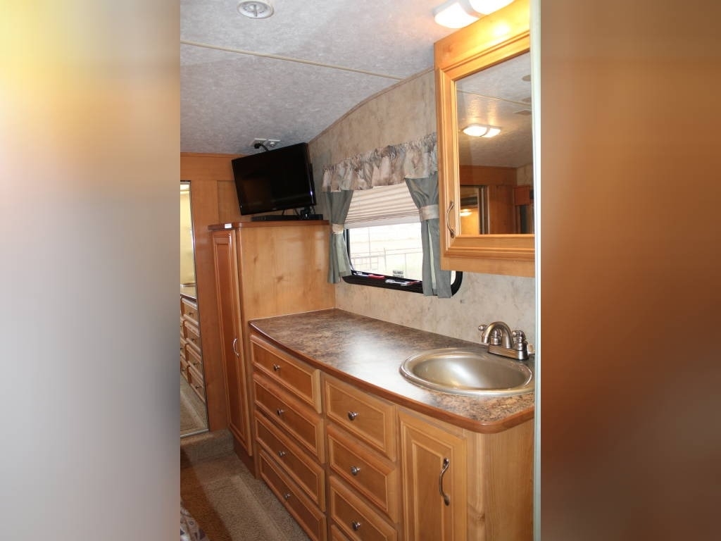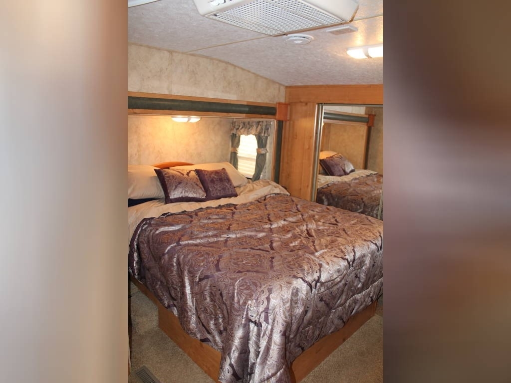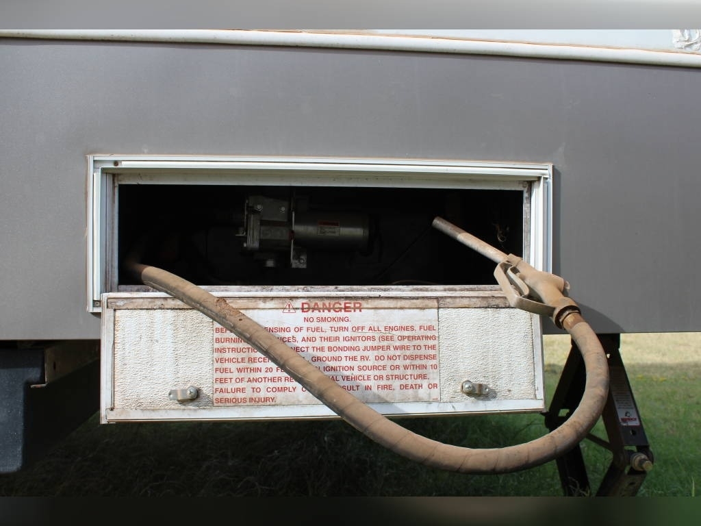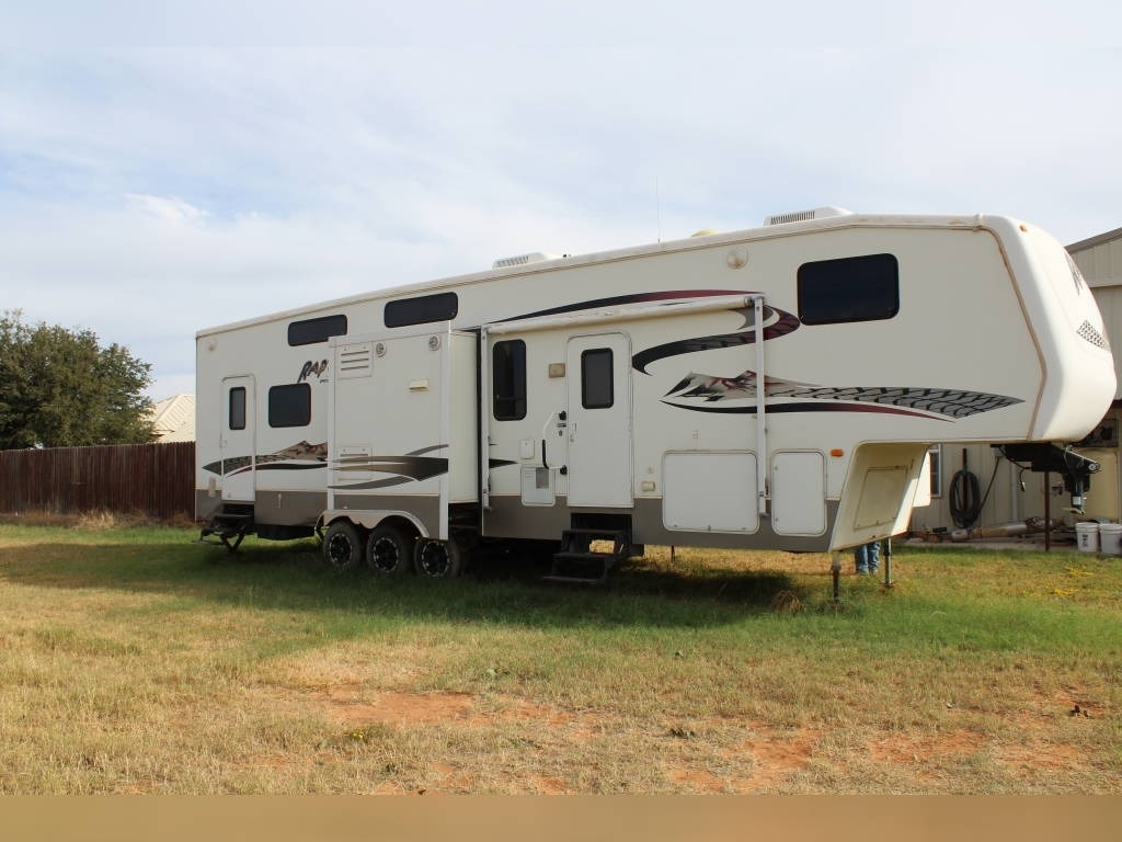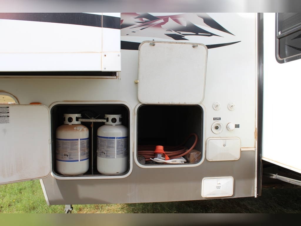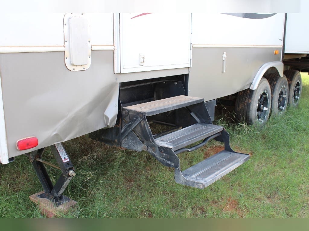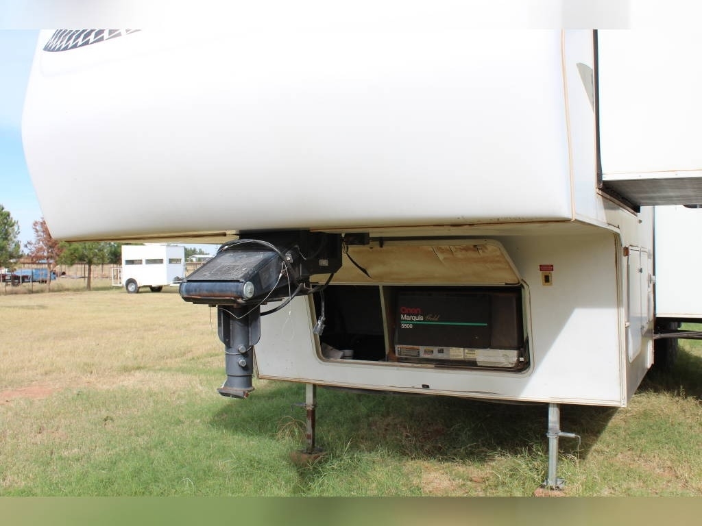 Per Seller - All mechanics and appliances in working order. Hot water heater and Refrigerator will run on propane or electric power. Dual propane bottles were bought new 1 year ago. New roof from RV Armor with Lifetime Warranty. Warranty is based on vin of trailer not owner. Slight damage due to blown tire from previous owner and is strictly cosmetic (pictures reflect). Camper is equipped with onboard Onan generator-623 hours. On board fuel station for toys and generator. Camper has 6 new 14 ply tires with less than 2,000 miles. Awning will extend and retract but canvas will need to be replaced due to sun damage. Outdoor shower. Carpet like new. Minimal if any cosmetic damage to interior. Mattress are included but bedding and dishes will be removed before sale closes. Trailer is set up with goose neck adaptor and can be removed for traditional 5th wheel. Clean title in hand.