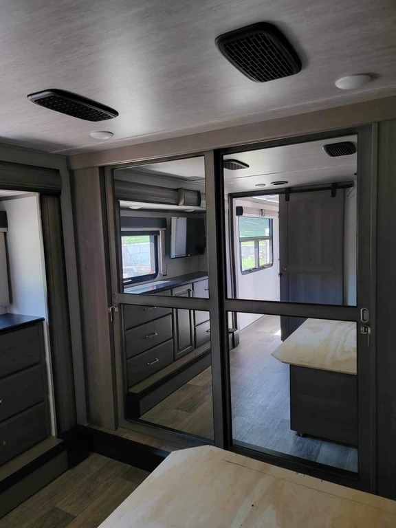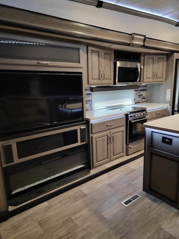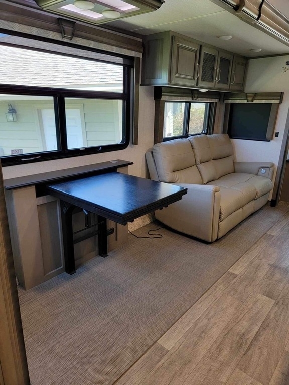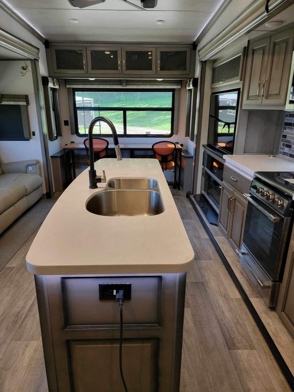 This 2021 Keystone Is 42 Feet Long With 4 Slide Outs and 2 Motorized Awnings. It Includes a Reese Goose Box Air Ride Ball Hitch, an Independent Torsion Bar, and Rubber Suspension with Disc Brakes. (Not Many Fifth Wheels Have This. It Allows for Safer Faster Stopping). The Kitchen Includes a Residential Large Refrigerator with An Ice Maker and a Large Kitchen Island.