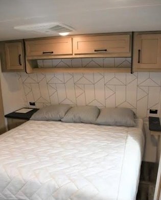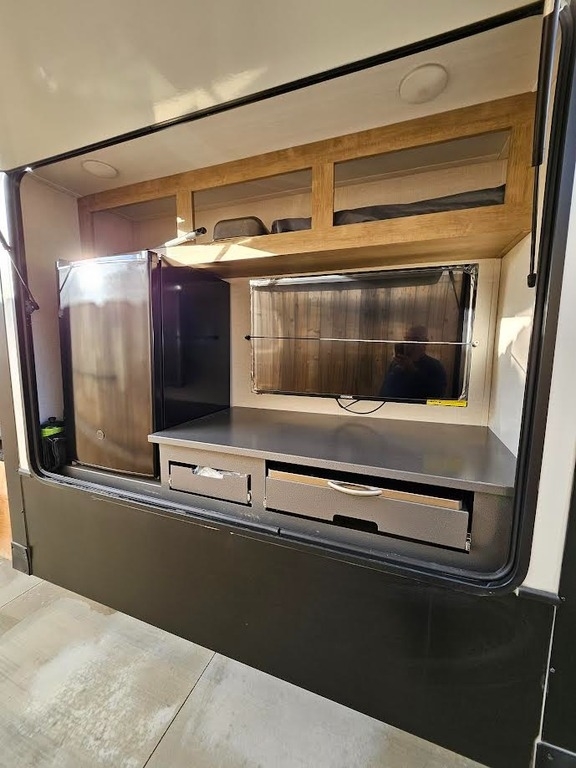 This Keystone has an overall length of 44 feet and comes equipped with 3 power-retractable slide-outs, 3 power awnings, 3 A/C units, a generator, solar, a 13-foot garage, a fireplace, an outdoor kitchen & entertainment system, an on-board fuel station, and room to sleep up to 7. This unit has been well-maintained.