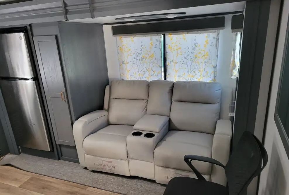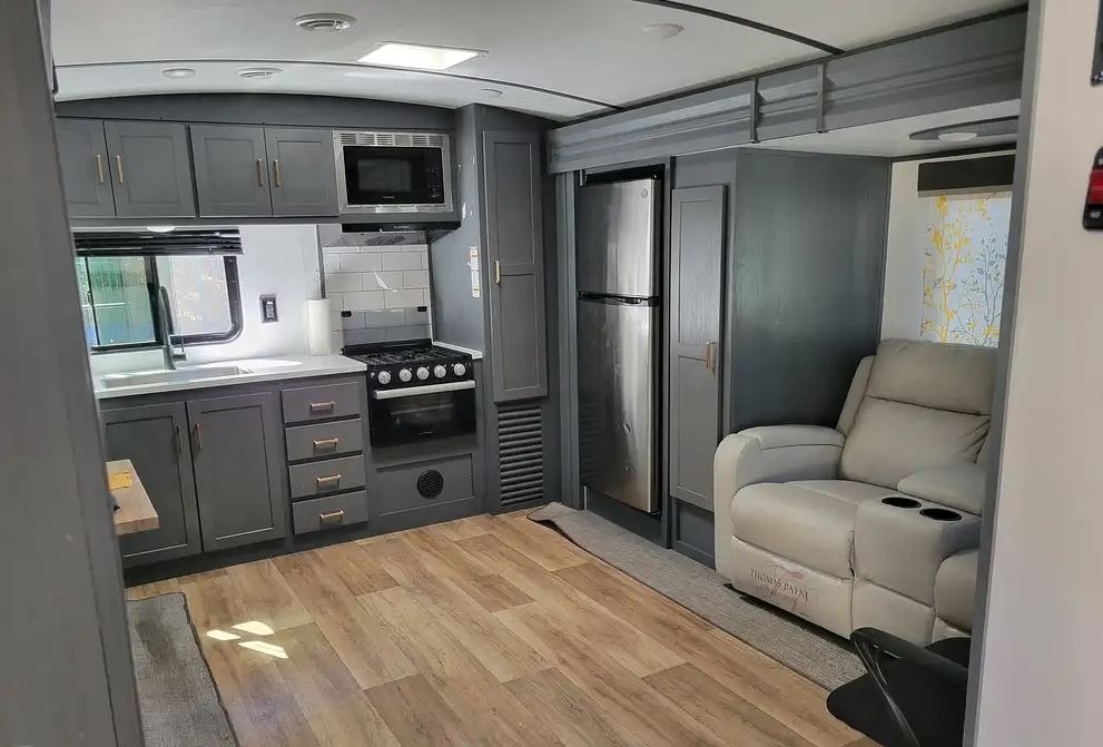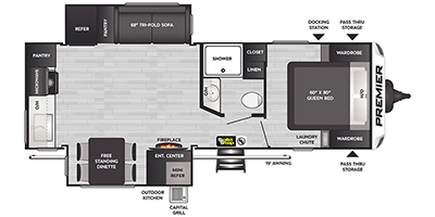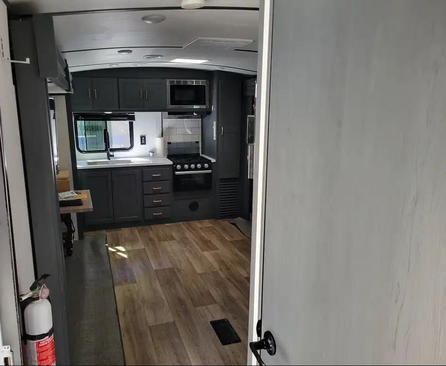 This Keystone has an overall length of 29.67ft and comes equipped with 2 slide-outs, 1 power awning, 2 A/Cs (second A/C in bedroom), a fireplace, and room to sleep 4.