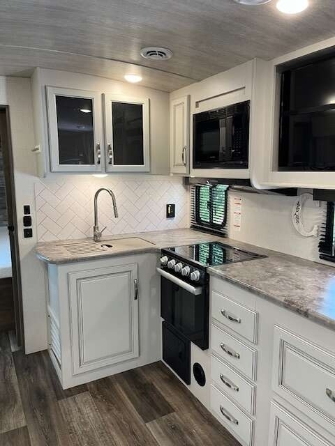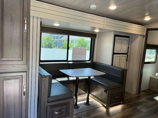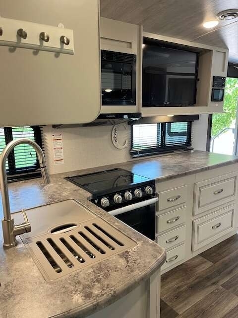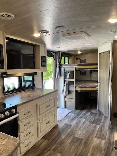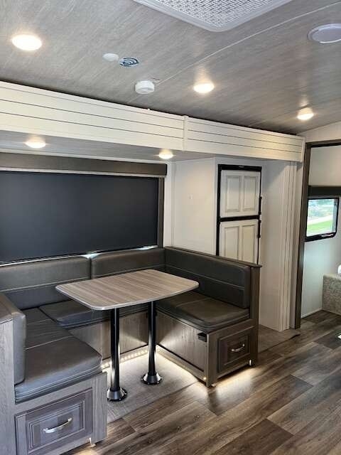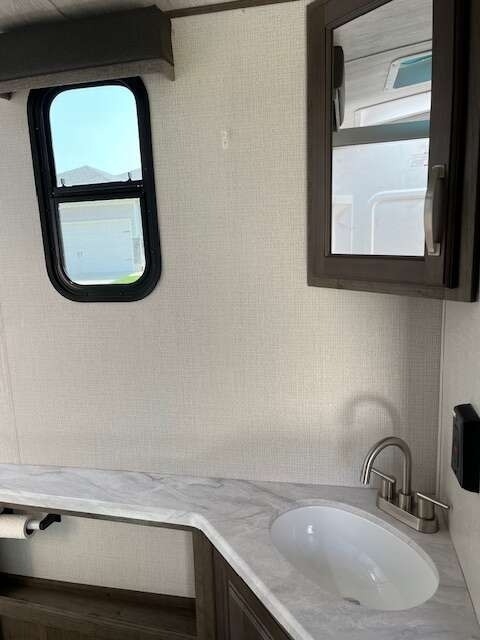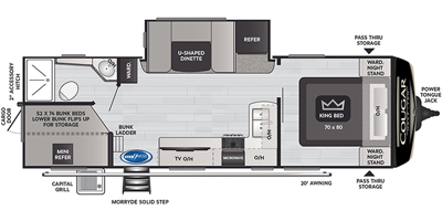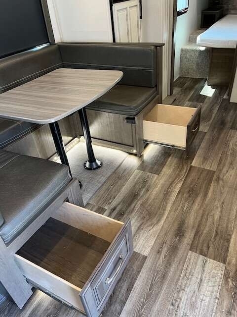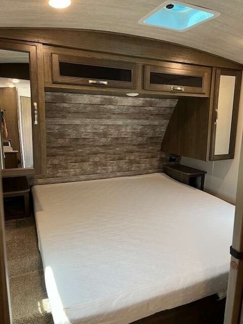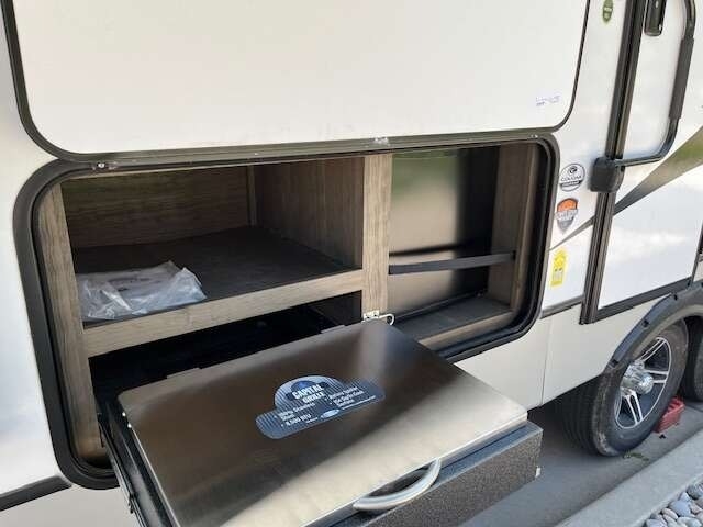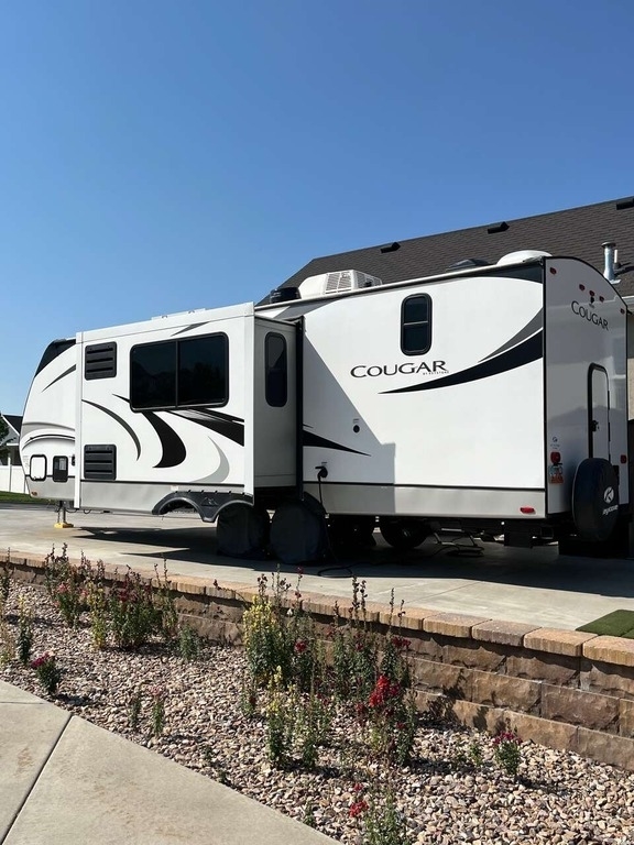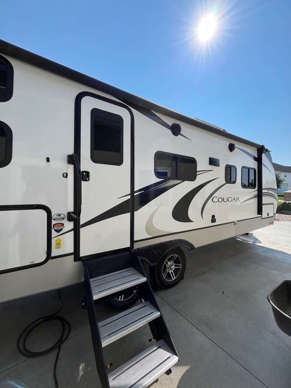 “This Coach offers comfort, craftsmanship, and all the bells and whistles to take care of your camping needs. We have owned 4 Keystone Trailers and loved them all! You will appreciate all the storage space, there's a place for everything. The shower and bathroom are so spacious. One-piece countertops and classic cabinetry, heavy duty drawers in the kitchen and under the table benches as well as a pantry offer surprising storage. Cougar Half-Ton is lightweight and easy to tow. The solar panels are huge and the inverter is amazing! The Outdoor kitchen including grill, refrigerator, and shower are so convenient. This trailer is loaded!”