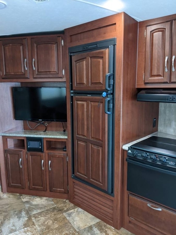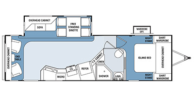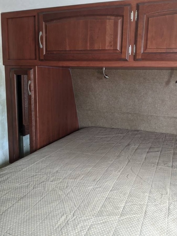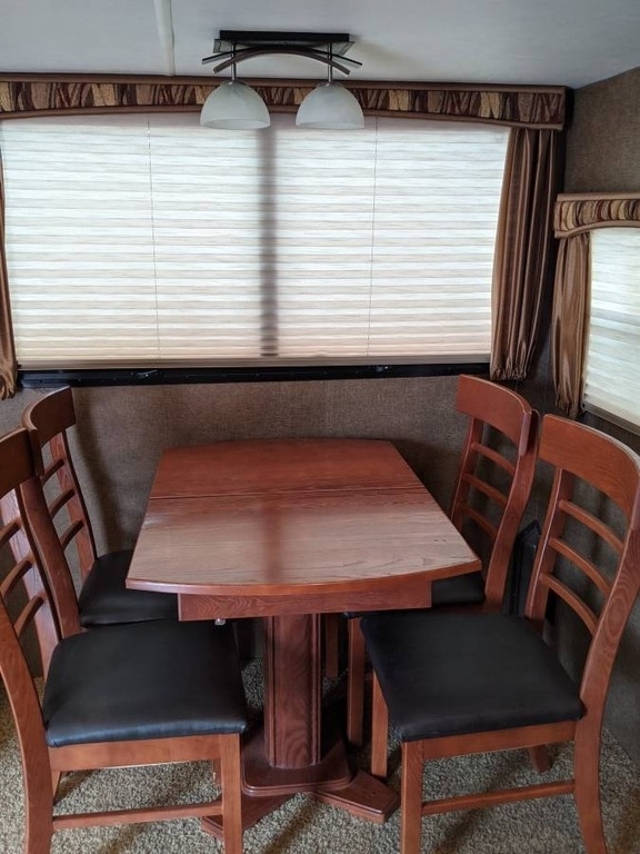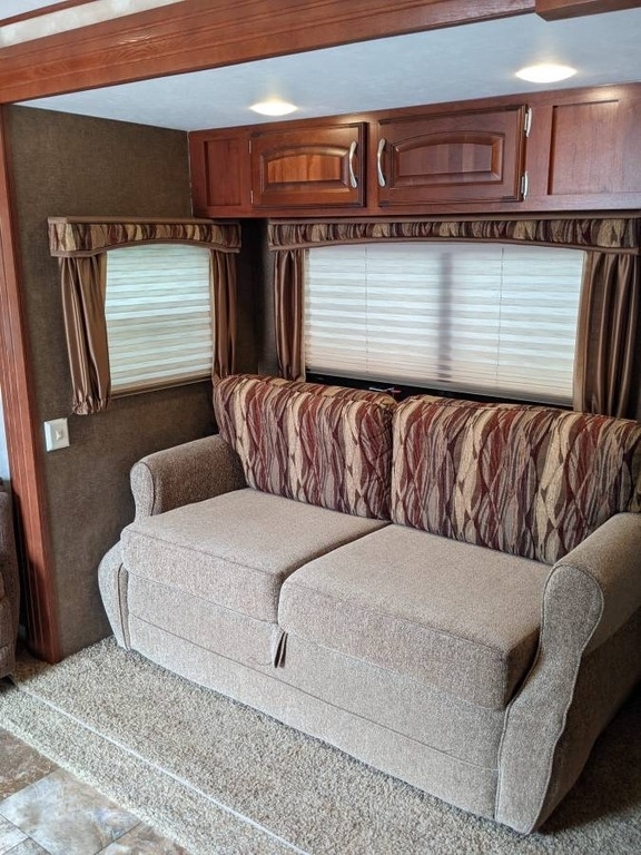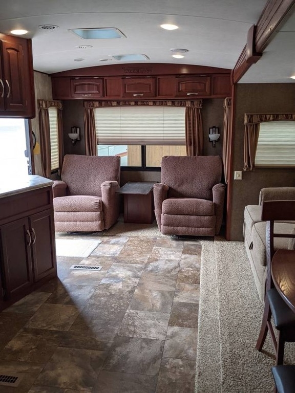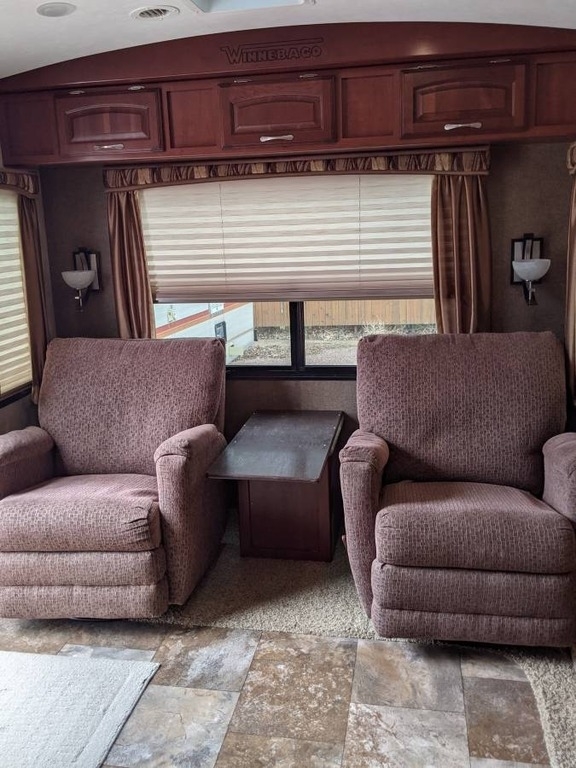 This 2014 Winnebago ONE 29RL Travel Trailer is 32.58 feet long and comes equipped with slide out, a power patio awning, two air conditioning units, and can sleep four people comfortably.