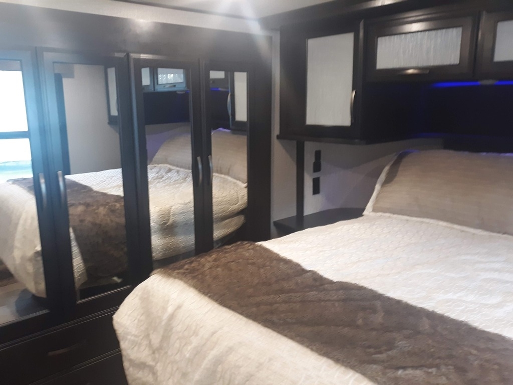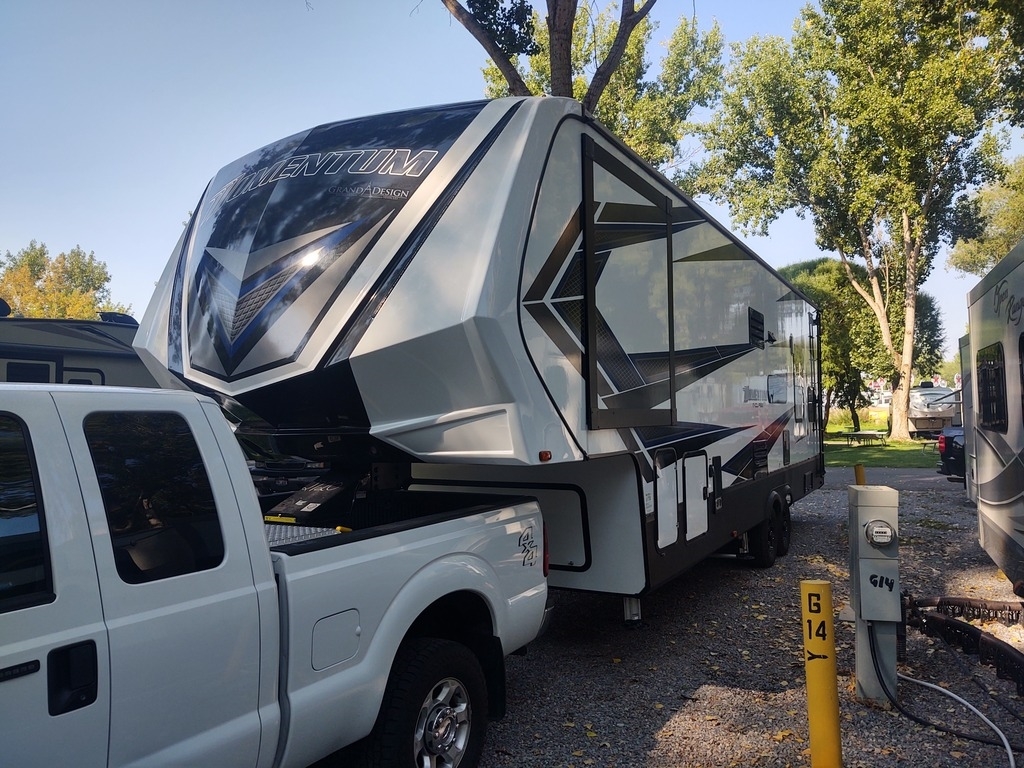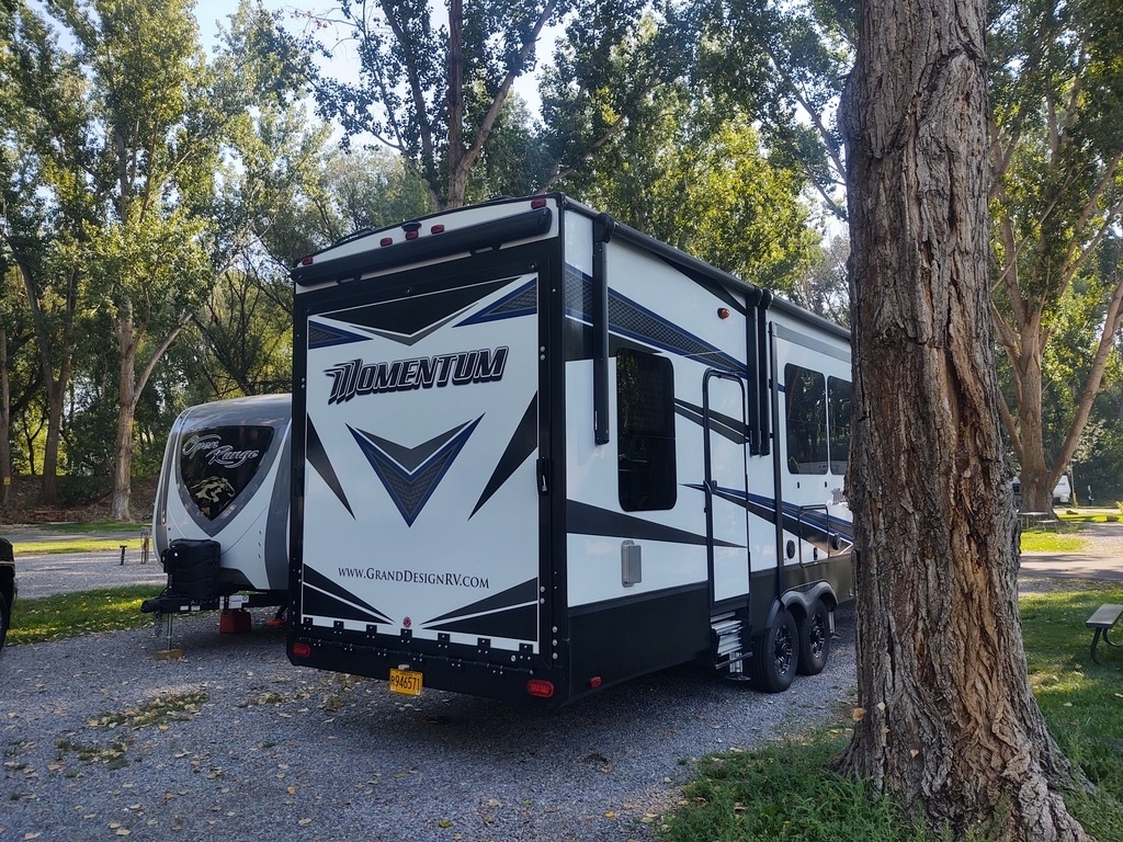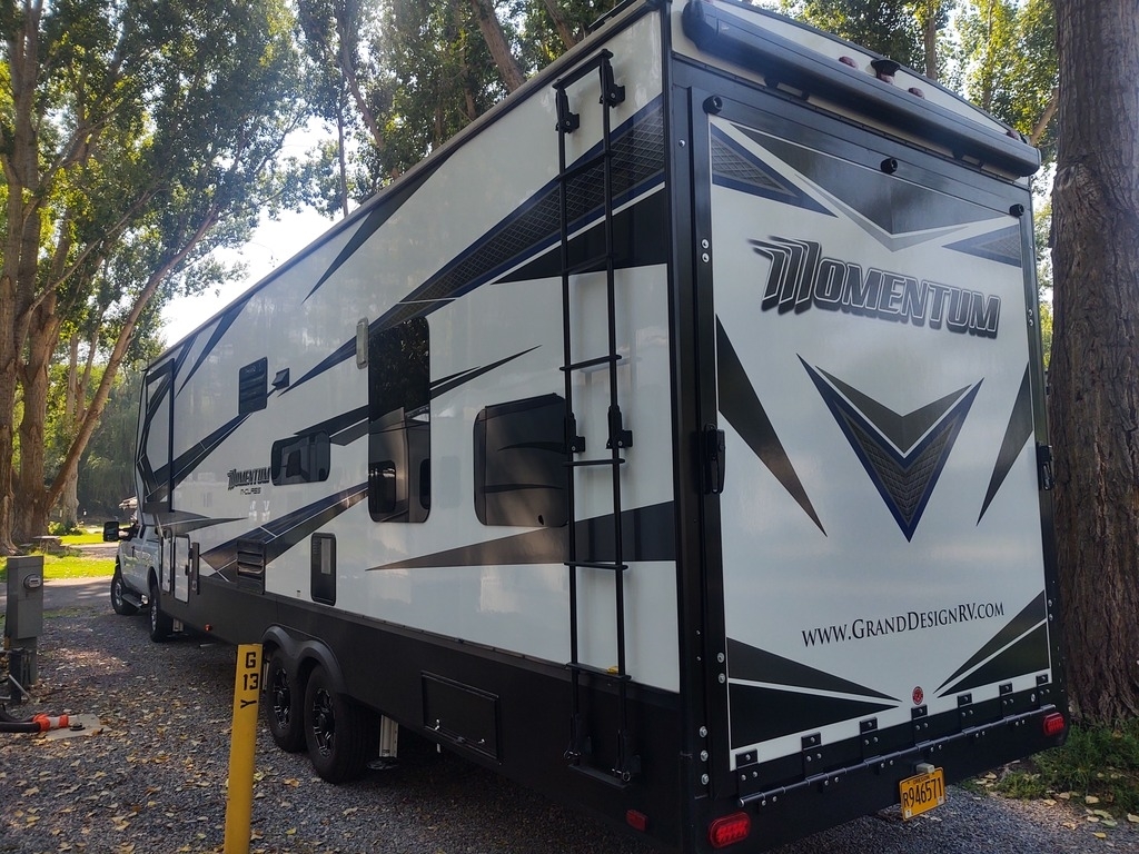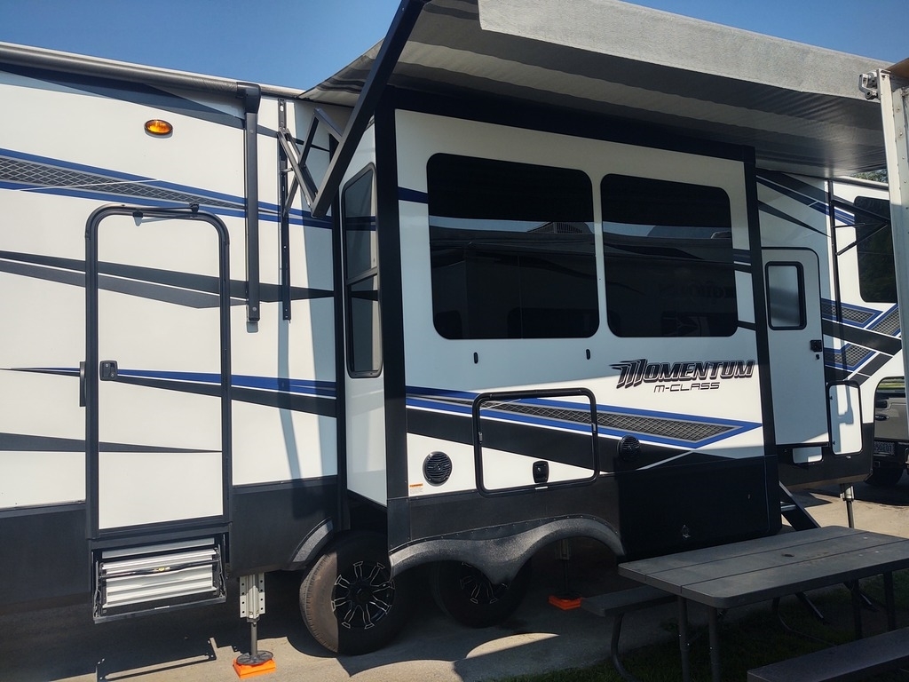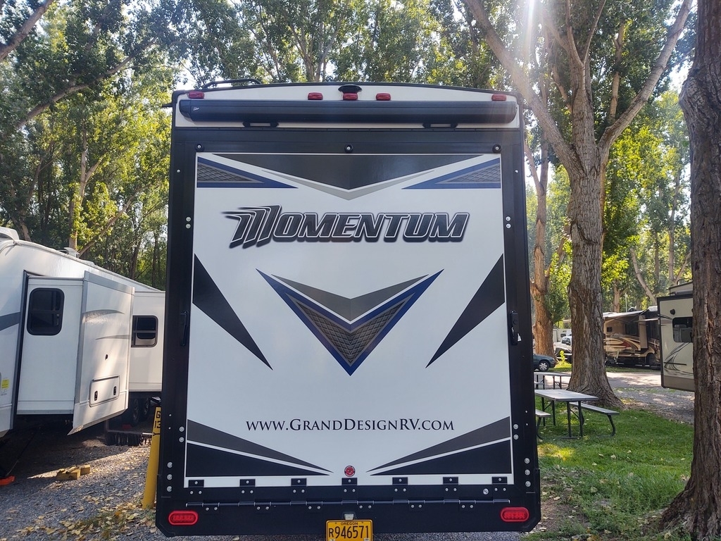 The 2019 Grand Design Momentum is 35.92 feet long with a 120 inch long Cargo Area with a 40 Gallon Auxiliary Fuel Tank. Comes equipped with an Onan 4kW Gasoline Generator, 2 Slide Outs, 3 Awnings, and 3 A/C Units. 7 people are able to sleep comfortably in this unit. This is a small one pet-friendly/non-smoking RV and there have not been any accidents or water damage.
