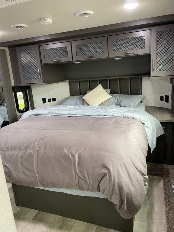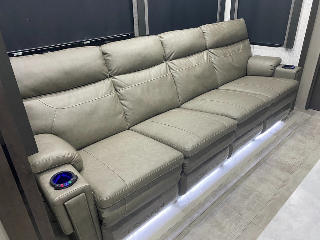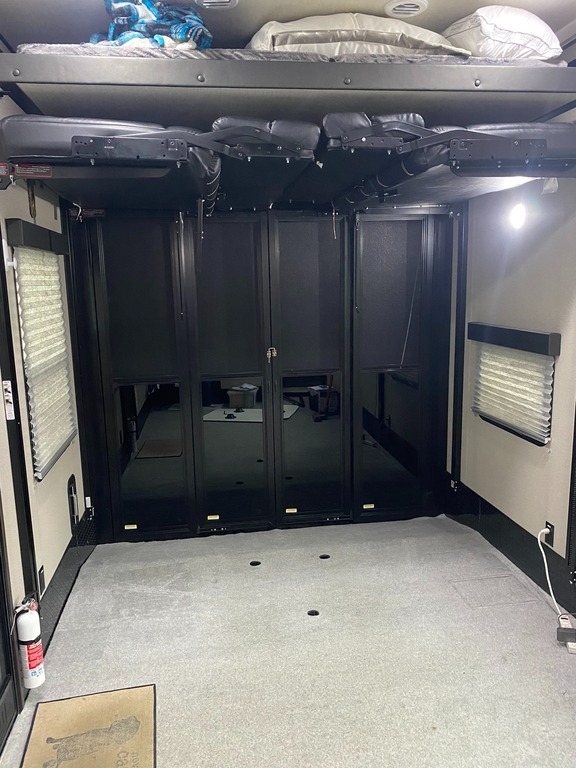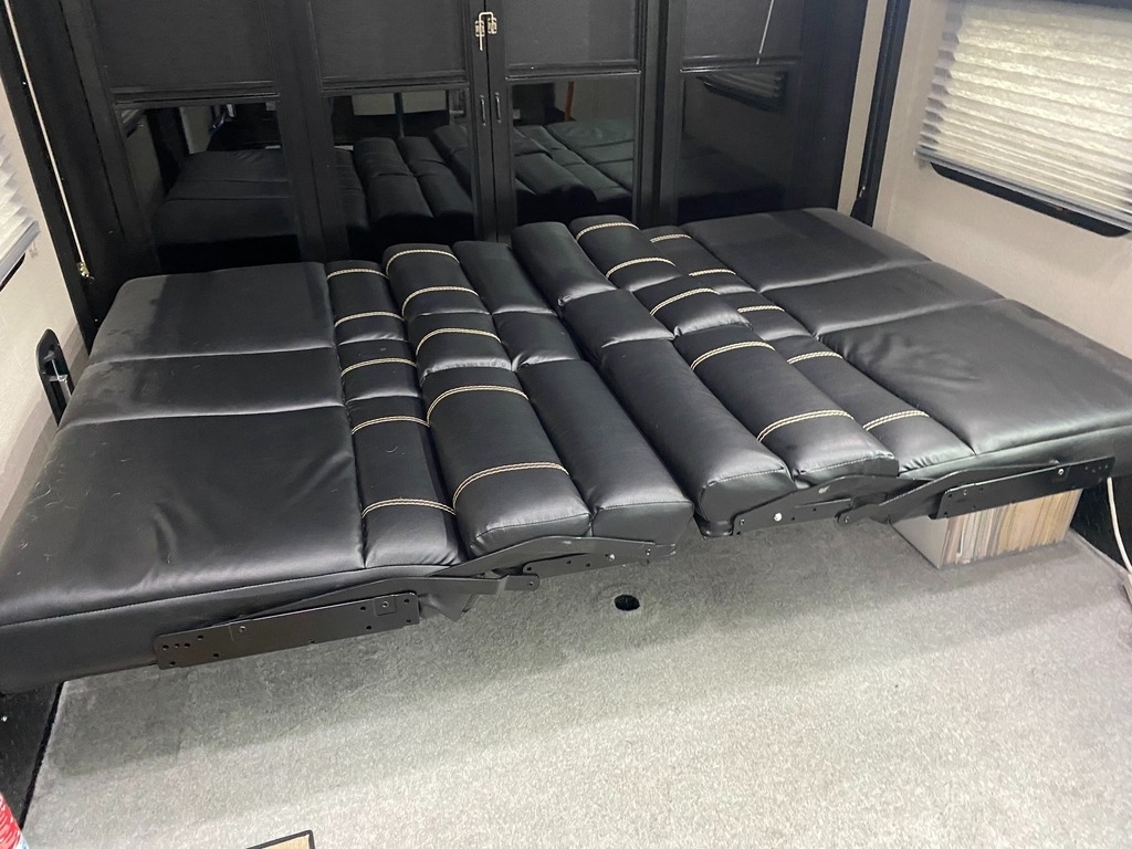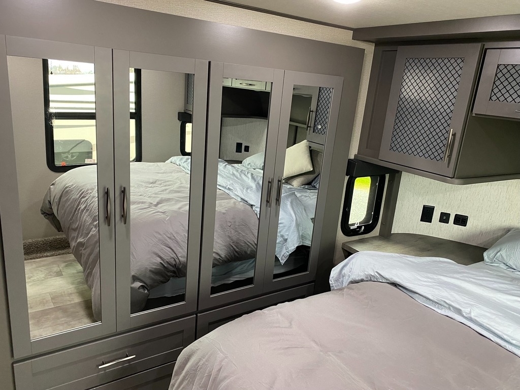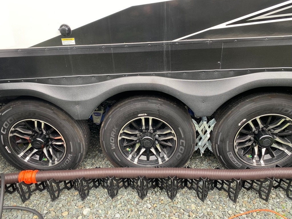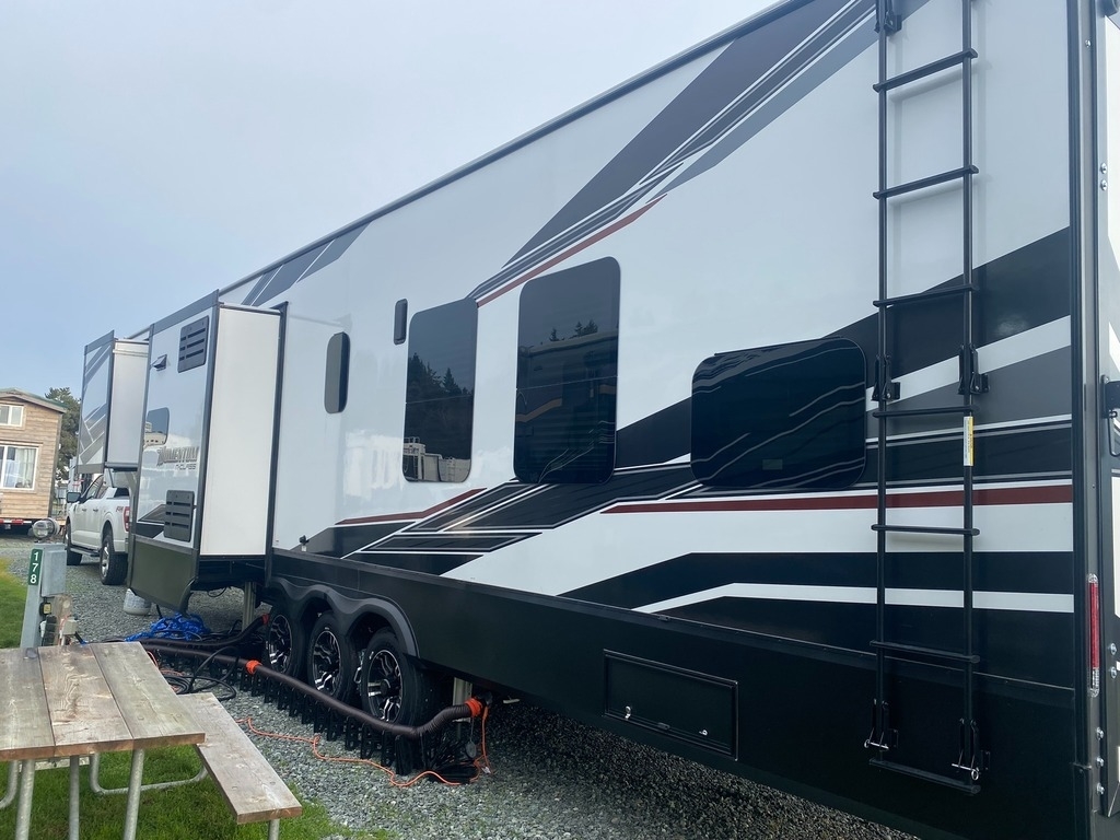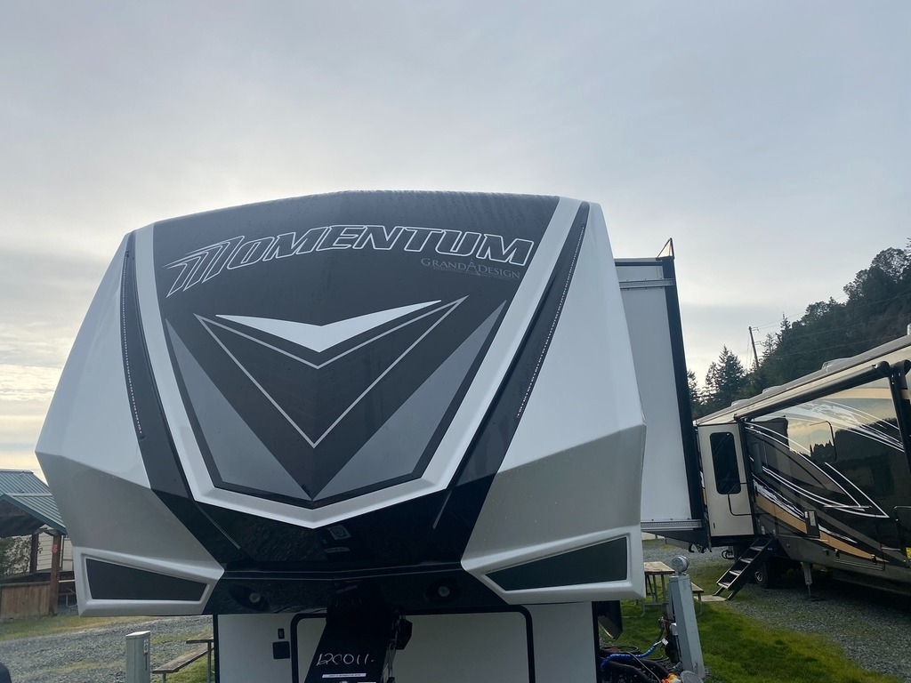 This 2021 Grand Design Momentum M-Class 381M Fifth Wheel Toy Hauler is 42.75 feet long and comes equipped with three slide-outs, three power patio awnings, and three conditioning units, and it can sleep five people comfortably.