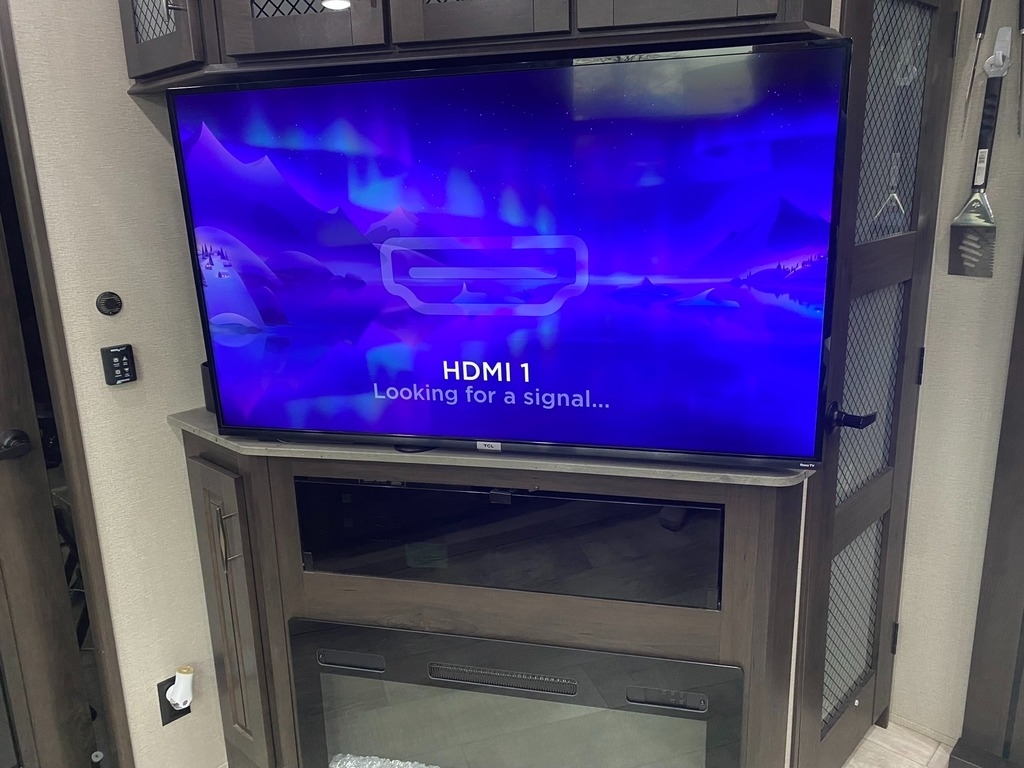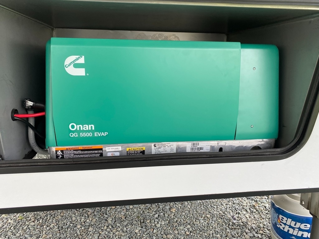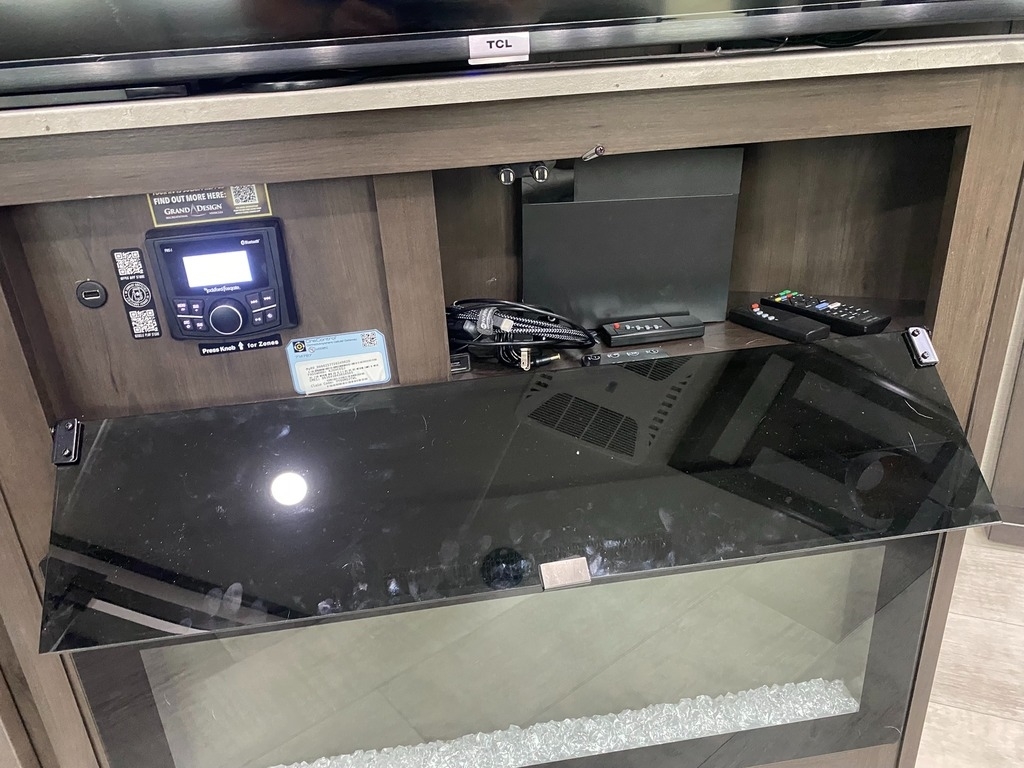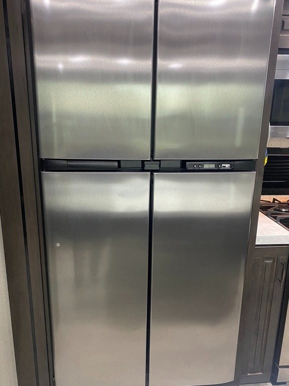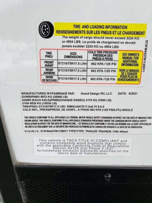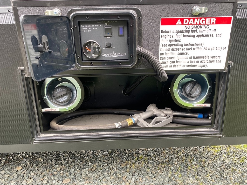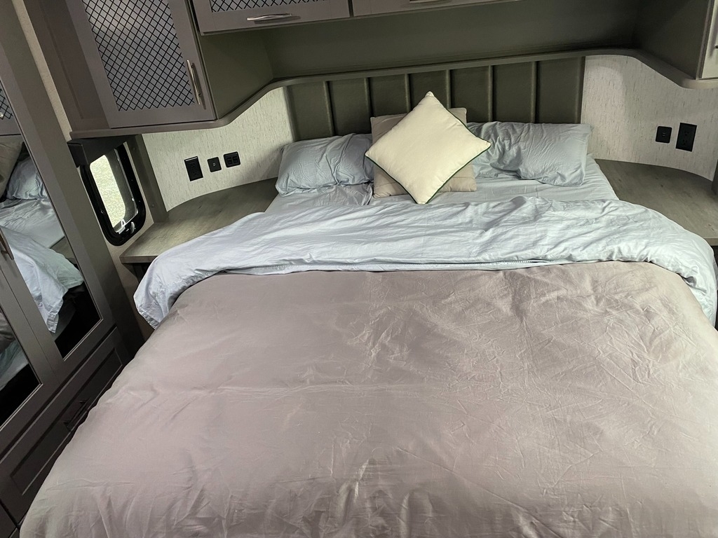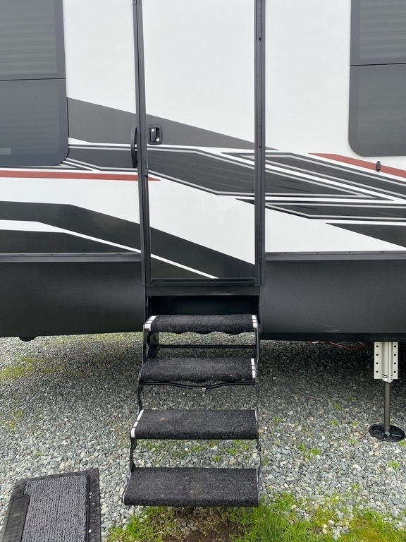 This 2021 Grand Design Momentum M-Class 381M Fifth Wheel Toy Hauler is 42.75 feet long and comes equipped with three slide-outs, three power patio awnings, and three conditioning units, and it can sleep five people comfortably.