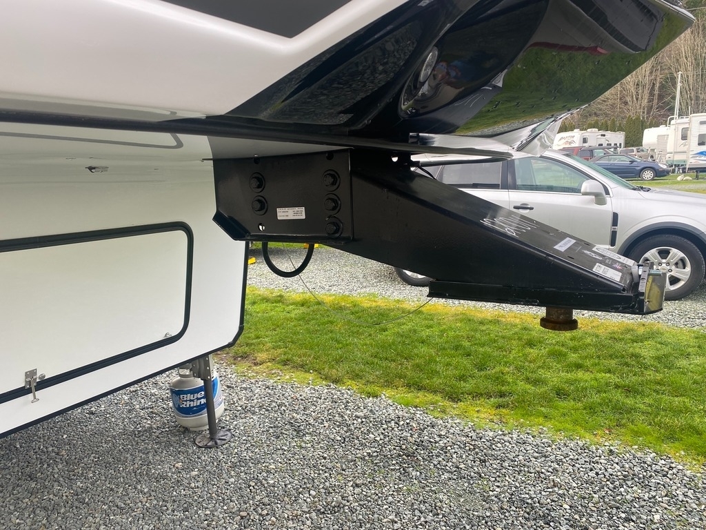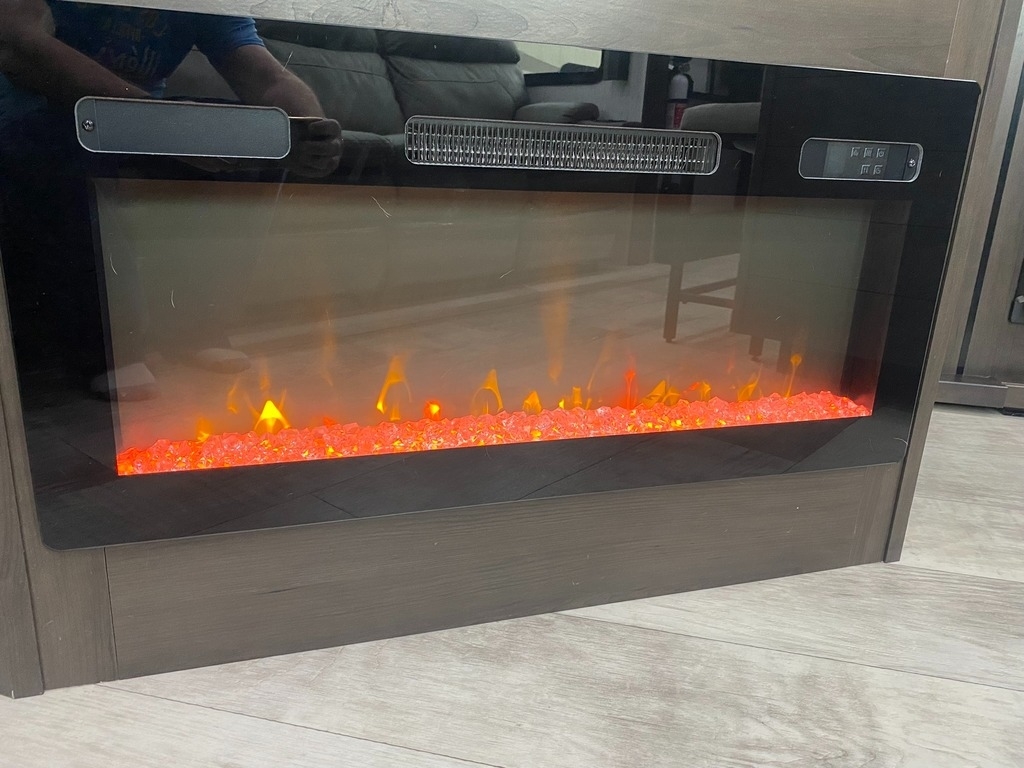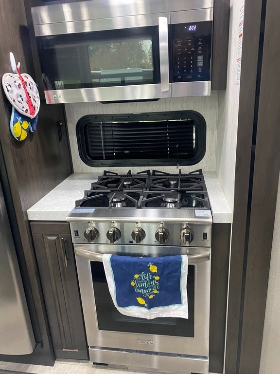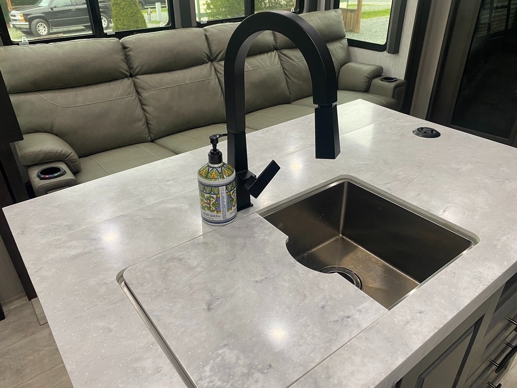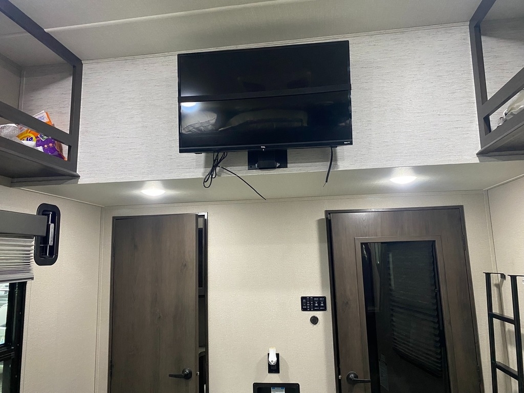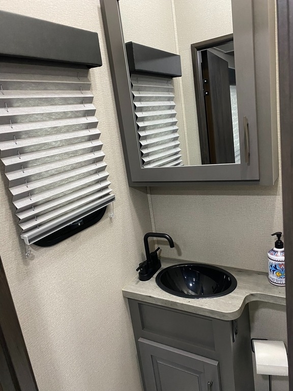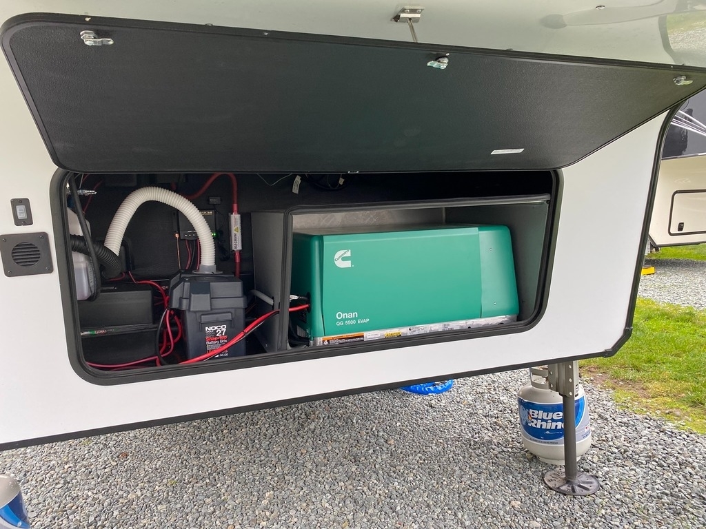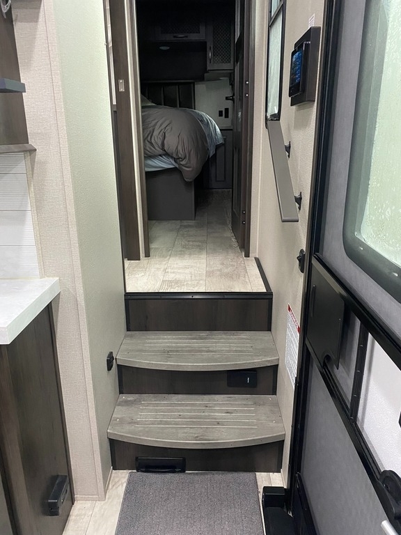 This 2021 Grand Design Momentum M-Class 381M Fifth Wheel Toy Hauler is 42.75 feet long and comes equipped with three slide-outs, three power patio awnings, and three conditioning units, and it can sleep five people comfortably.