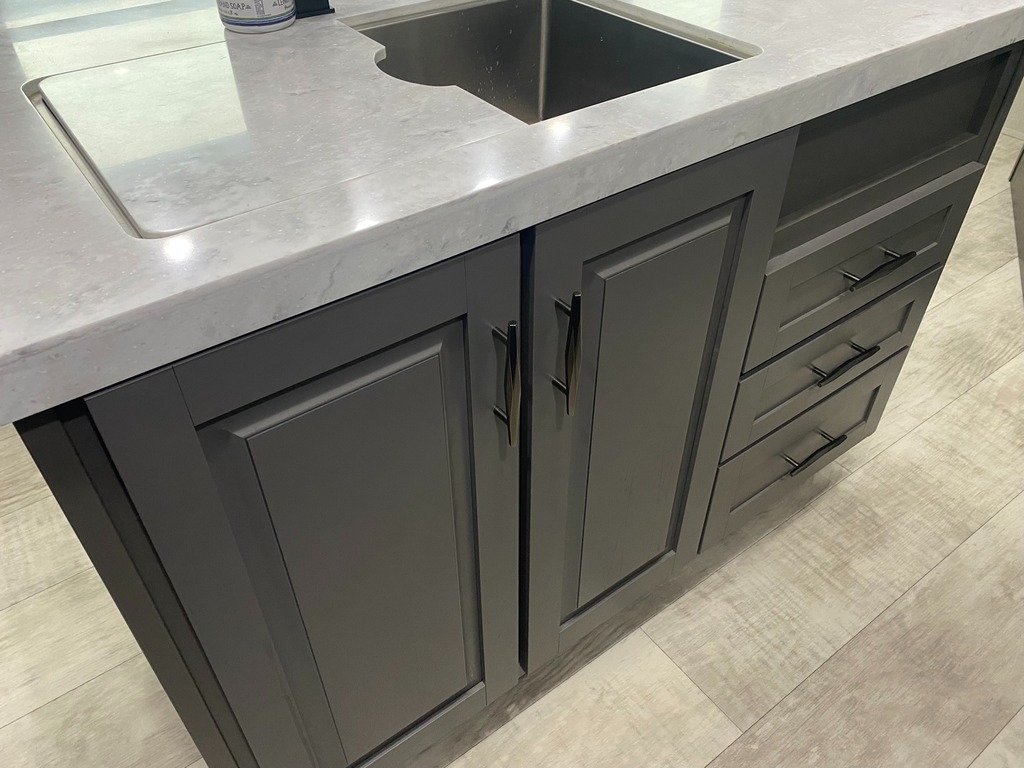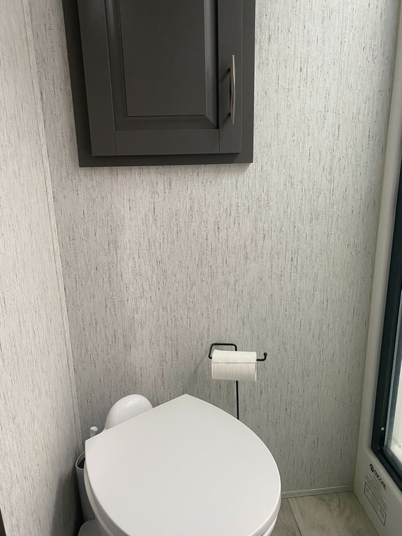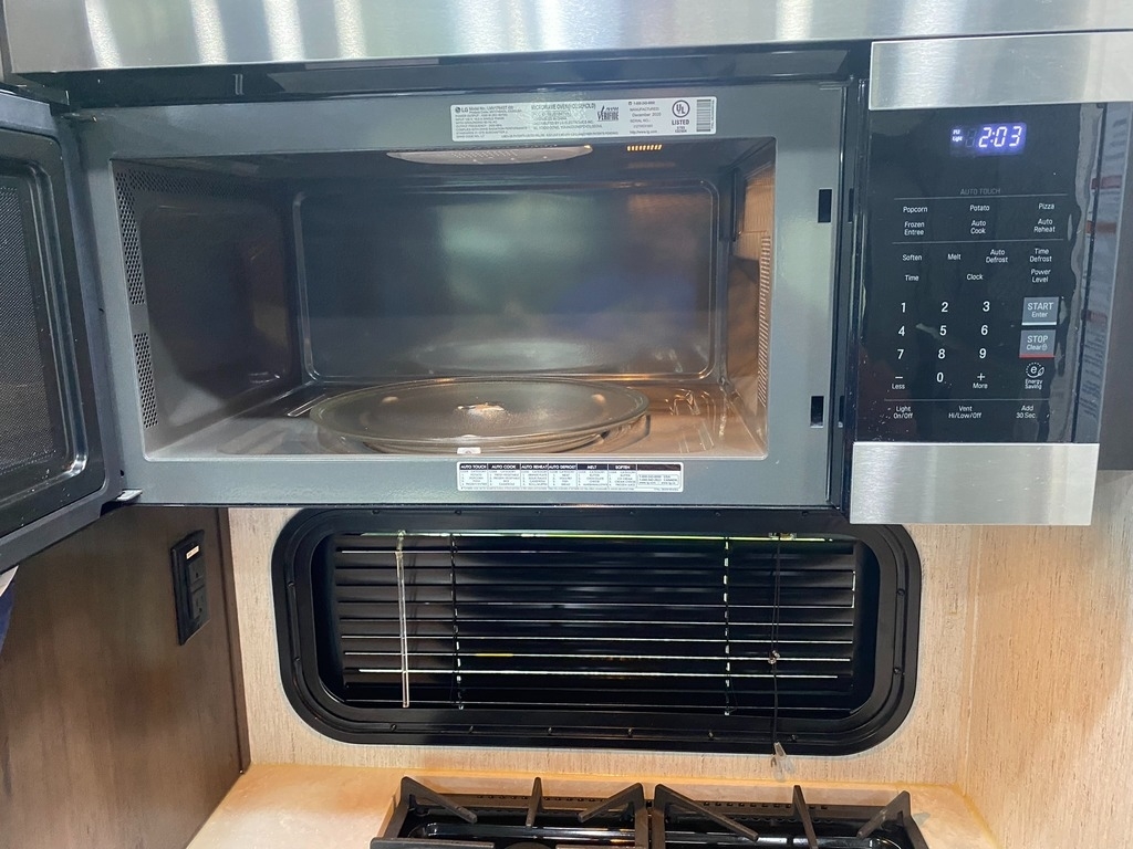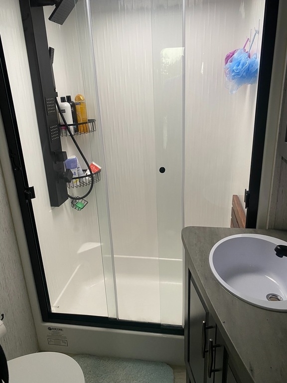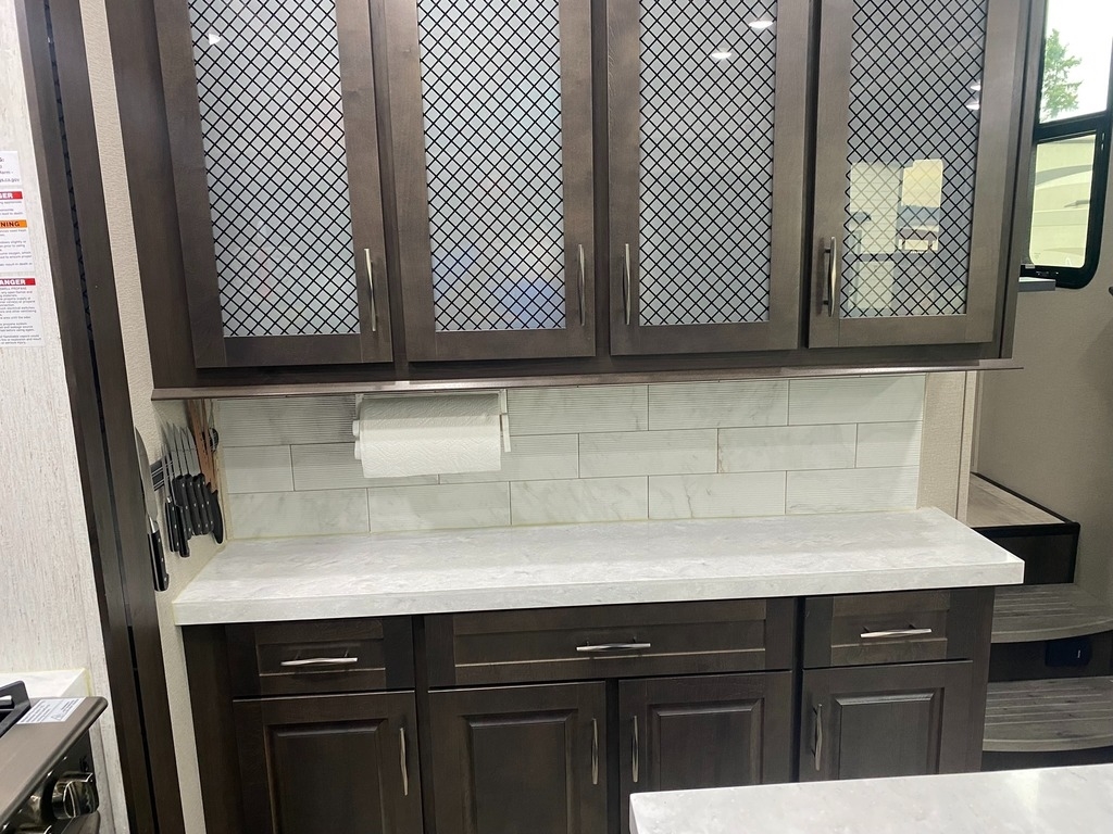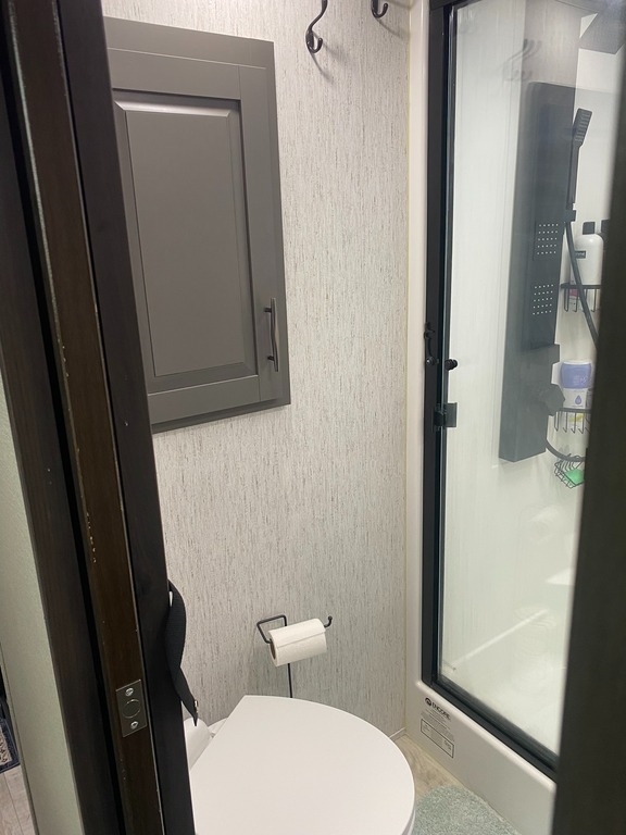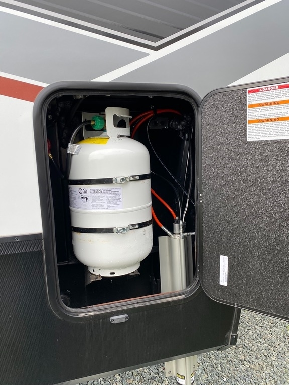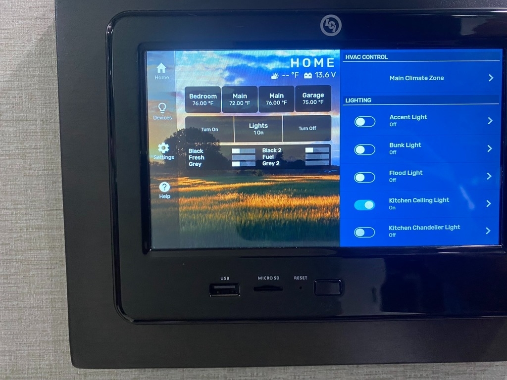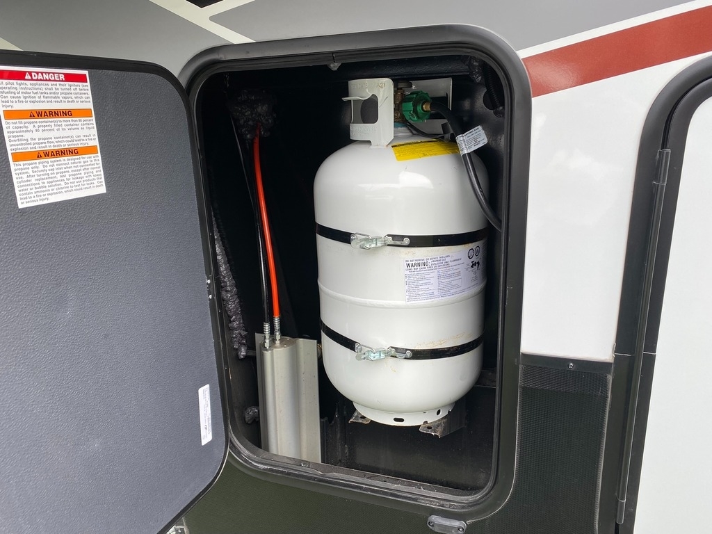 This 2021 Grand Design Momentum M-Class 381M Fifth Wheel Toy Hauler is 42.75 feet long and comes equipped with three slide-outs, three power patio awnings, and three conditioning units, and it can sleep five people comfortably.