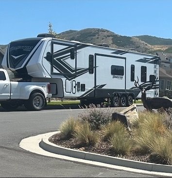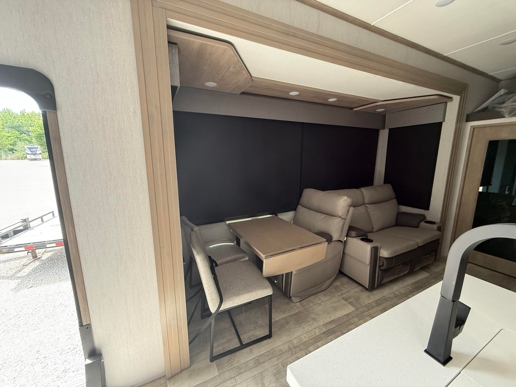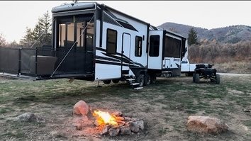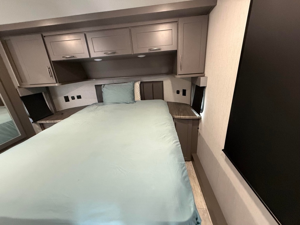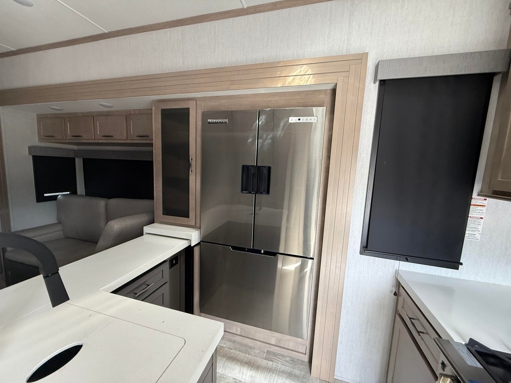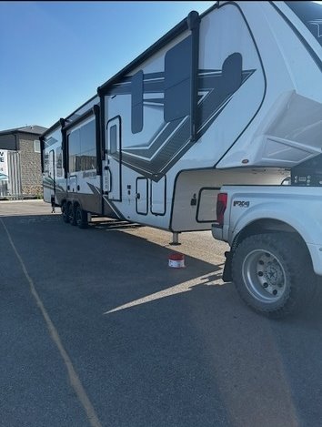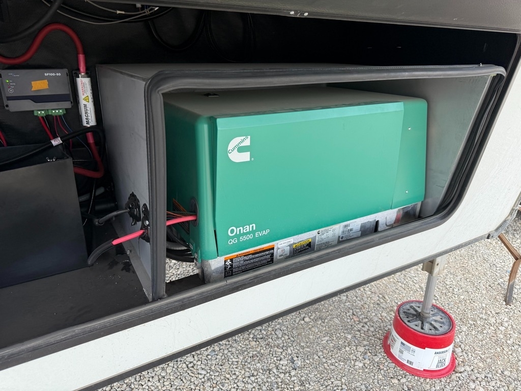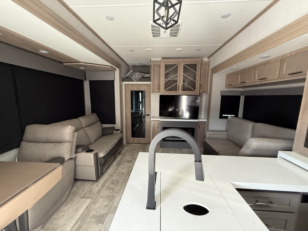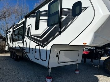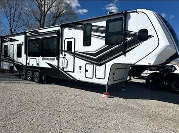 This Grand Design has an overall length of 45.83 feet and comes equipped with 3 power retractable slide-outs, 3 power retractable awnings, 3 A/C units, a 14-foot garage, and room to sleep up to 9. This unit has been well-maintained.