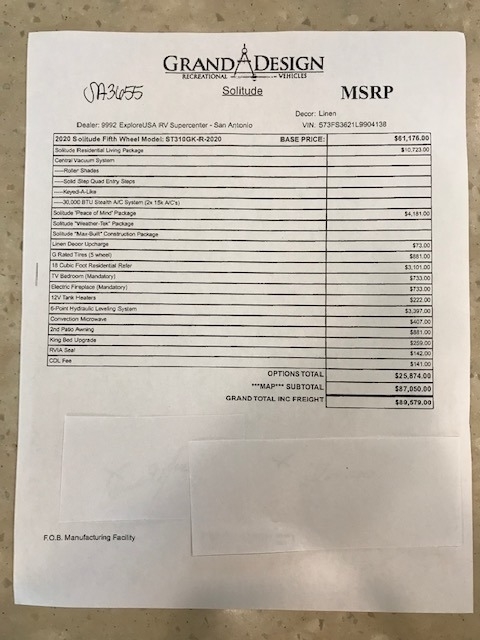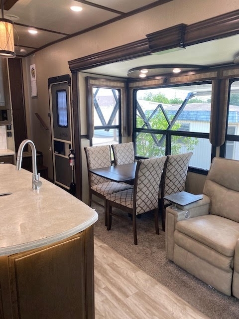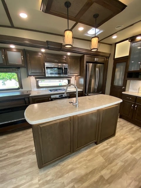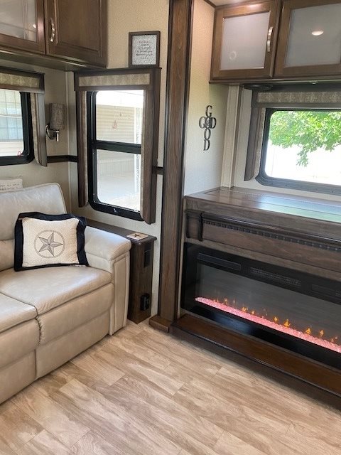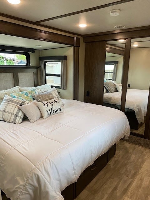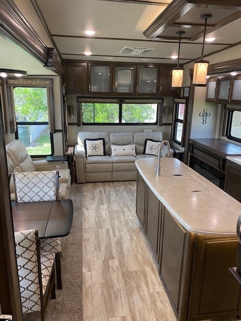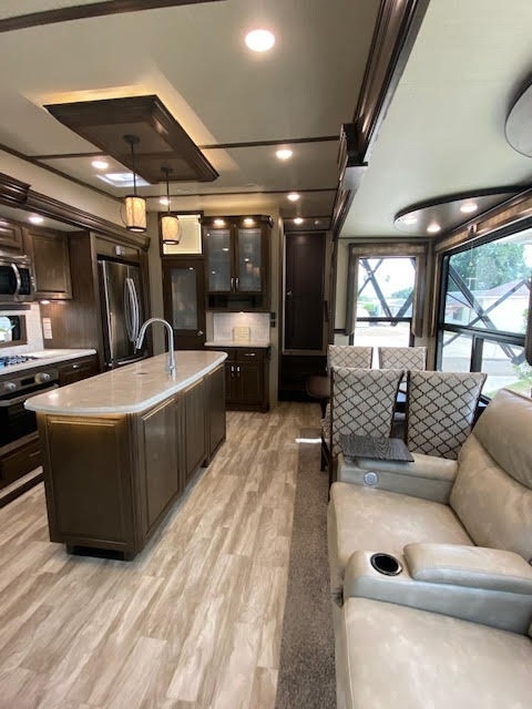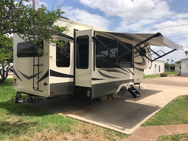 This 2020 Grand Design has an overall length of 34 feet and comes equipped with 3 Slide Outs, 2 Awnings, 2 A/C units, and plenty of room to sleep 4.