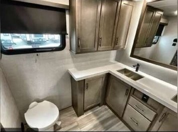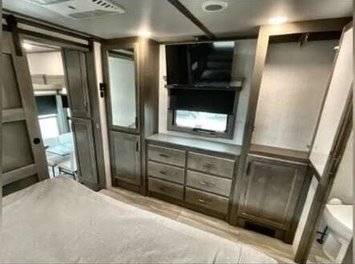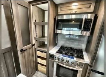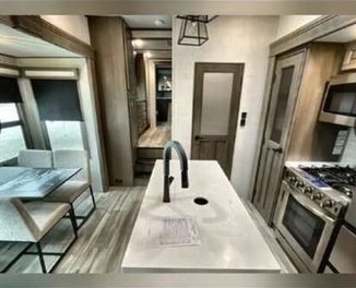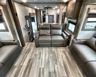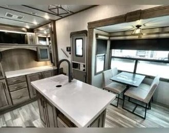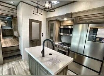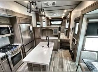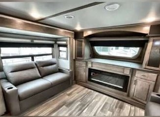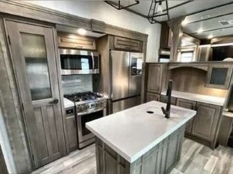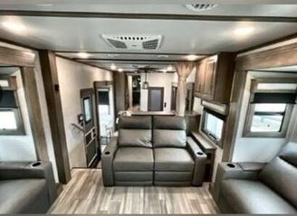 “Solitude is the most spacious Extended Stay Fifth Wheel ever built! This super clean, only used for 6 long weekend trips, 2022 Solitude 380FL has 5 slide-outs, a newly added king-size bed, and 2 pullout sofa beds. Front living area with heated/massaging recliners, fireplace, and elevating smart TV. Gourmet kitchen with island, large refrigerator, and pantry. Huge bathroom with dual vanity sinks and large walk-in shower. We added a washer/dryer, generator, tankless hot water heater (endless), solar panels, slide toppers, and Dish network Wally for both TVs.”