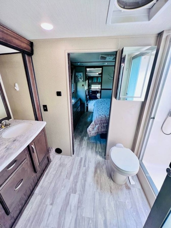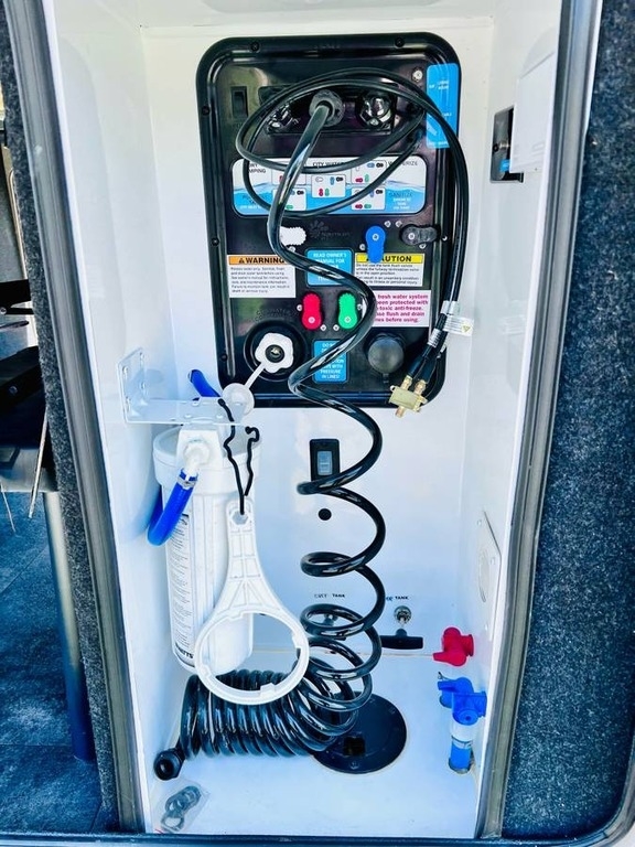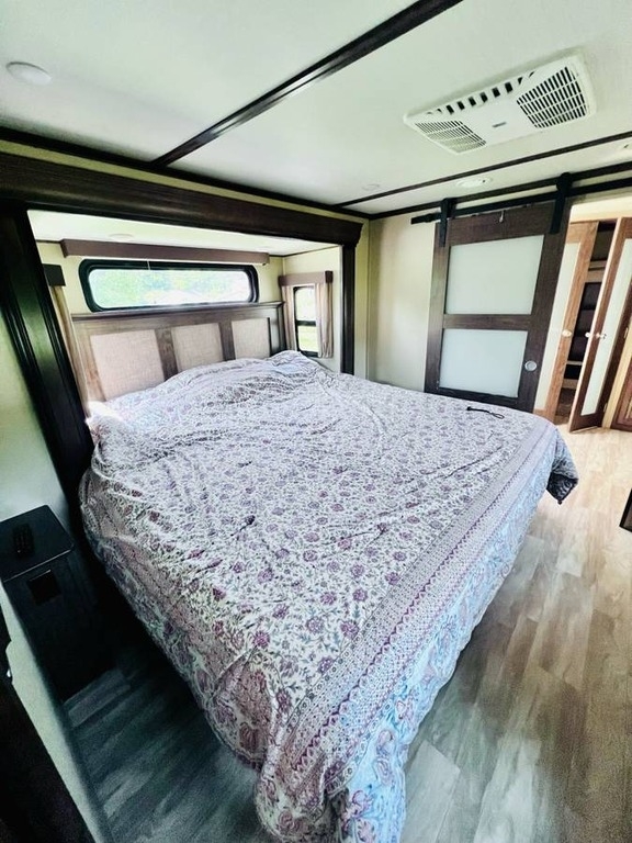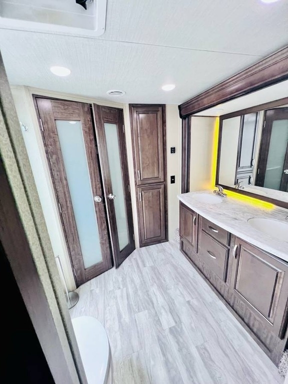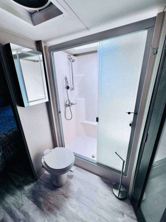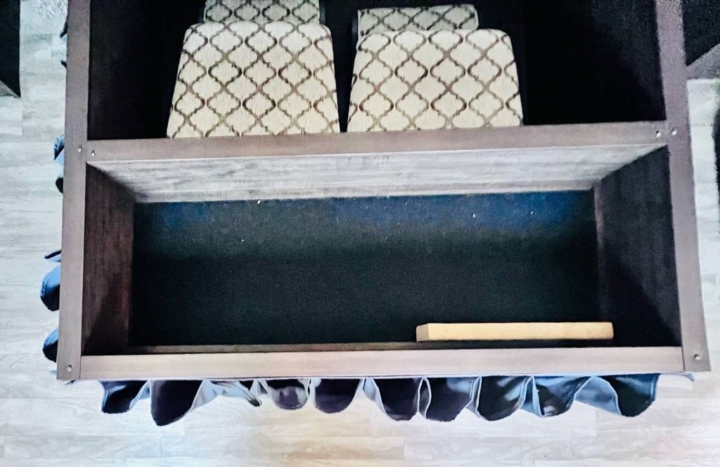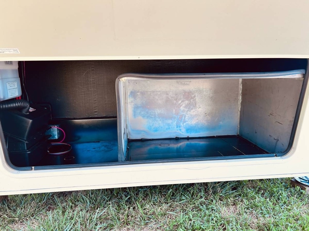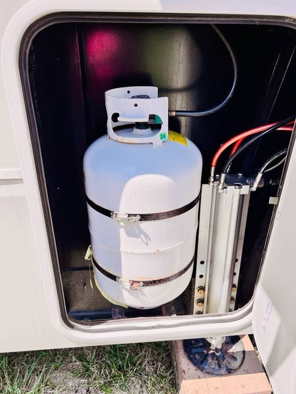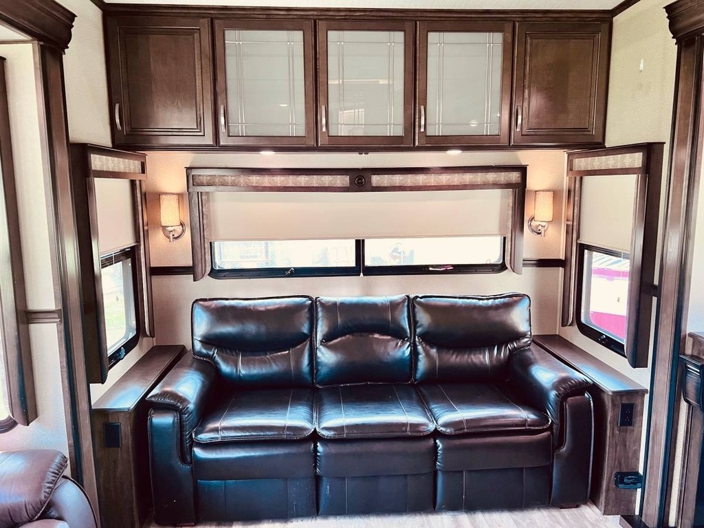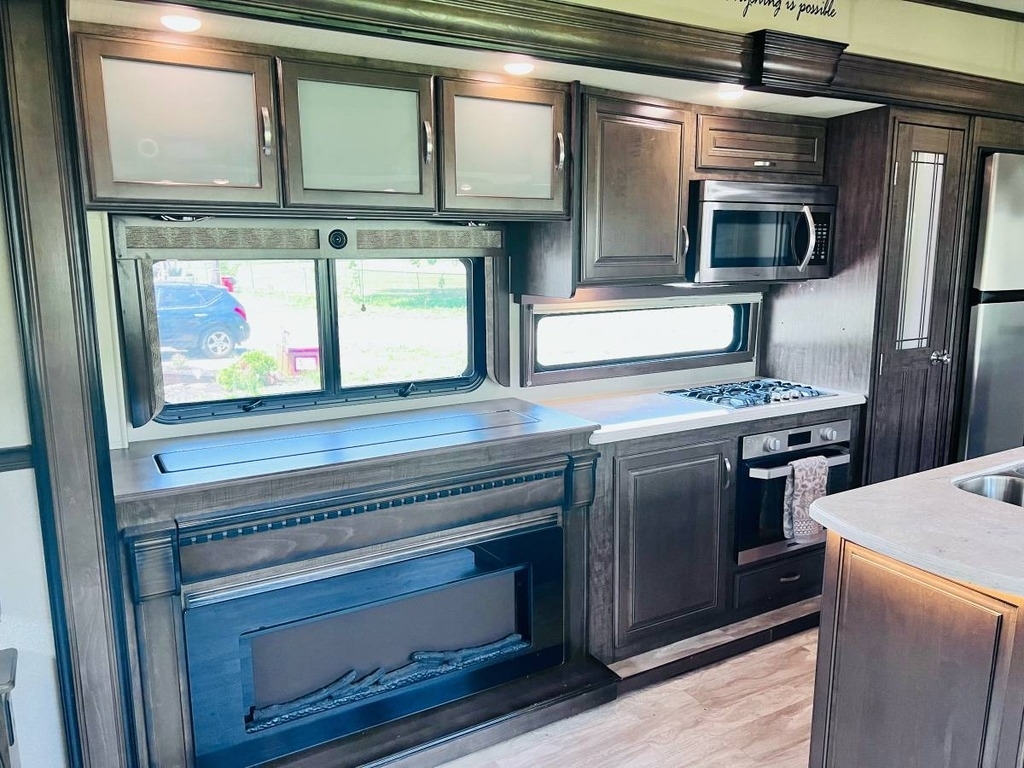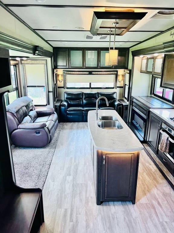 “This gorgeous 2018 Grand Design Solitude 373FB-R Arctic Package 43’ (13,500 lbs) fifth wheel is designed for extended stays or permanent living. It offers a beautiful kitchen with stainless steel appliances, solid surface countertops, ample storage space, lots of lighting, a fireplace, indoor/outdoor sound system, large slide up TV, walk-in closet, washer/dryer/dishwasher hookups and two bathrooms. I strictly used this for permanent living. It has been a wonderful home and the reason for selling is I have moved into another home. You’ll notice the kitchen table is not pictured, I removed it for extra space. I do have it with the 4 chairs. The print of the fabric on the chairs is pictured showing under the bed storage. You’ll notice the large awning is missing, this was due to our last unexpected snow storm. I have not replaced because I wanted the new purchaser to decide if they would prefer the one that was on it (vinyl, which I do have) or a canvas one.”