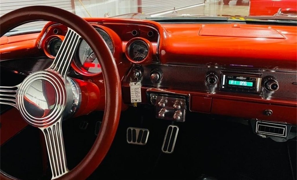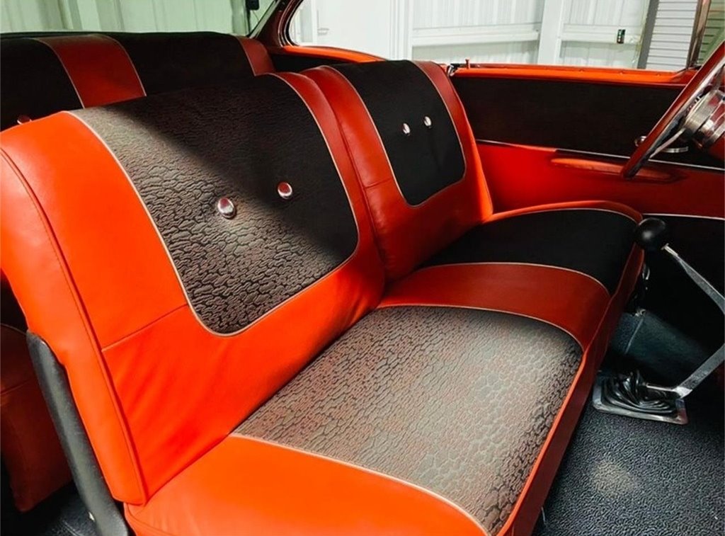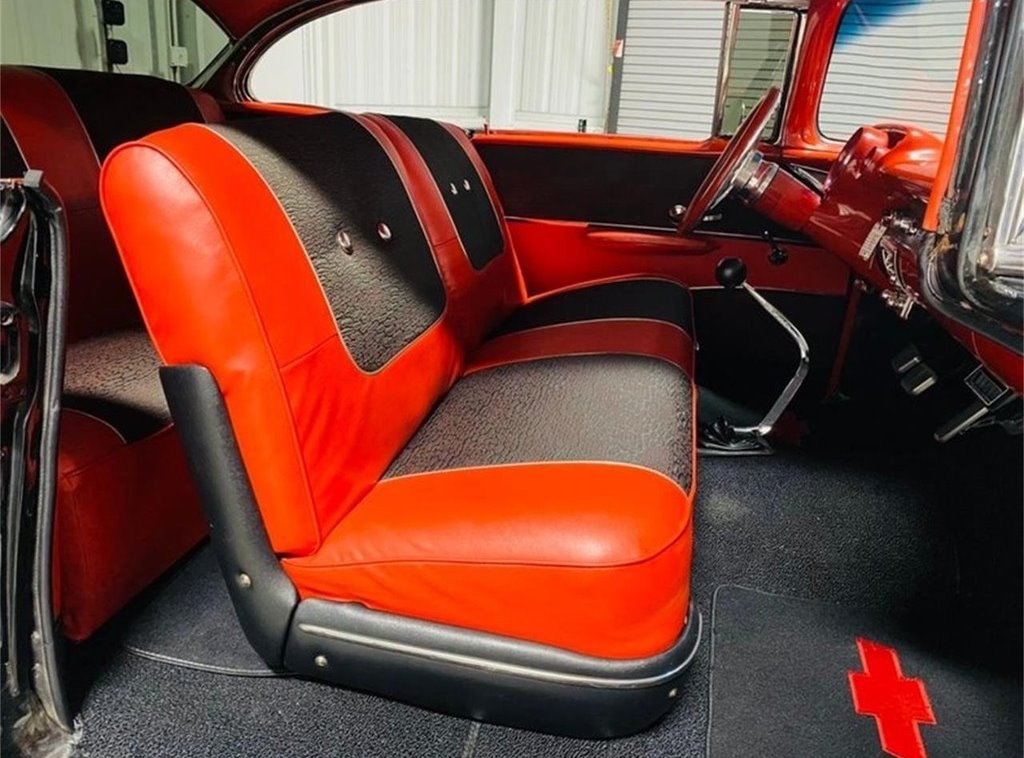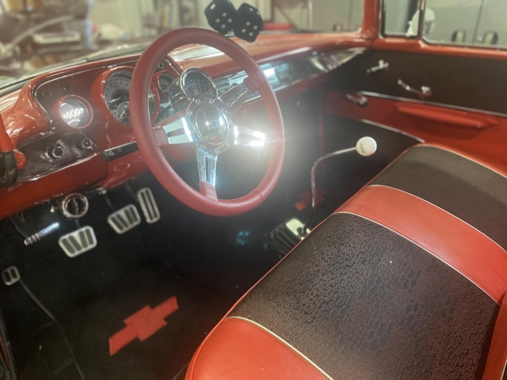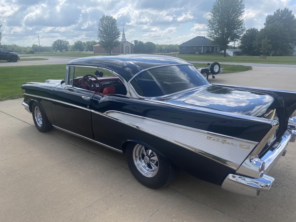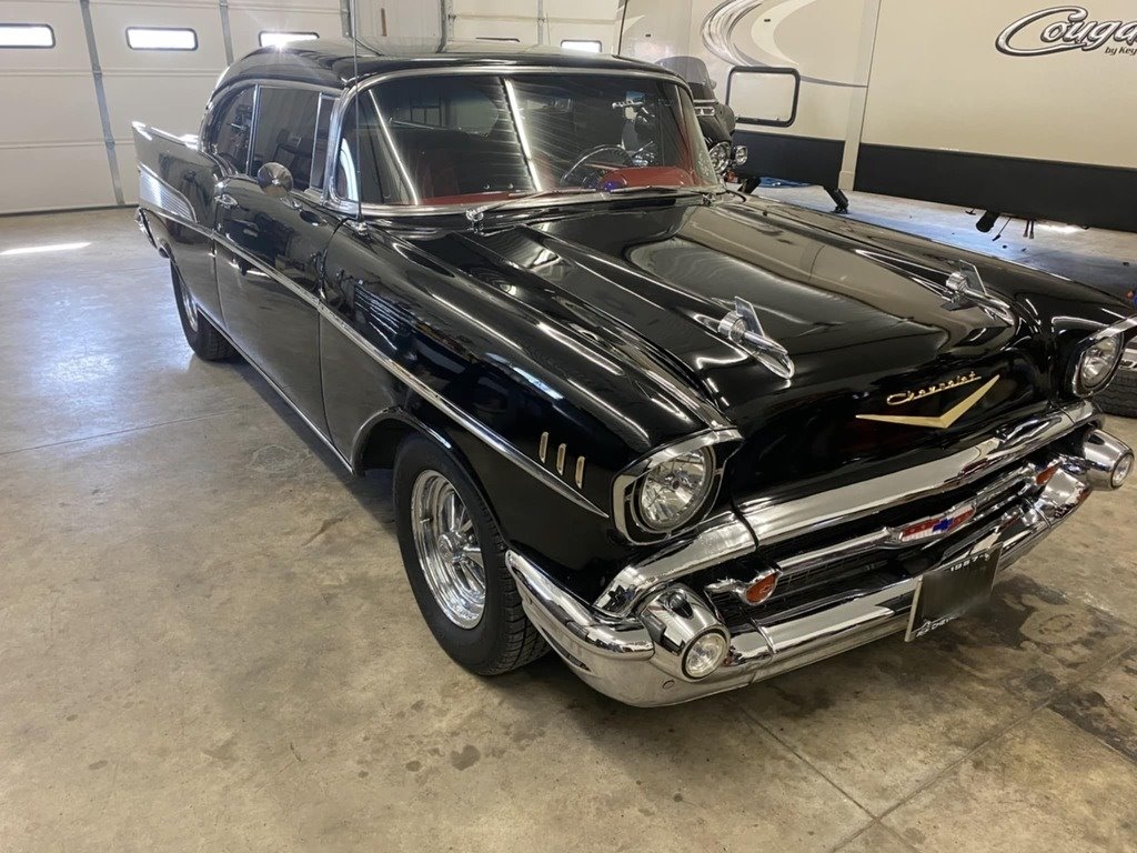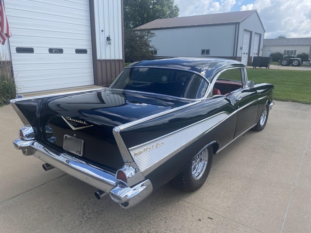 “This stunning 1957 Chevrolet  Bel Air 2-Door Hardtop is the perfect blend of iconic classic style and modern  performance. Finished in excellent black paint with a sharp red interior, this  car is a true head-turner that’s built to drive—not sit on a trailer. It’s  powered by a 350 Fast Burn crate engine producing 385 horsepower, paired with a  Tremec 5-speed manual transmission with overdrive. At 70 miles per hour, the  engine cruises at just 2000 RPM, making it an ideal choice for comfortable  highway driving. The car is equipped with power front  disc brakes, a fully refreshed front suspension with new components, excellent  tires, tilt steering, cruise control, and cold air conditioning—features that  make it as enjoyable to drive as it is to look at. The interior is in  outstanding condition, offering a clean and comfortable space that complements  the car’s show-quality exterior. This Bel Air runs and drives beautifully, and  you can take it anywhere with confidence. It also comes with a new set of extra  tires. It’s not a trailer queen—it’s a fully sorted, turn-key classic you’ll be  proud to own and drive.”