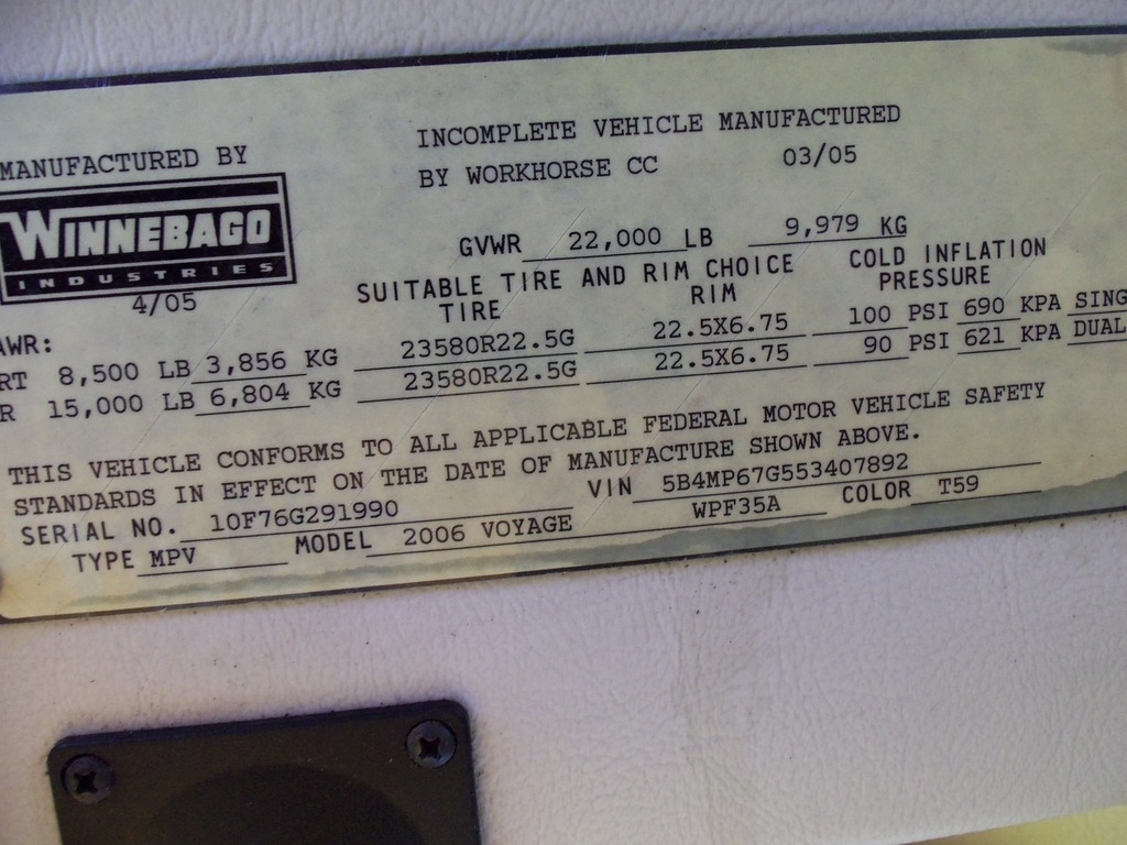 This 2006 Winnebago Voyage 35A is powered by a Workhorse 8.1L Vortec V8 340HP Gasoline Engine paired with an Allison Automatic Transmission, with 60,381 miles. The overall length is 35’6” and is equipped with 3 Slide Outs, 1 Awning, Central AC and a Furnace, an Onan 5.5 kW Generator, and room to Sleep 6. This is a non-pet/non-smoking RV and there has not been any water damage.