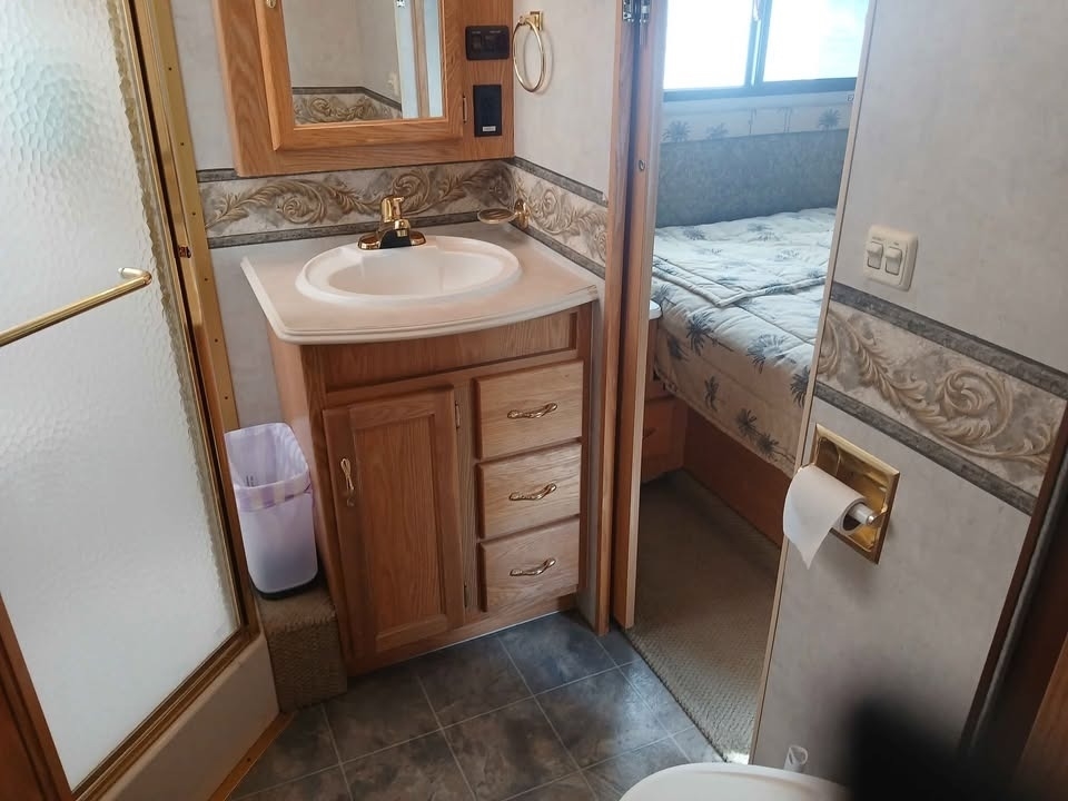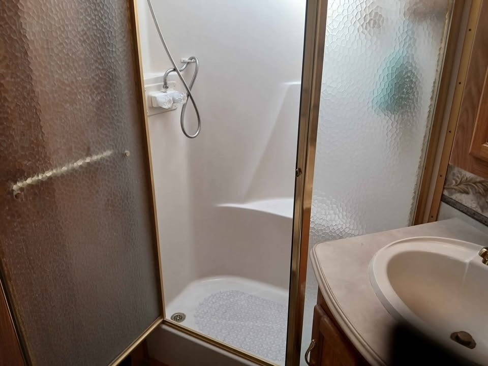 bathroom with a full-size corner shower—comfortably sleeping up to 4. The coach