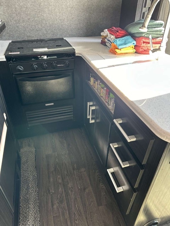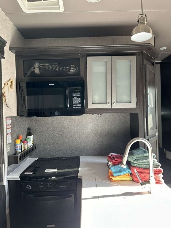 kitchen/living area includes amenities such as an oven/stove, microwave oven,