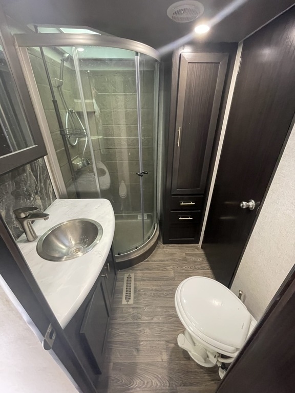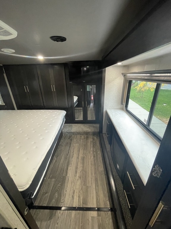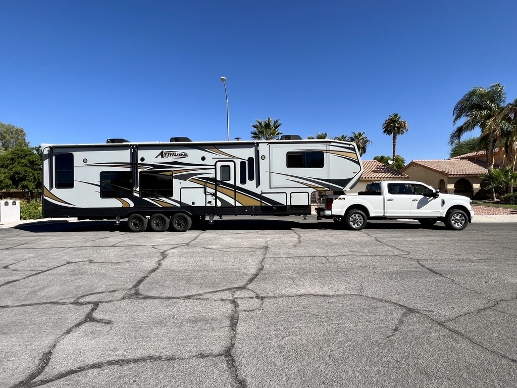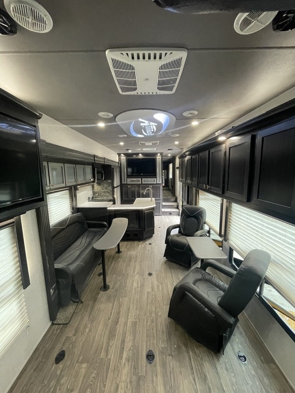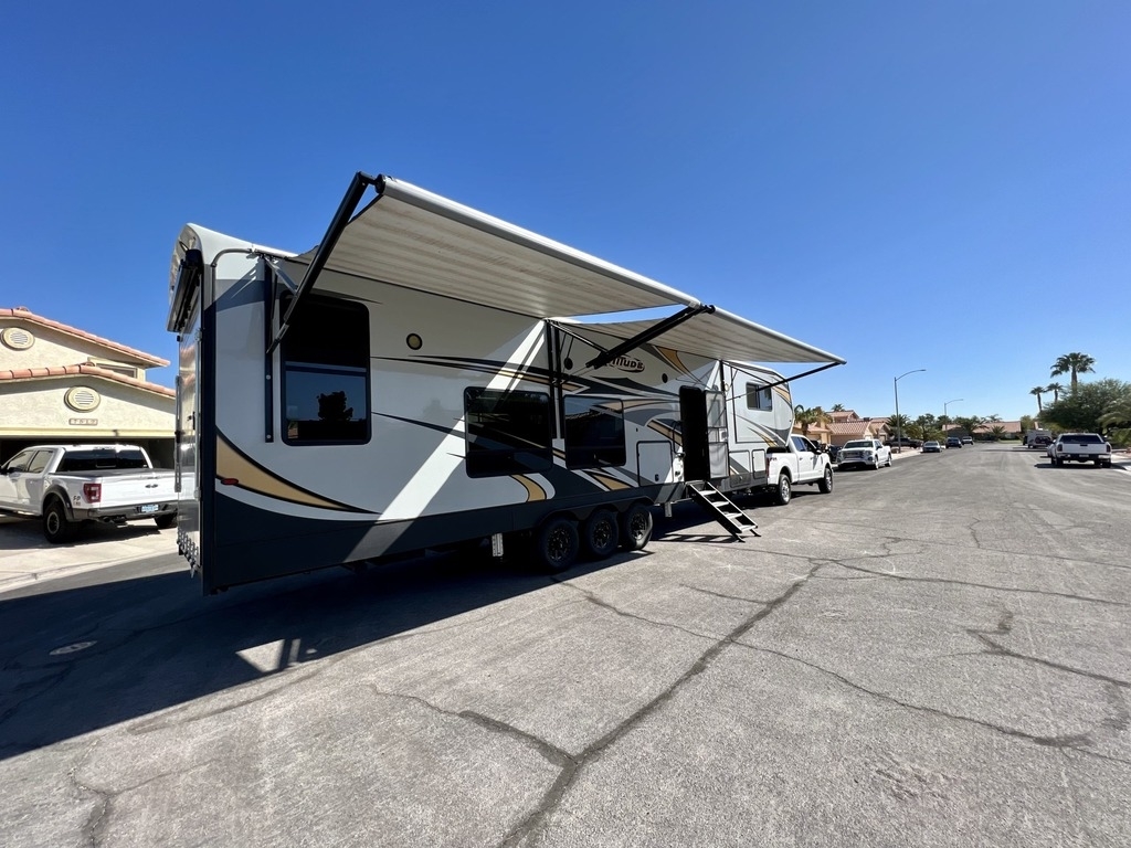 38.83 feet long and comes equipped with three slide outs, a power patio awning,