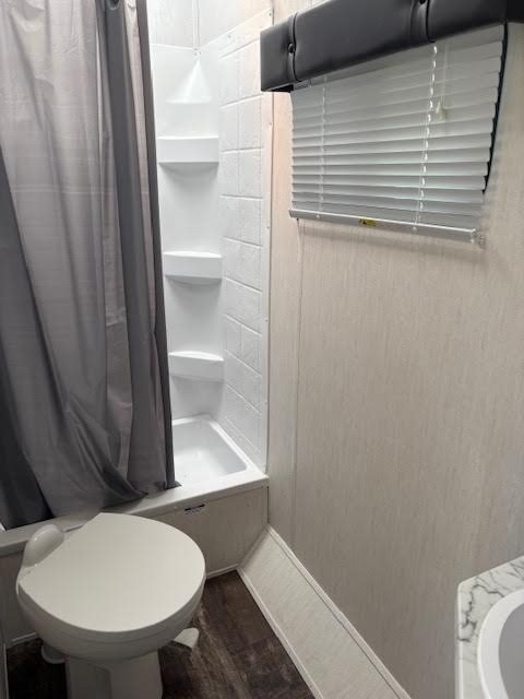 bathroom with porcelain toilet, shower with curtain, vanity, and